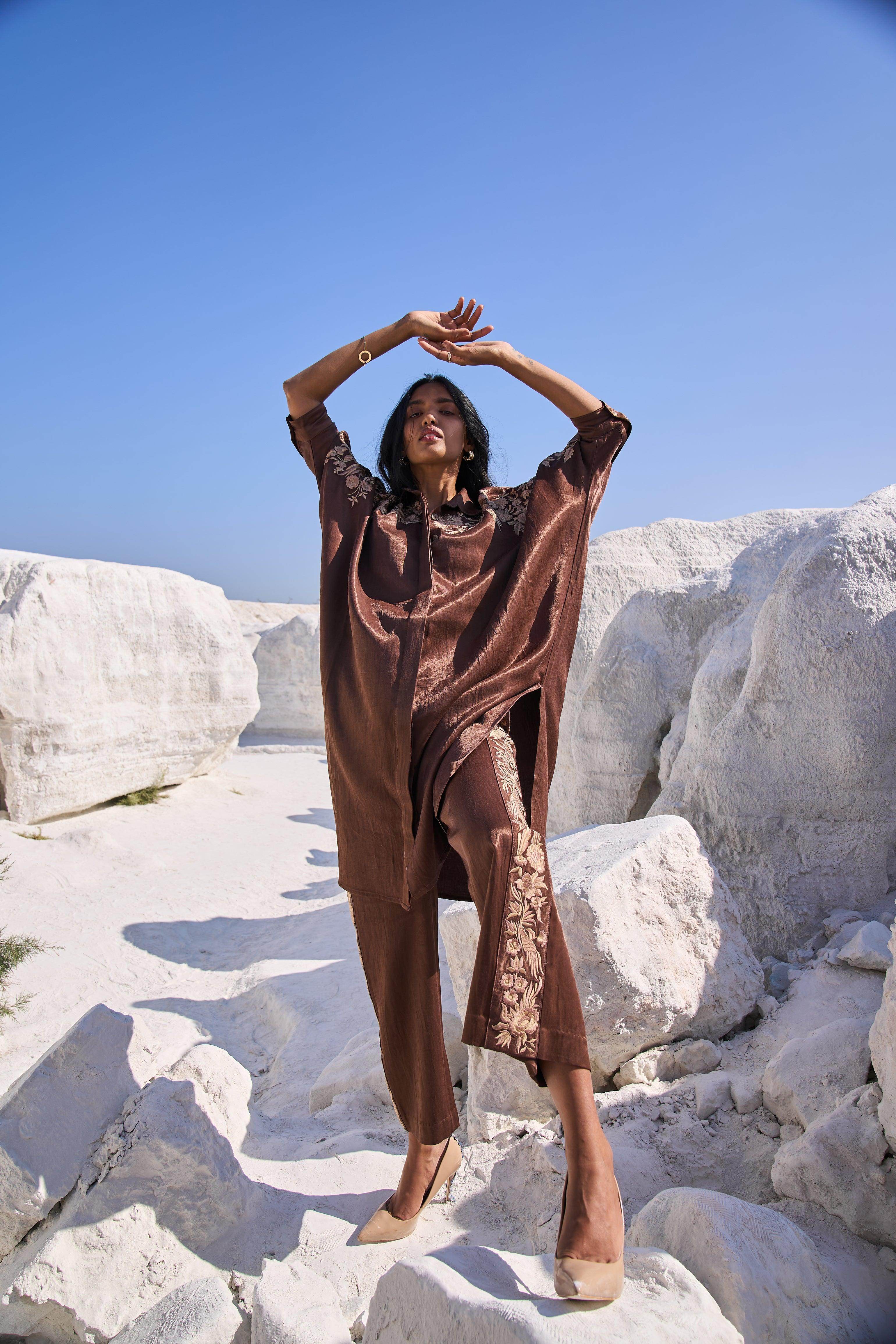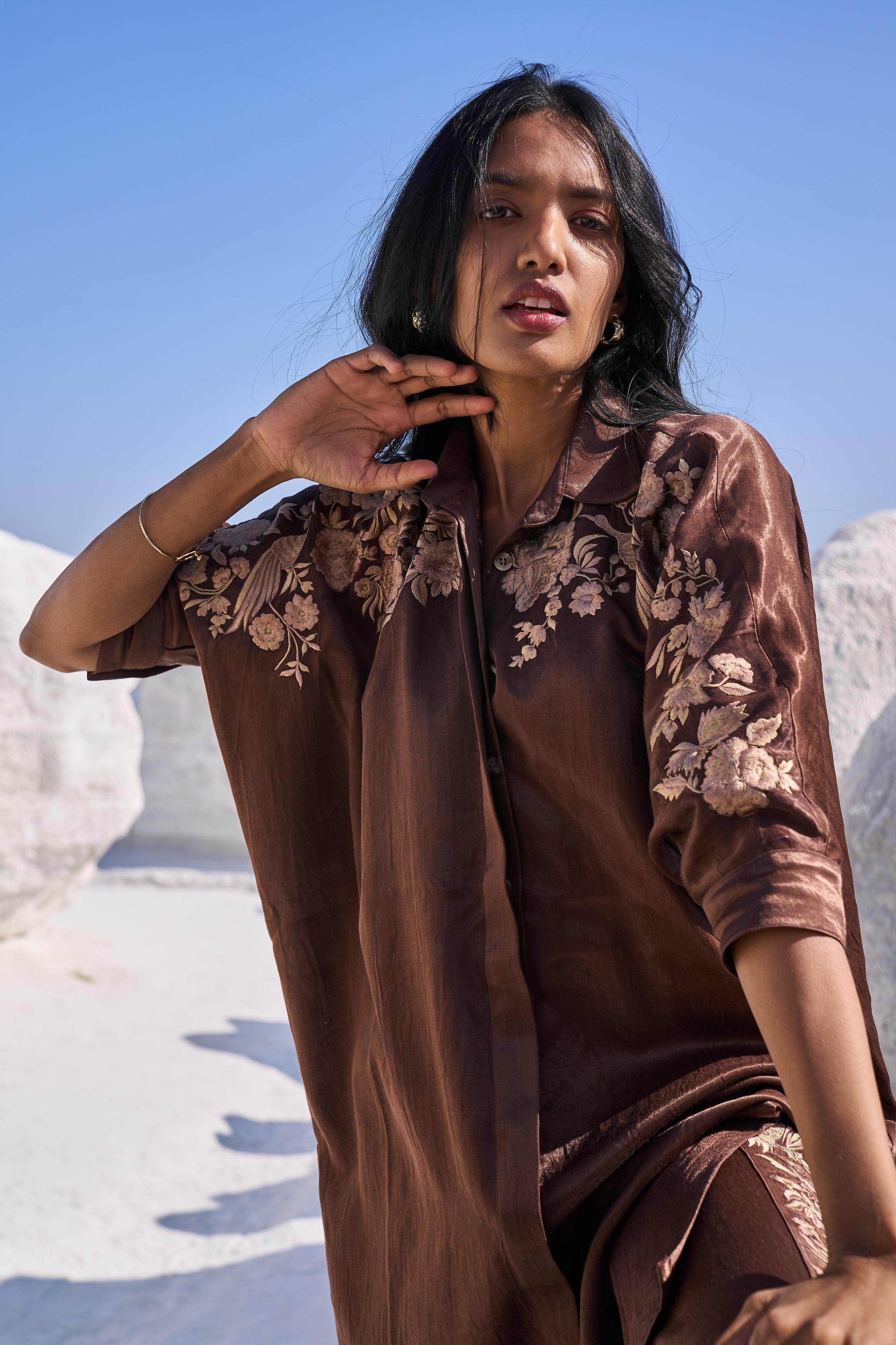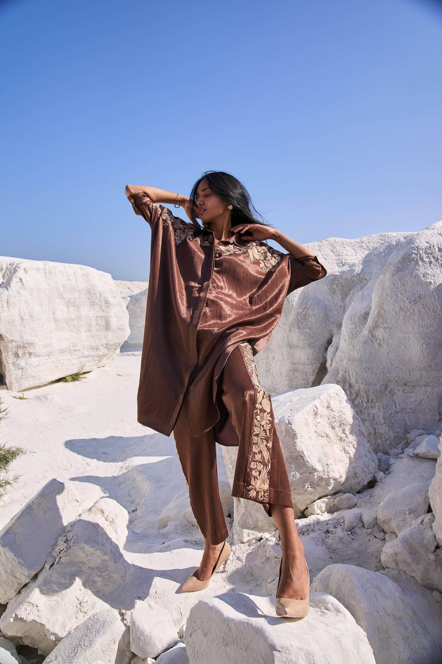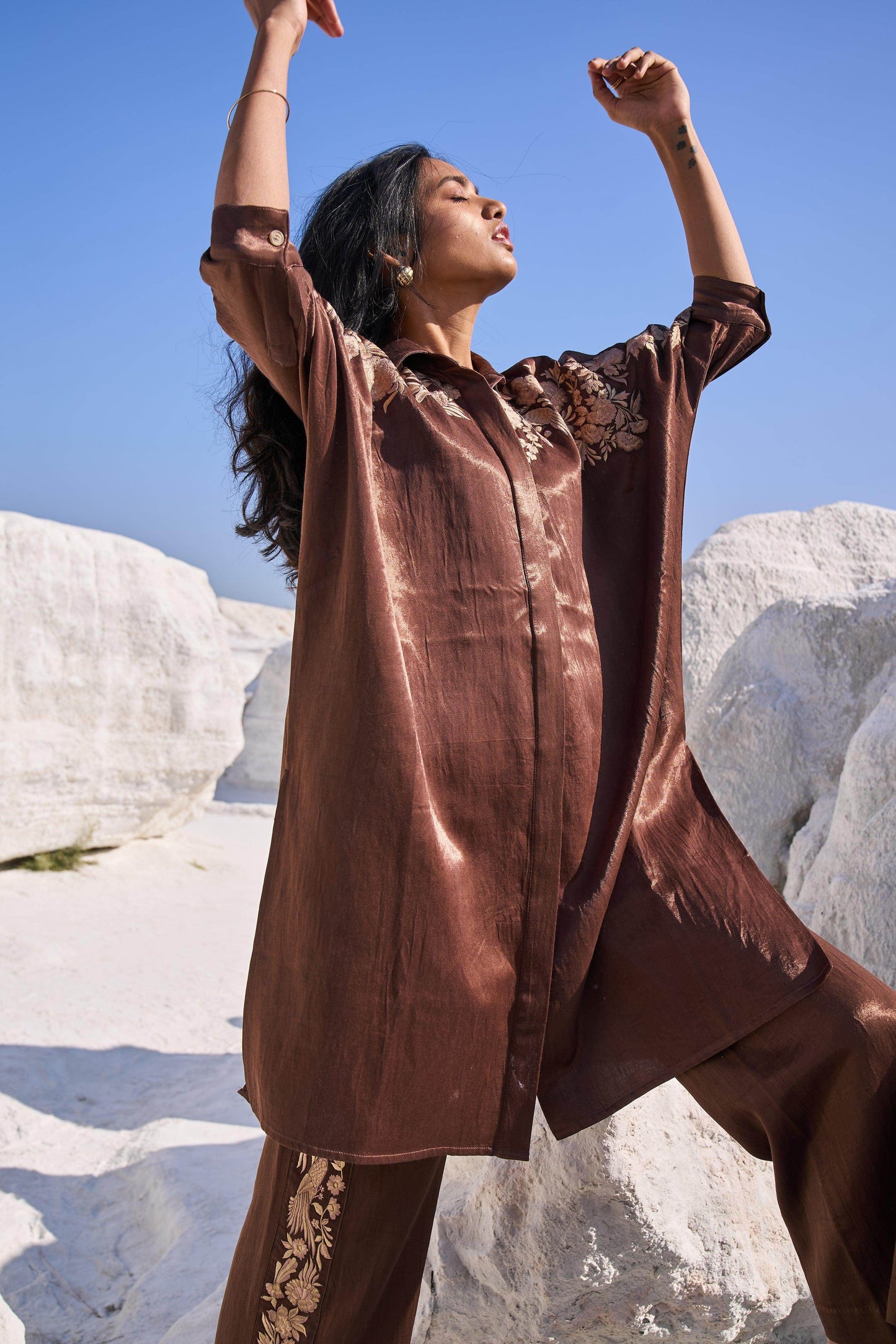 Boxy longline shirt with placed gara stitch inspired embroidery across the shoulders and sleeves. Shirt collar. Concealed button placket. Paired with pants with a similar embroidery detailing down the sides. Pockets on the side. Hook and zip closure at the front.