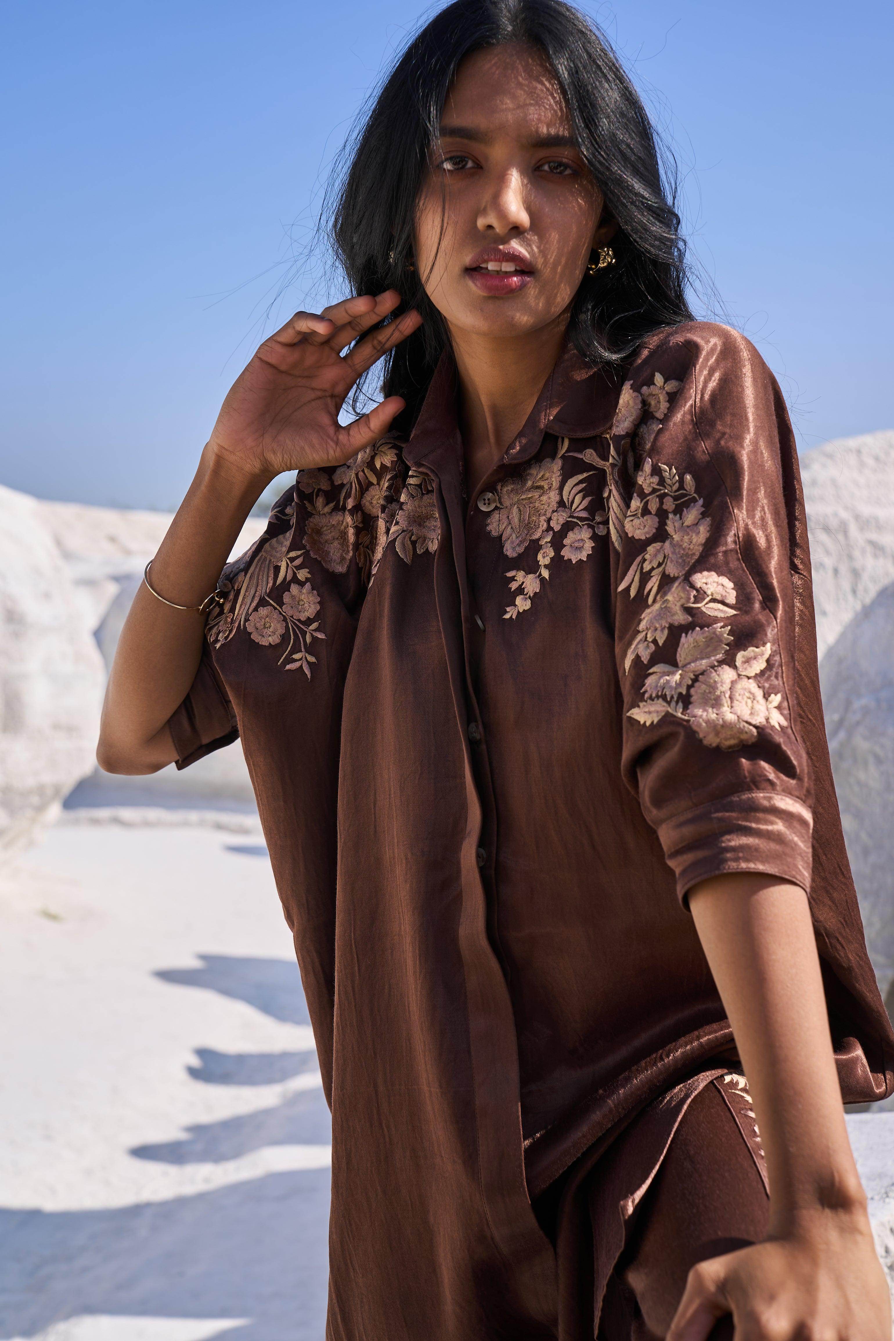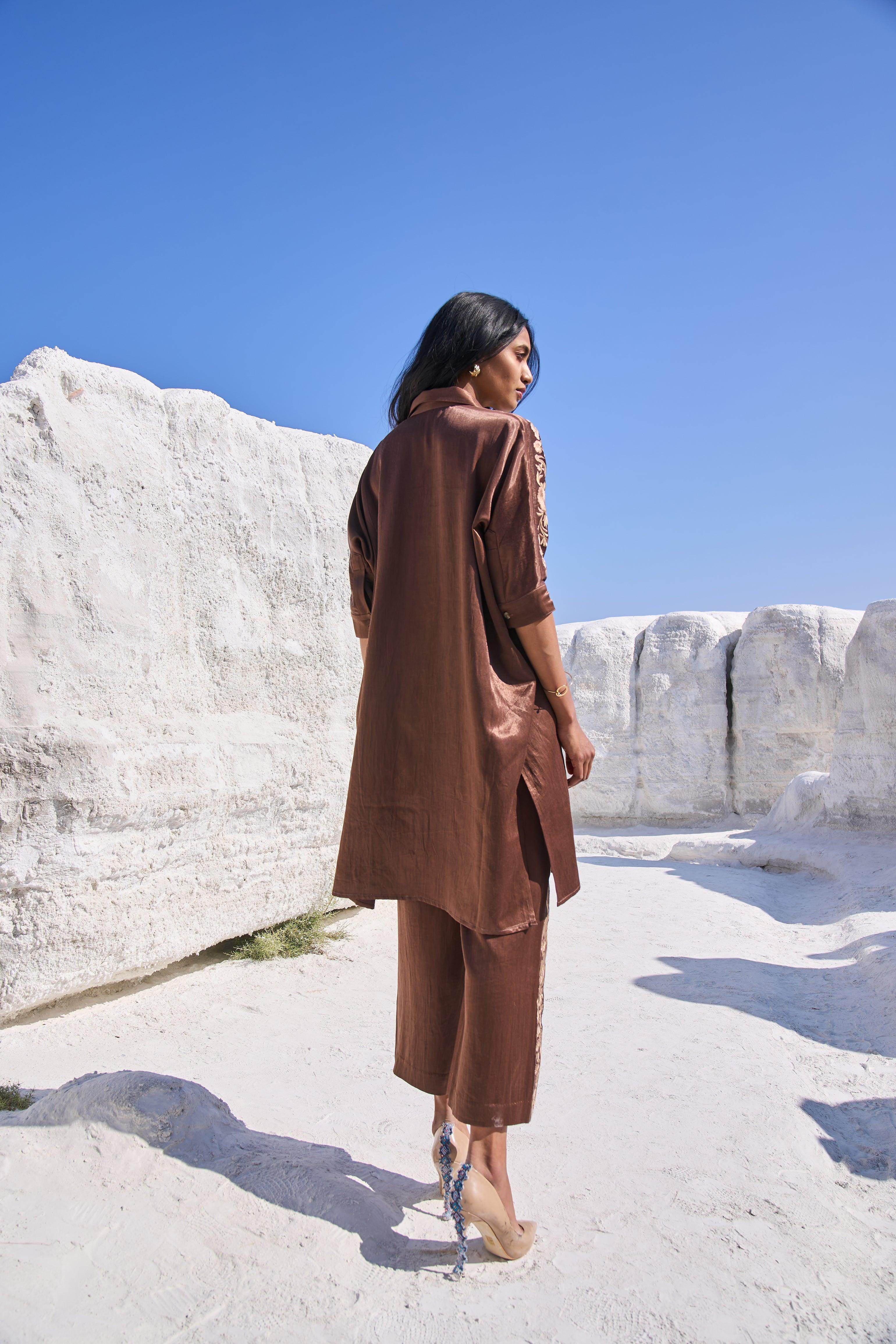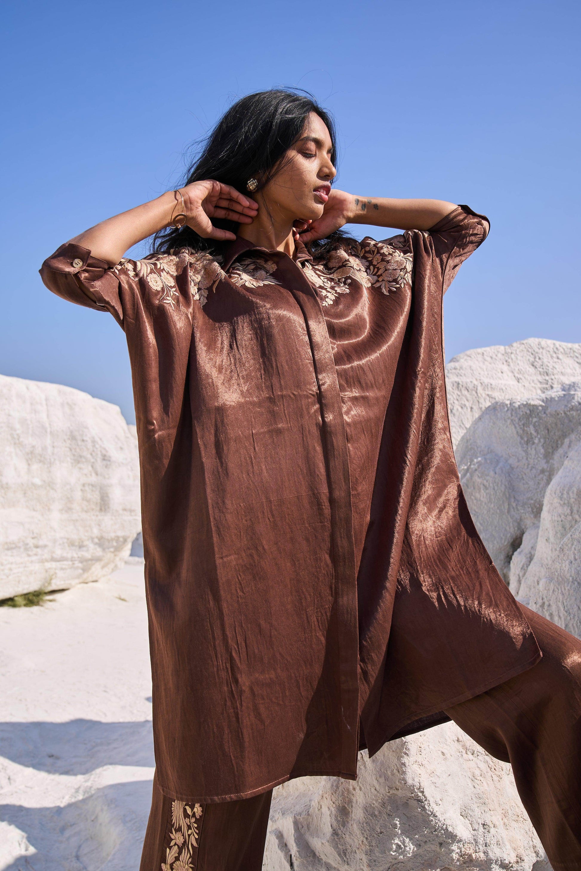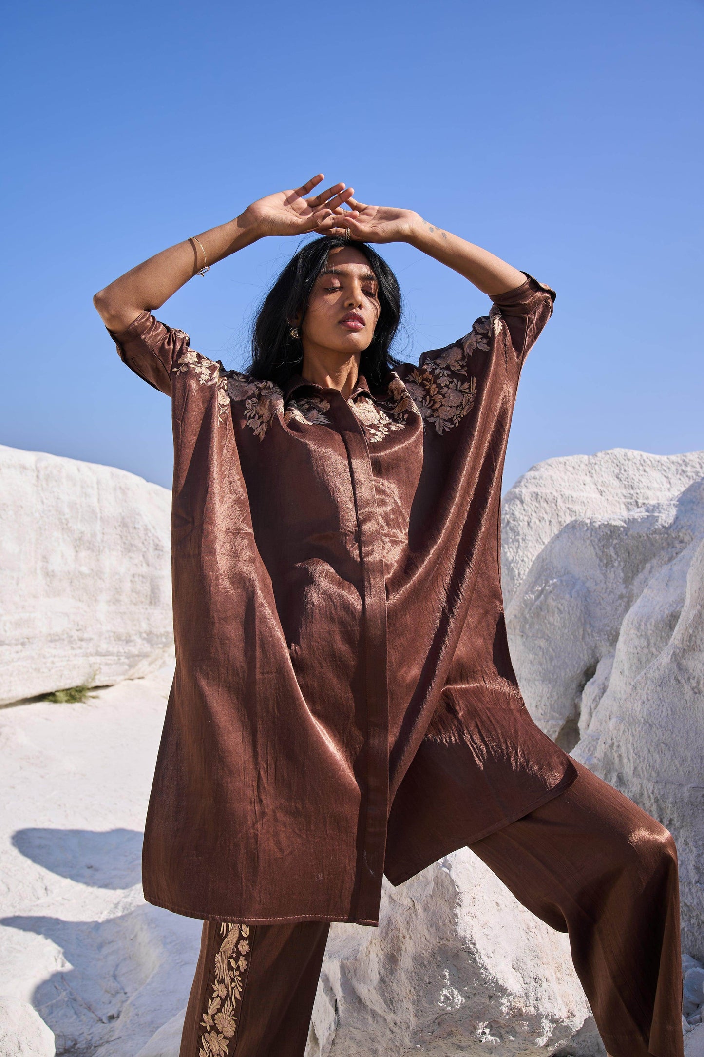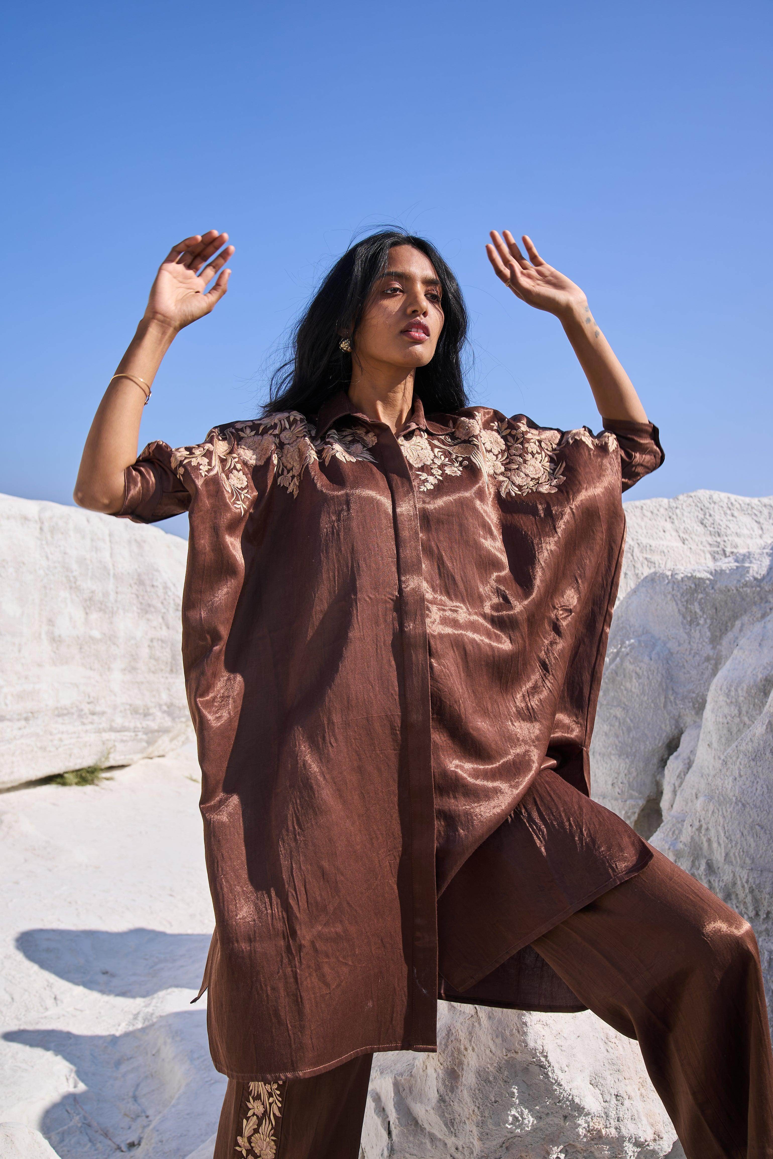 Boxy longline shirt with placed gara stitch inspired embroidery across the shoulders and sleeves. Shirt collar. Concealed button placket. Paired with pants with a similar embroidery detailing down the sides. Pockets on the side. Hook and zip closure at the front.
