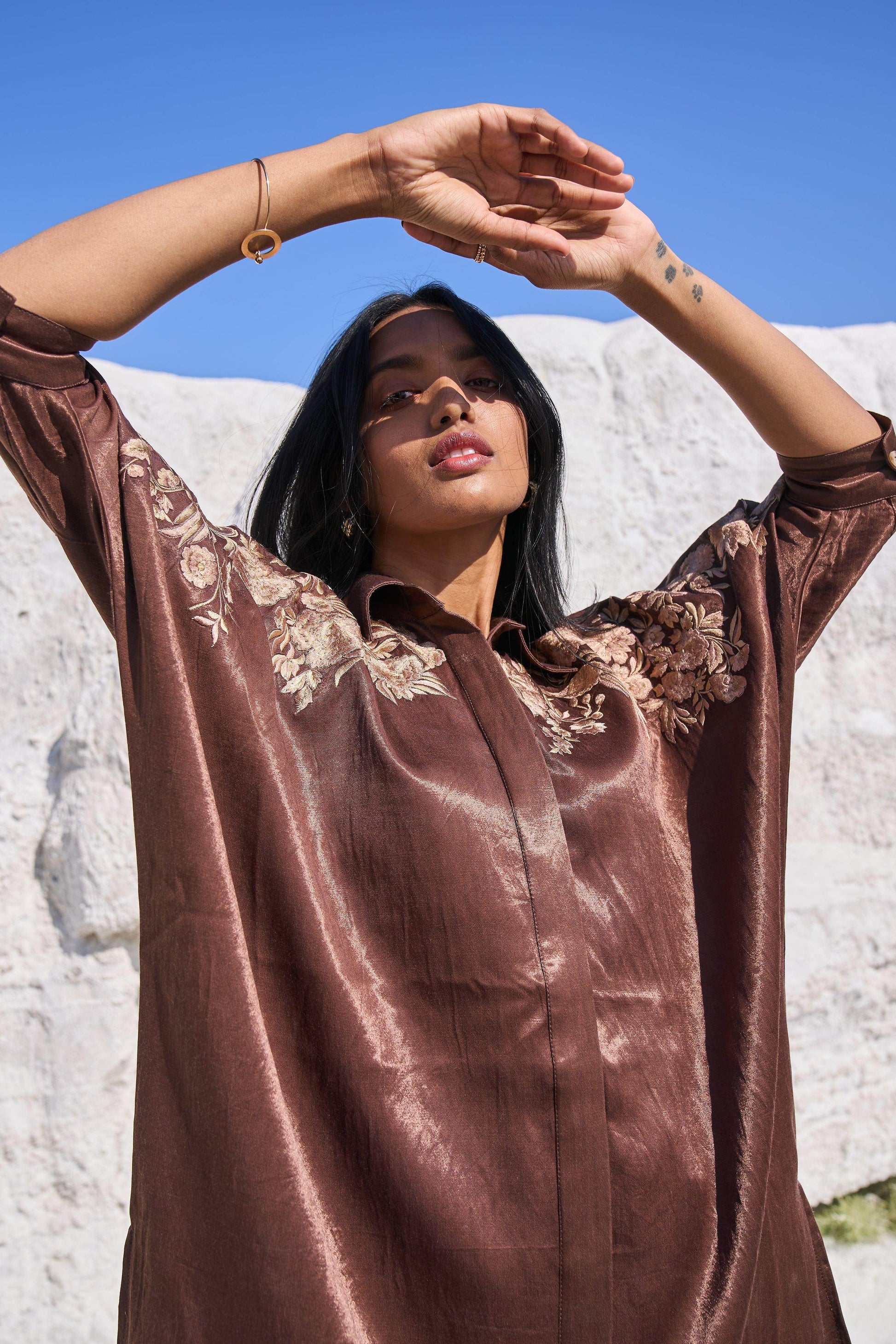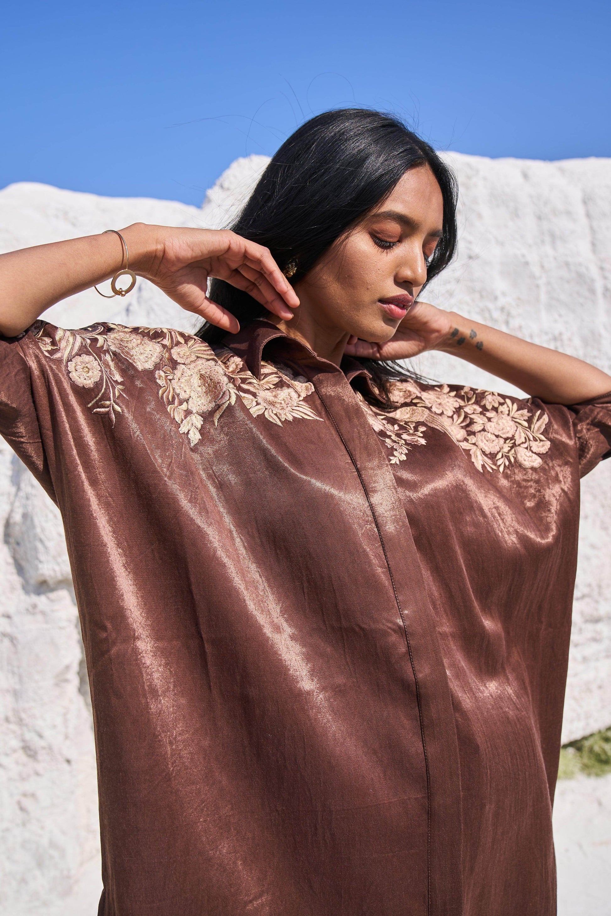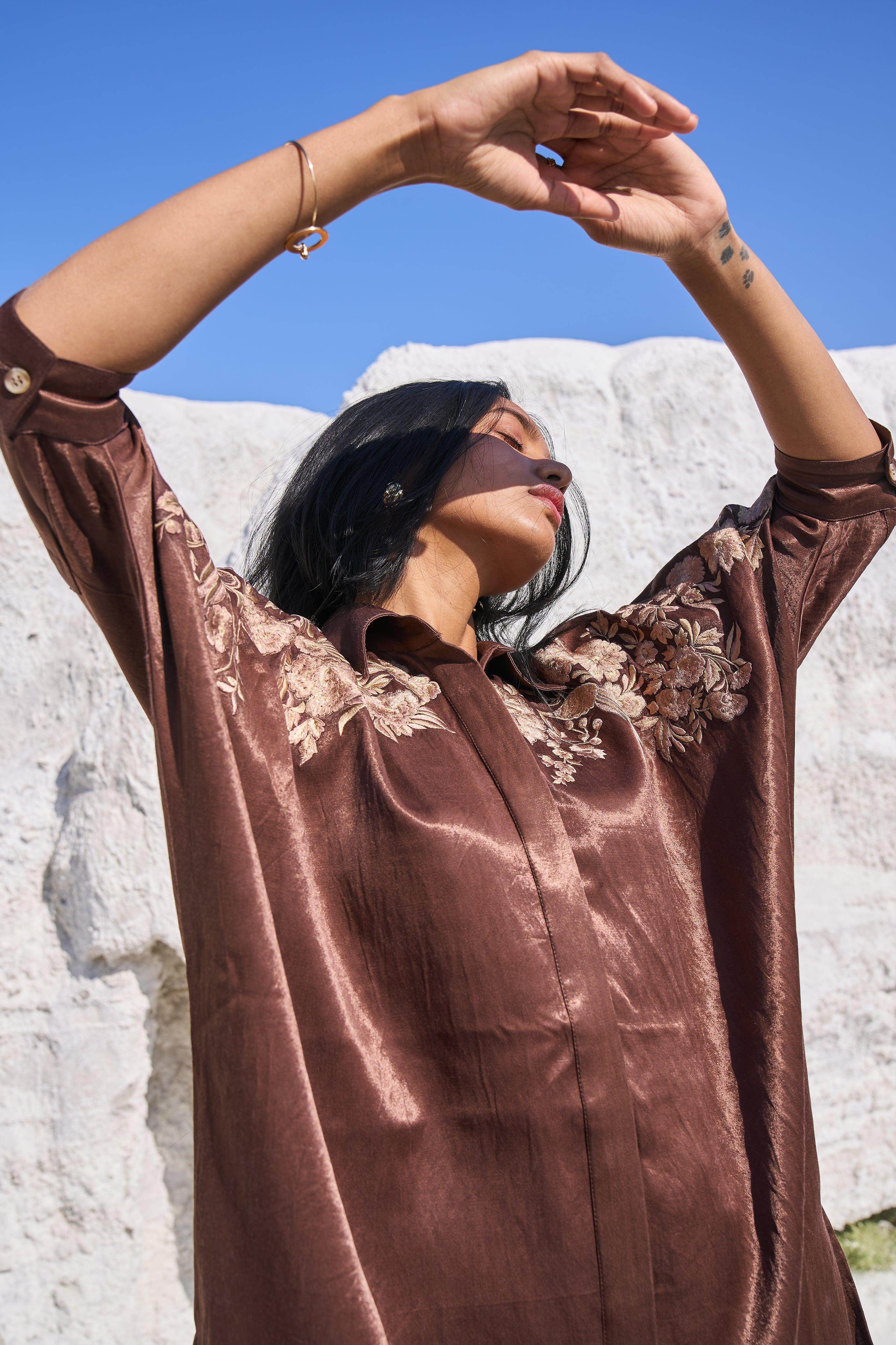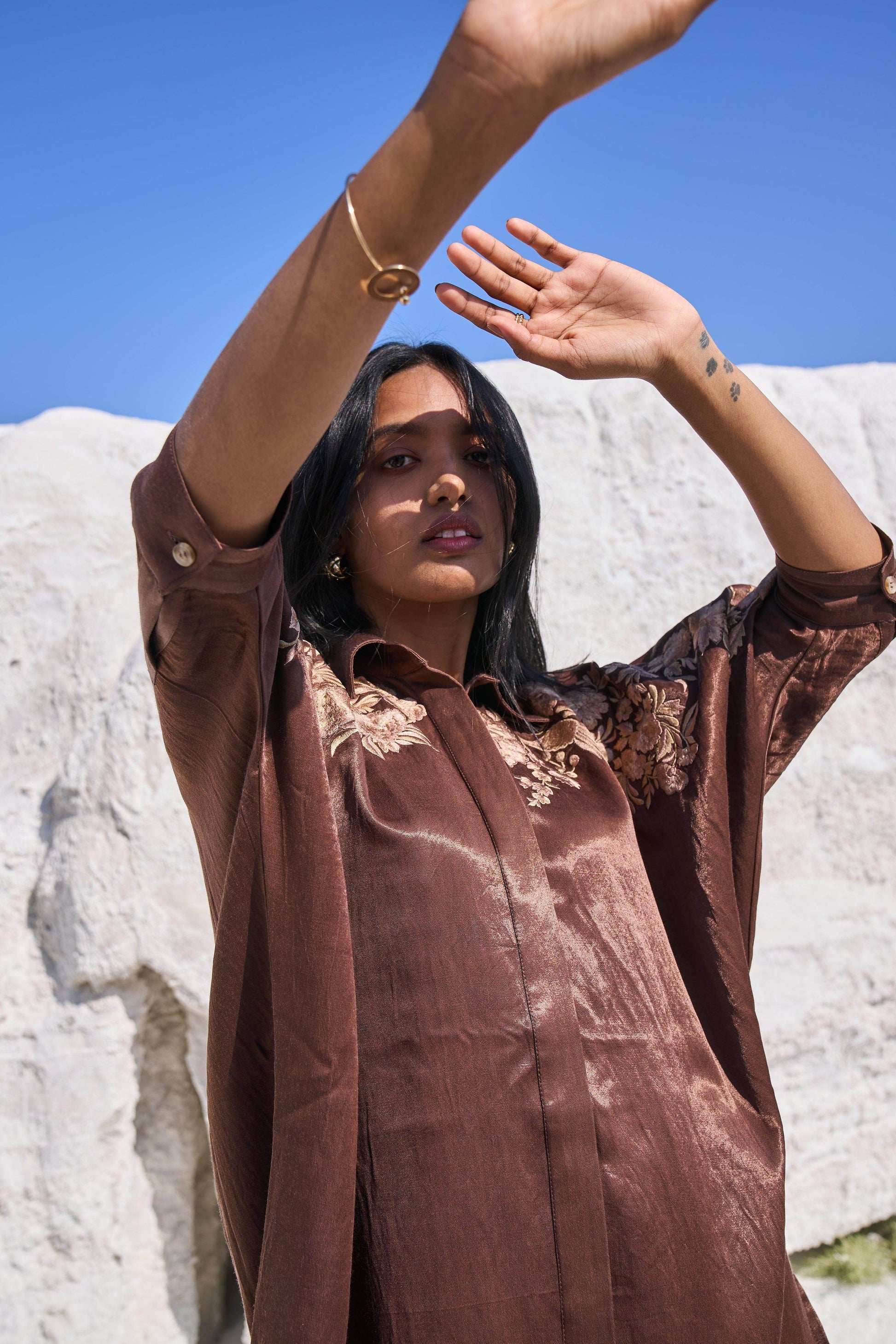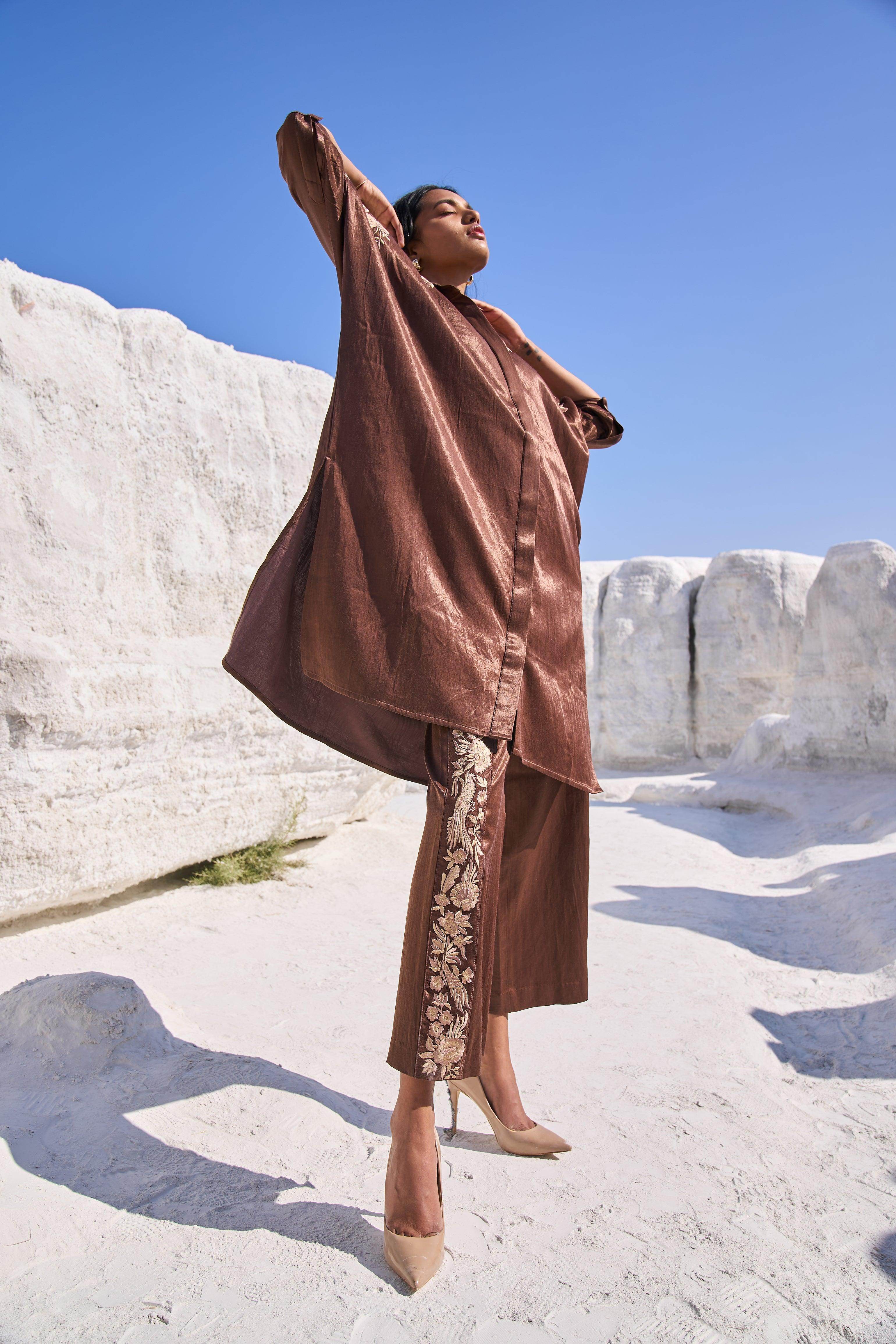 Boxy longline shirt with placed gara stitch inspired embroidery across the shoulders and sleeves. Shirt collar. Concealed button placket. Paired with pants with a similar embroidery detailing down the sides. Pockets on the side. Hook and zip closure at the front.