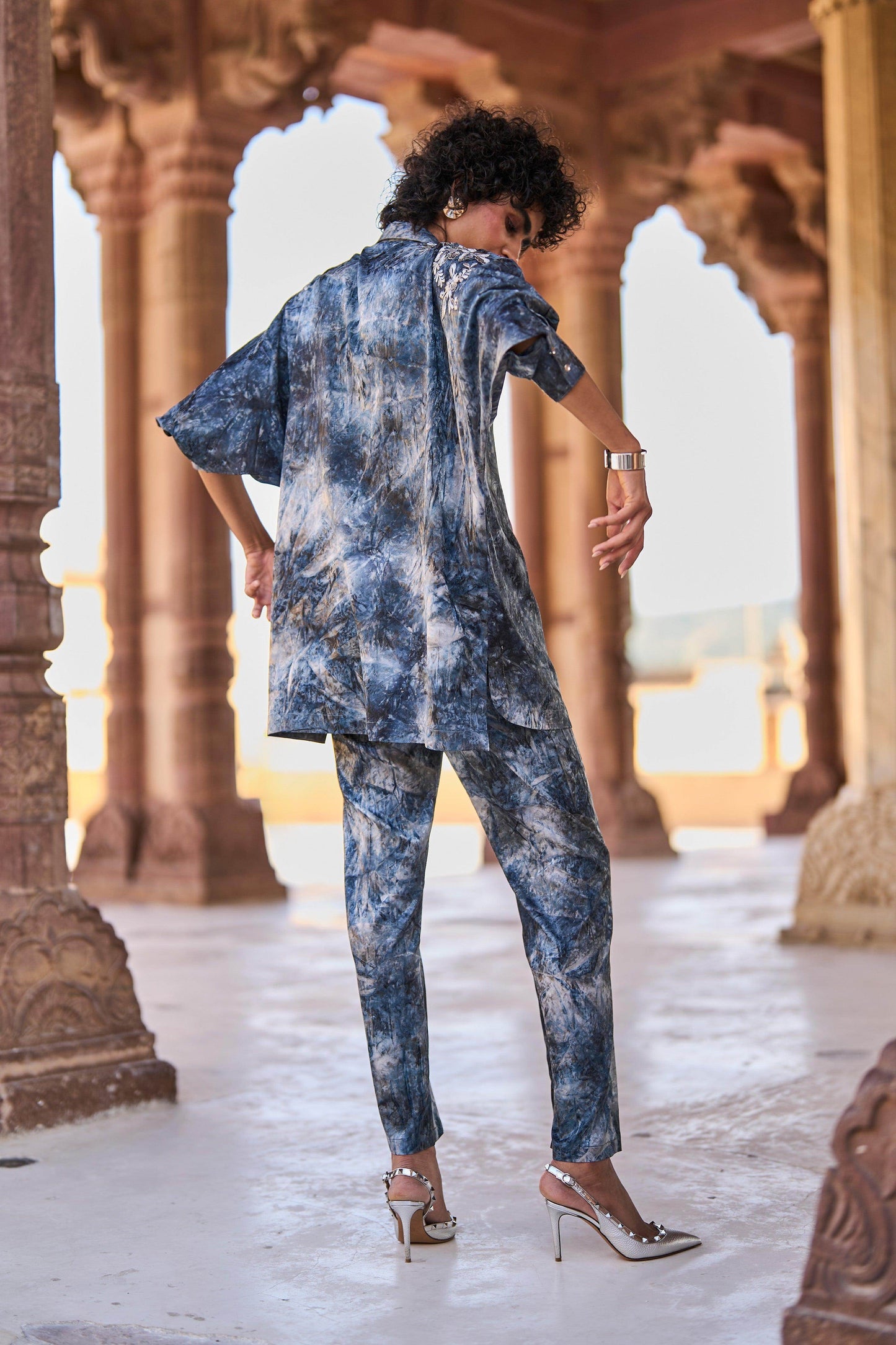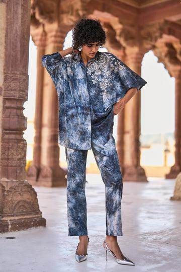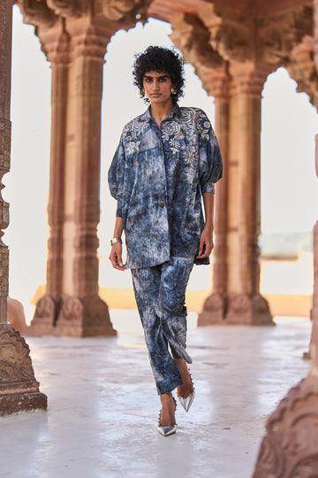 Rich drapey jacquard with an allover tie dye effect in evening shades of gray and blue. Boxy shirt with metallic silver and grey floral embroidery placed on the shoulders. Concealed placket, 3/4th dolman sleeves with snap buttons on the cuff. Curved shirt hem in the front, straight hem in the back. Paired with matching straight pant. Semi elasticated at the waist. Pockets in the sides. Hook/eye and zip closure in the front.