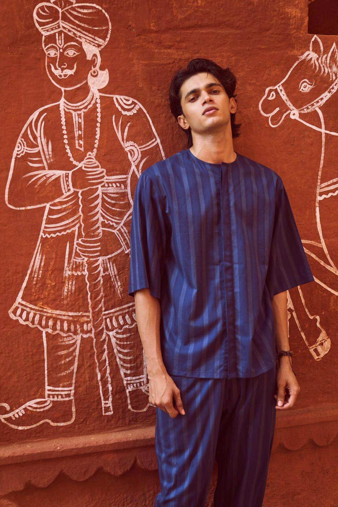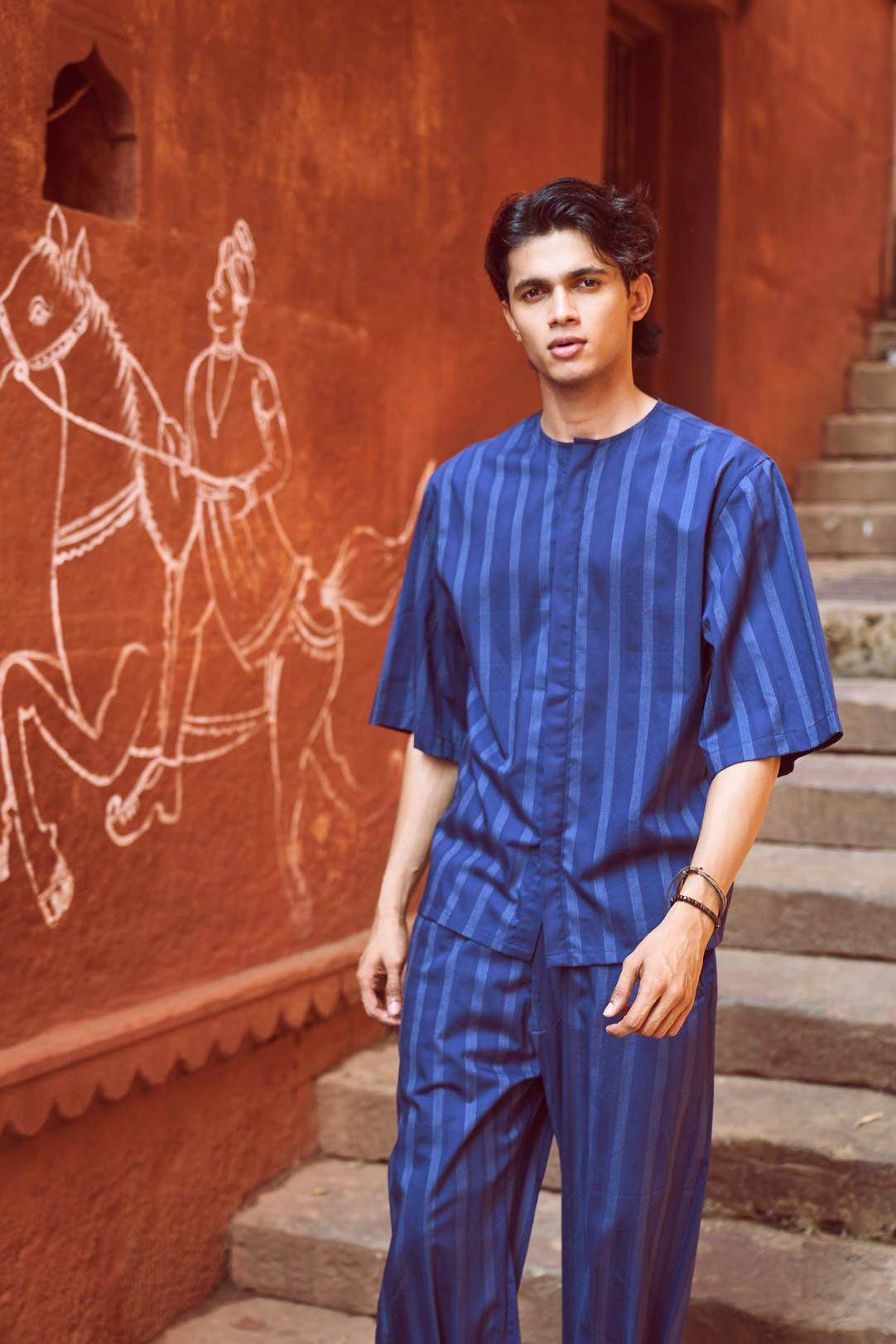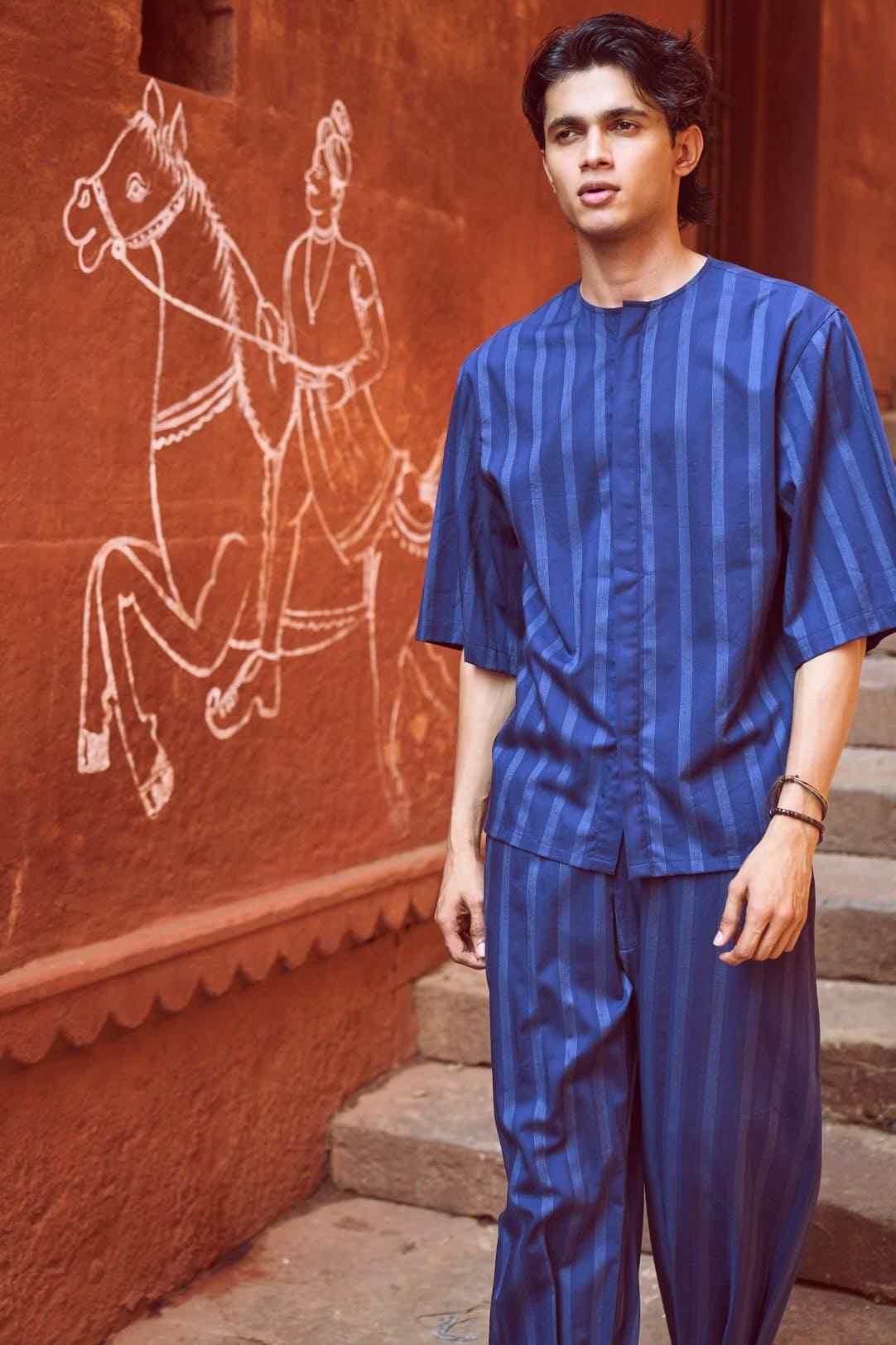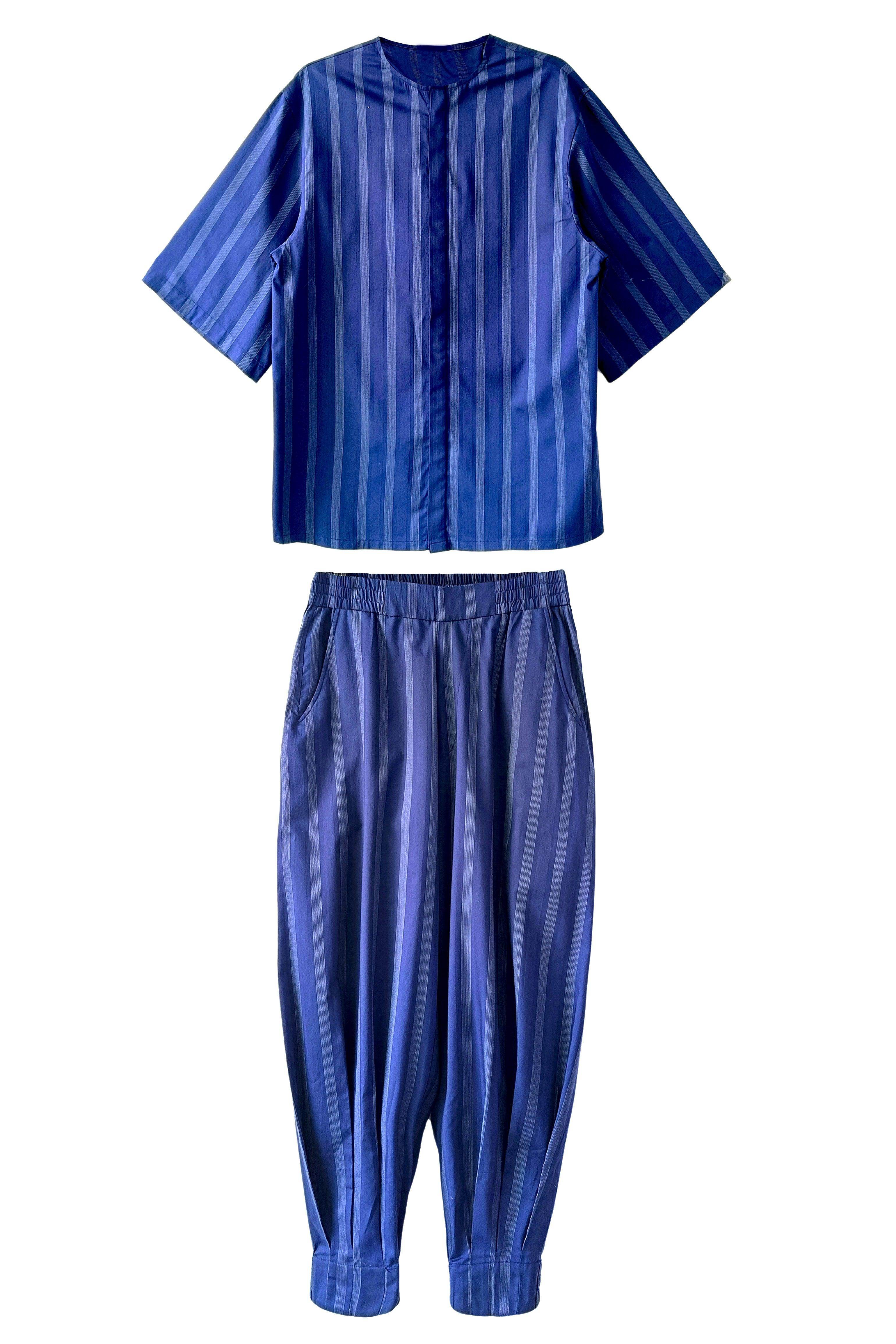 Relaxed fit shirt in white engineered pinstripe on navy base fabric. Round neck with concealed button placket. Boxy elbow-length sleeves. Paired with relaxed fit pants in white engineered pinstripe detail on navy base fabric. Pleated hem detail at the front cuff of the pants to add shape and volume. Hook and zip closure at the front. Pockets on the side. Elasticated at the waist.