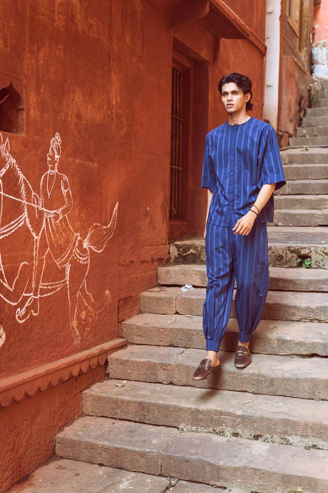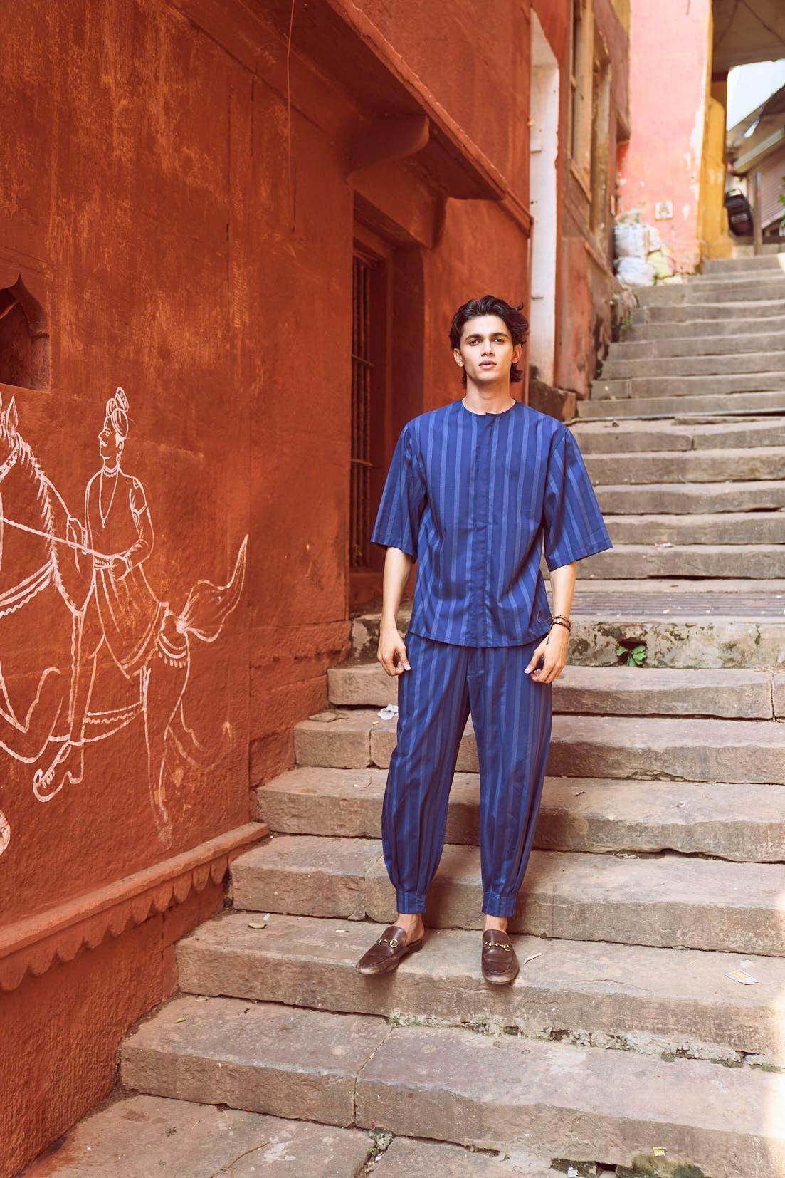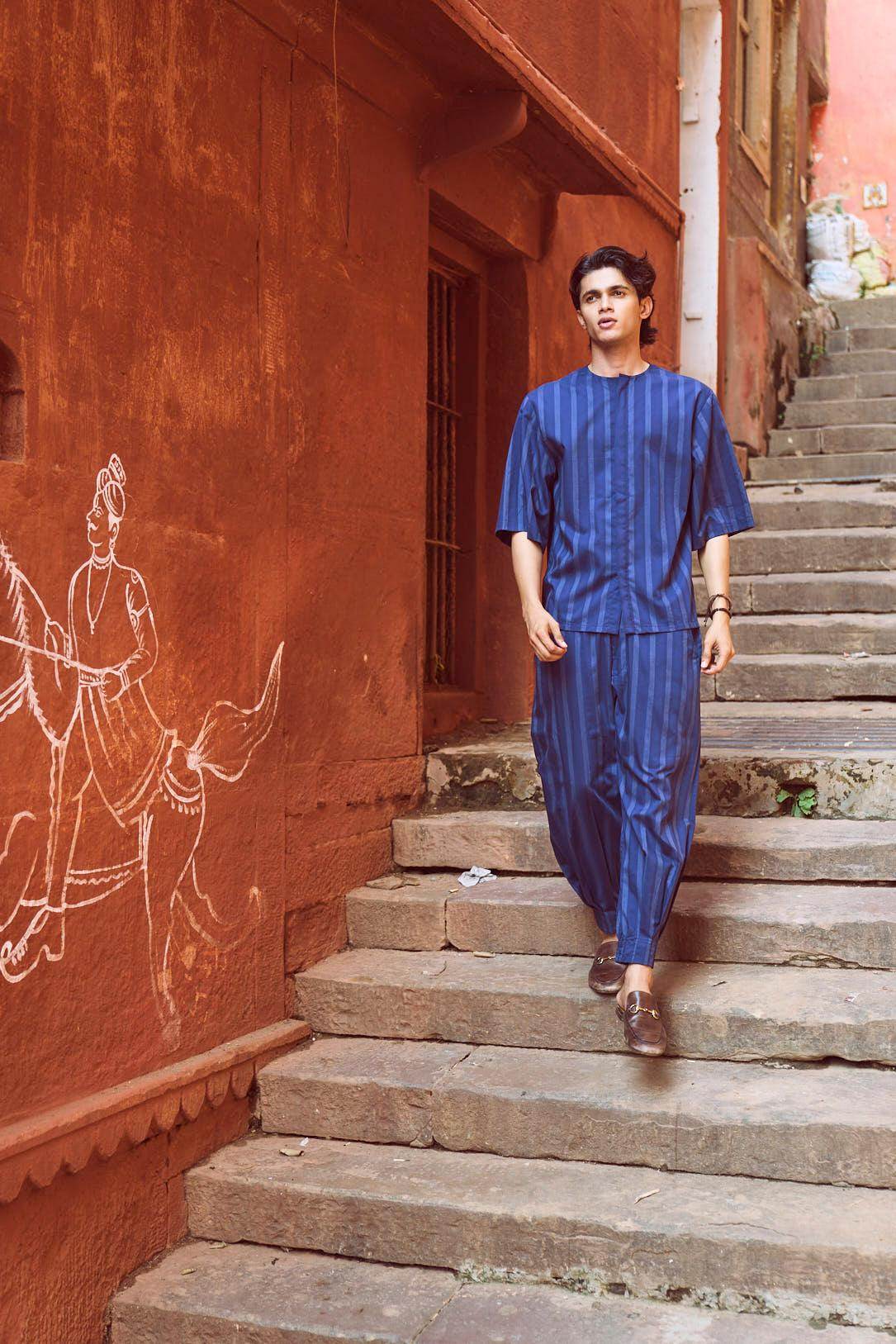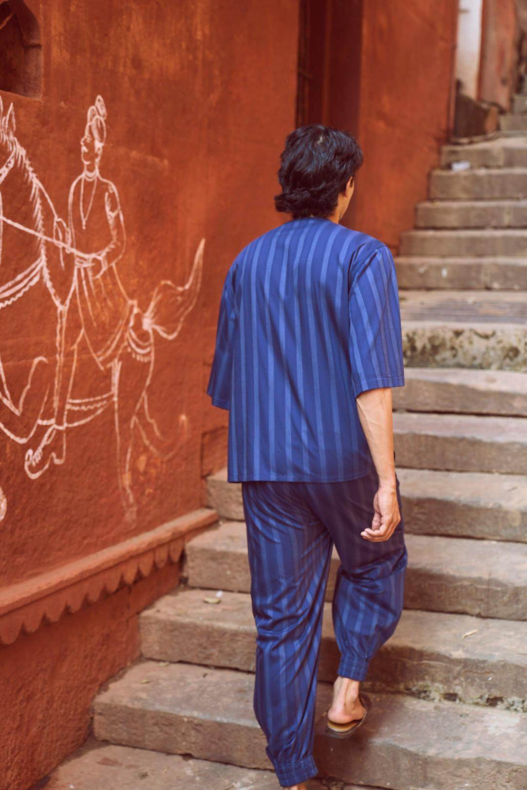 Relaxed fit shirt in white engineered pinstripe on navy base fabric. Round neck with concealed button placket. Boxy elbow-length sleeves. Paired with relaxed fit pants in white engineered pinstripe detail on navy base fabric. Pleated hem detail at the front cuff of the pants to add shape and volume. Hook and zip closure at the front. Pockets on the side. Elasticated at the waist.
