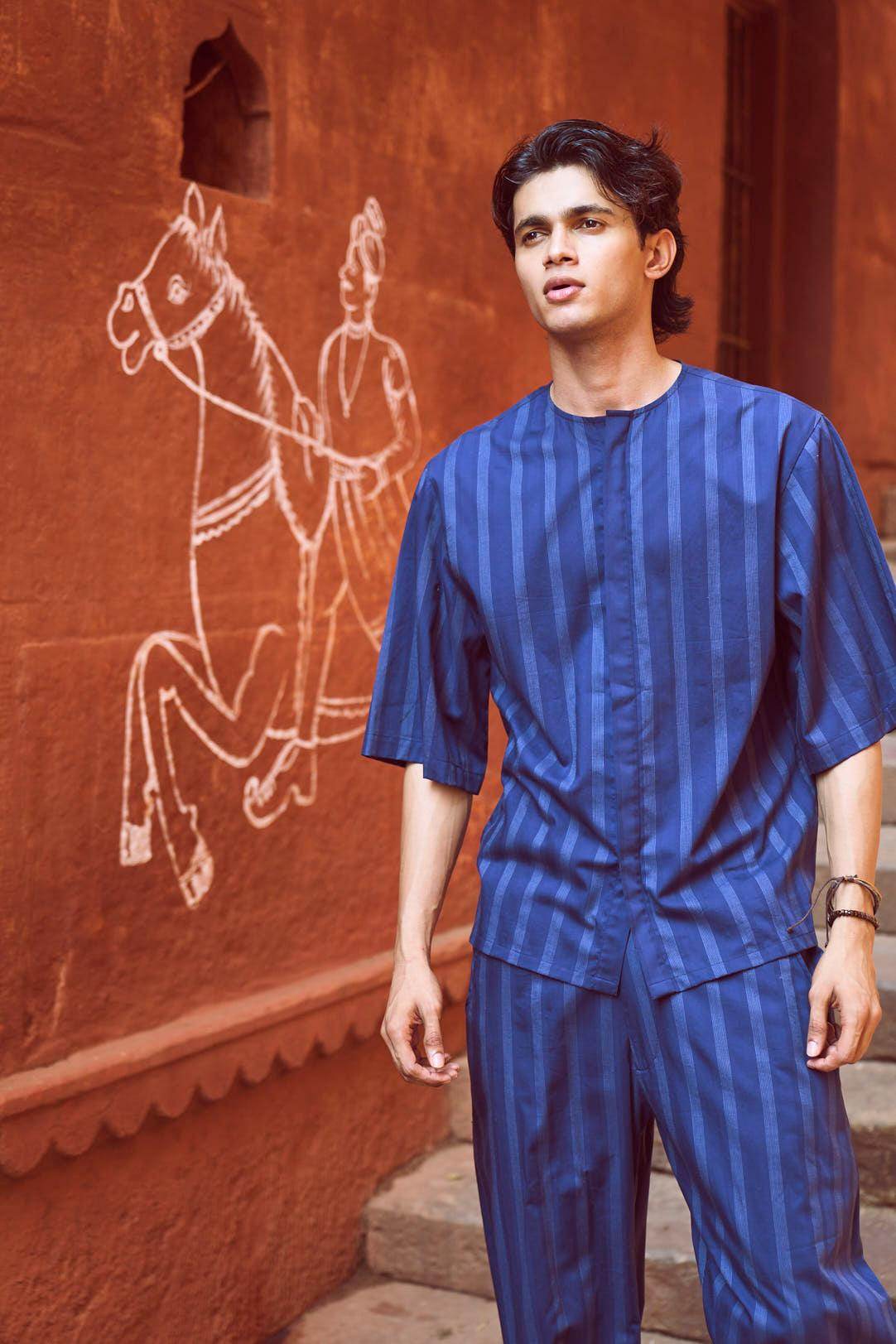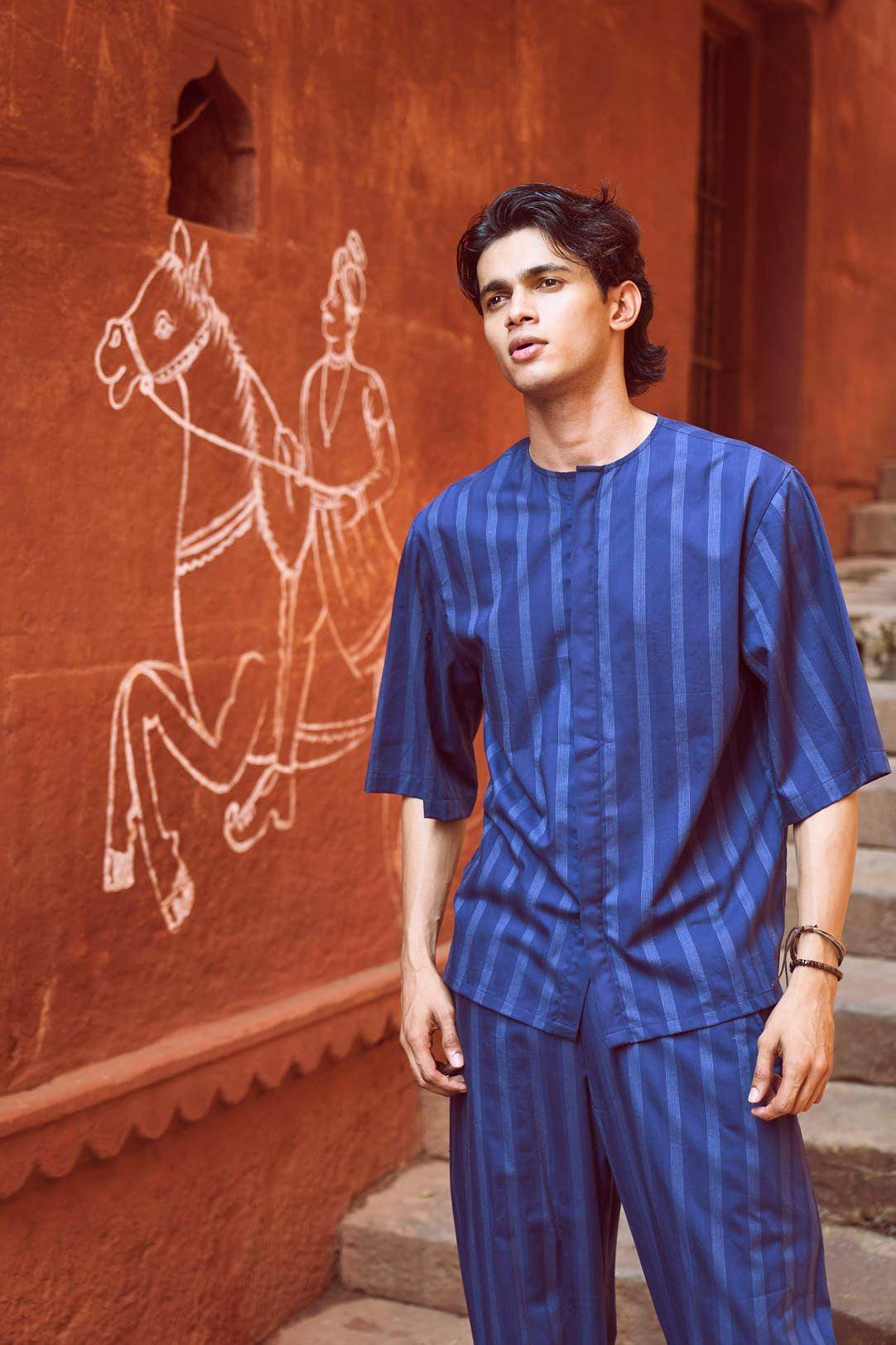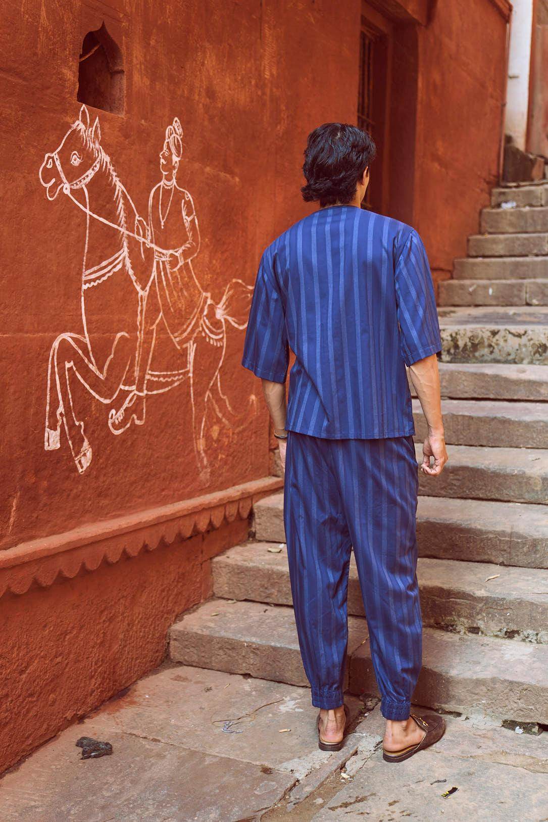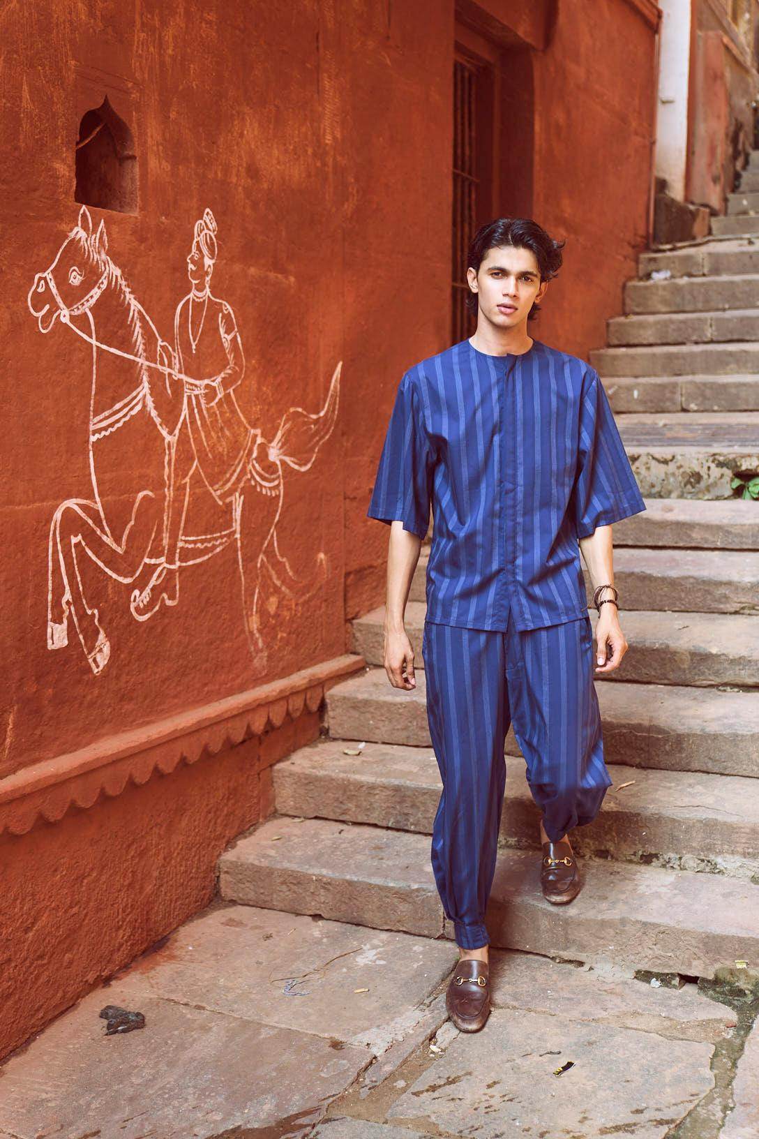 Relaxed fit shirt in white engineered pinstripe on navy base fabric. Round neck with concealed button placket. Boxy elbow-length sleeves. Paired with relaxed fit pants in white engineered pinstripe detail on navy base fabric. Pleated hem detail at the front cuff of the pants to add shape and volume. Hook and zip closure at the front. Pockets on the side. Elasticated at the waist.