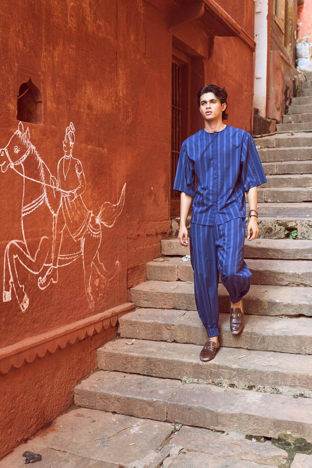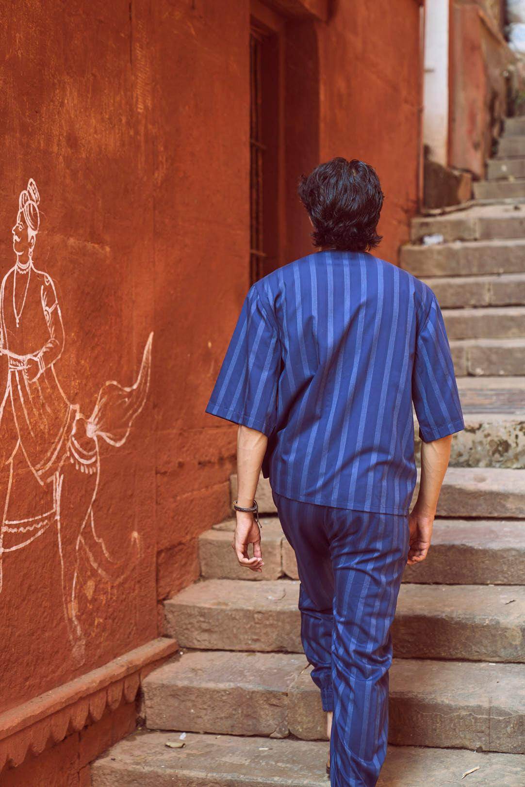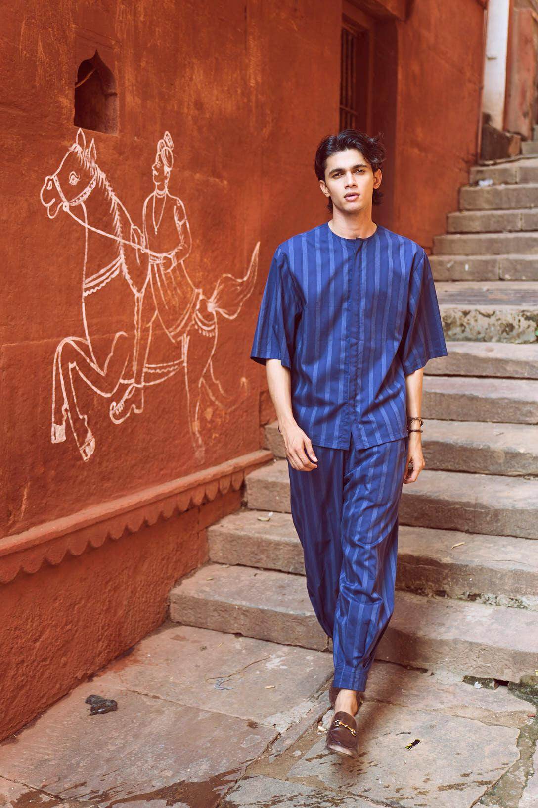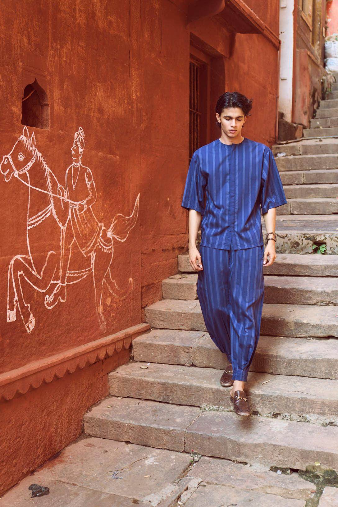 Relaxed fit shirt in white engineered pinstripe on navy base fabric. Round neck with concealed button placket. Boxy elbow-length sleeves. Paired with relaxed fit pants in white engineered pinstripe detail on navy base fabric. Pleated hem detail at the front cuff of the pants to add shape and volume. Hook and zip closure at the front. Pockets on the side. Elasticated at the waist.