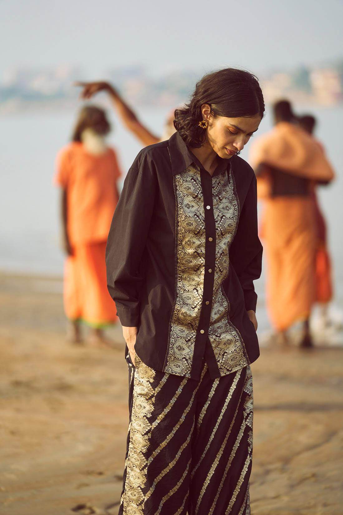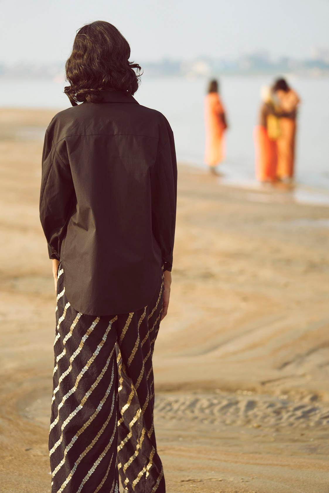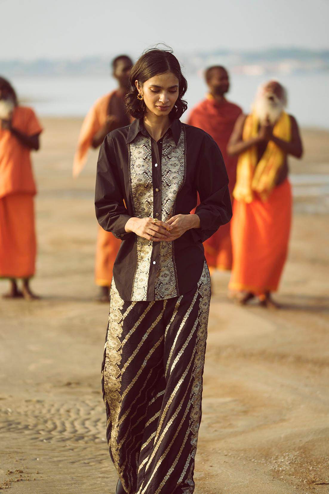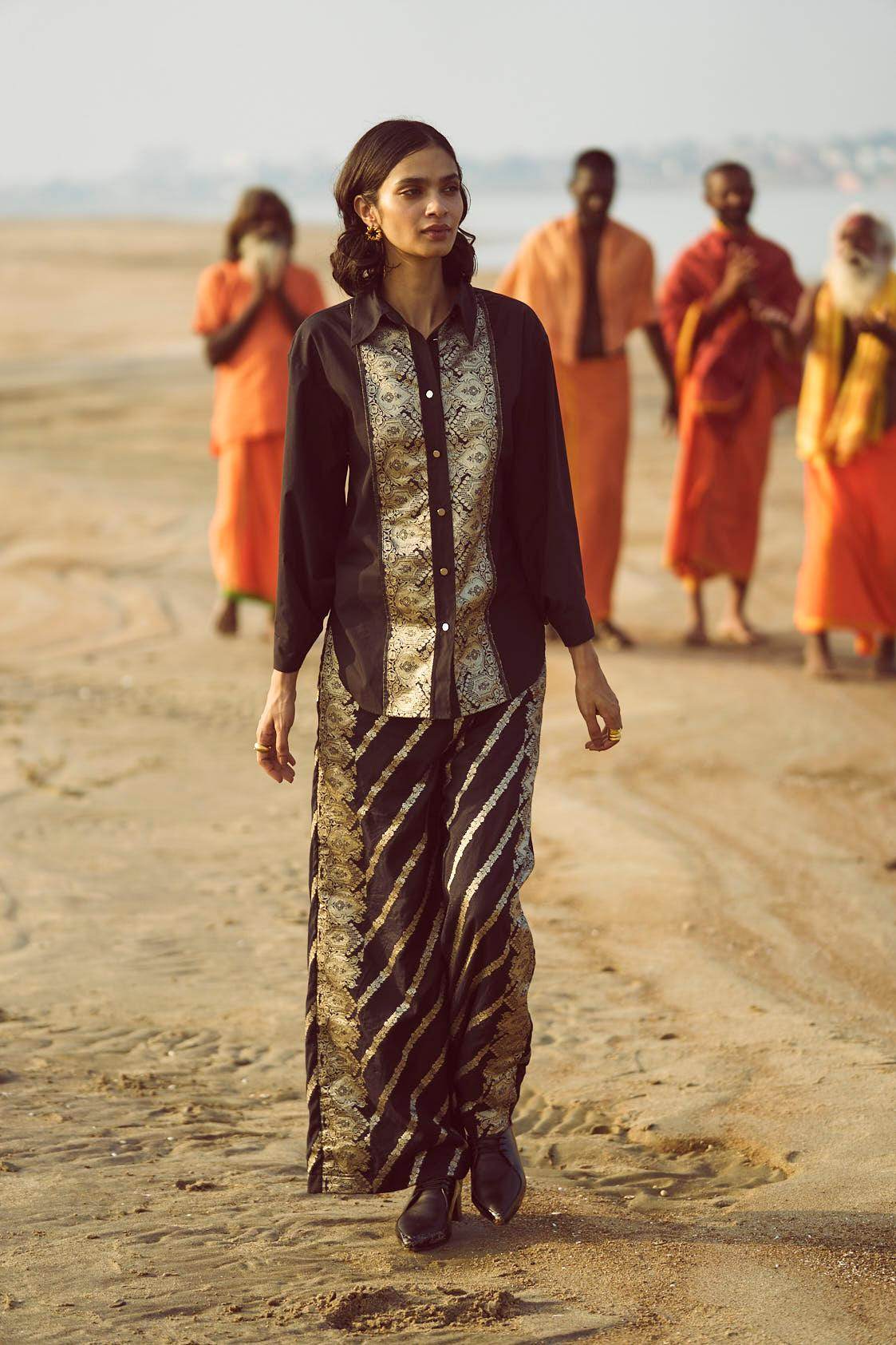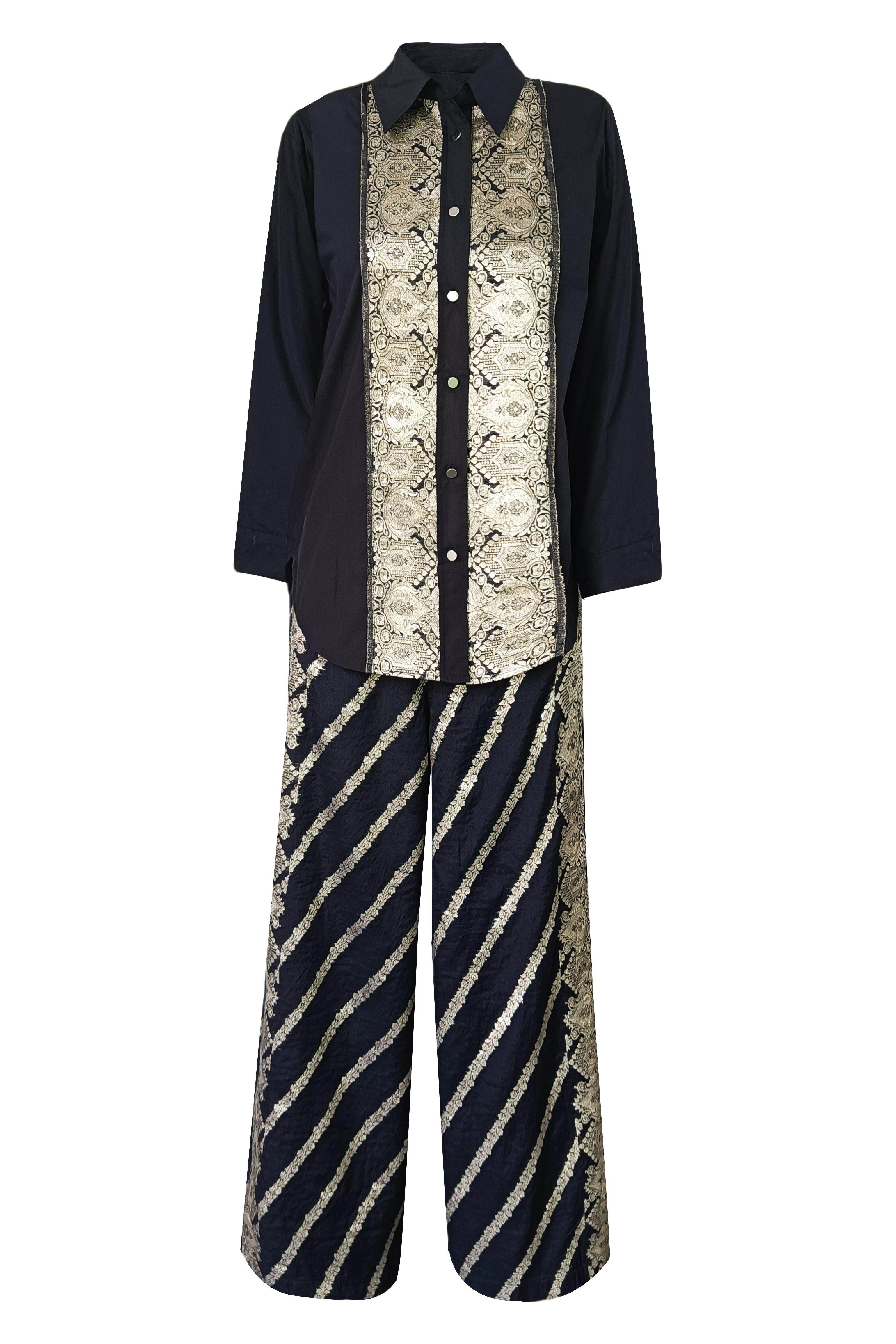 Black cotton poplin shirt with placed chanderi brocade border down the center front. Pleat and fold constructed sleeve and cuff. Metallic button closure at the front and cuffs. Paired with black wide legged pants with allover patterend gold chanderi lurex brocade fabric. Placed border down the sides of the pants. Elasticated at the back. Hook and zip closure at the back. Pockets on the side. The pant is fully lined.