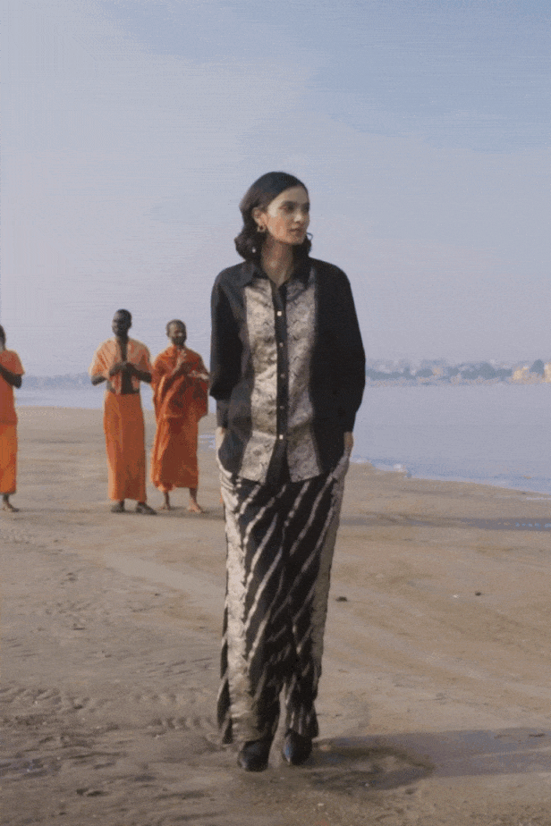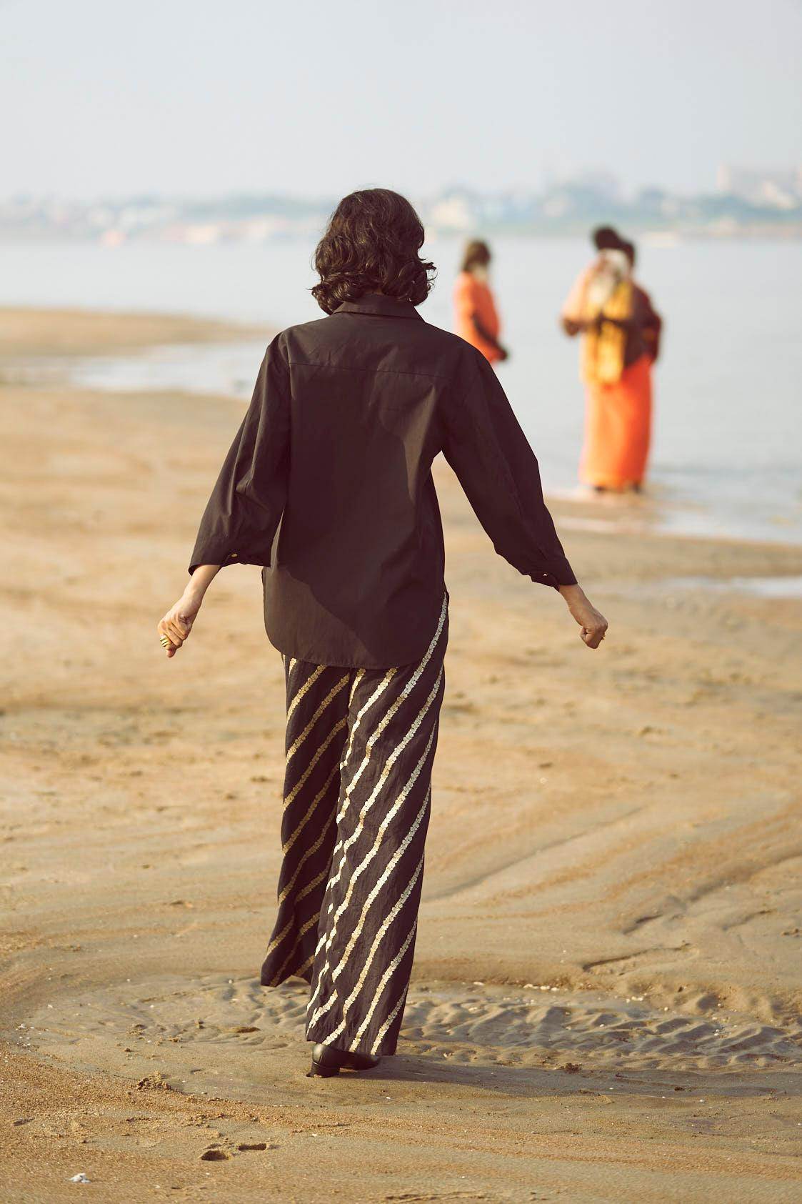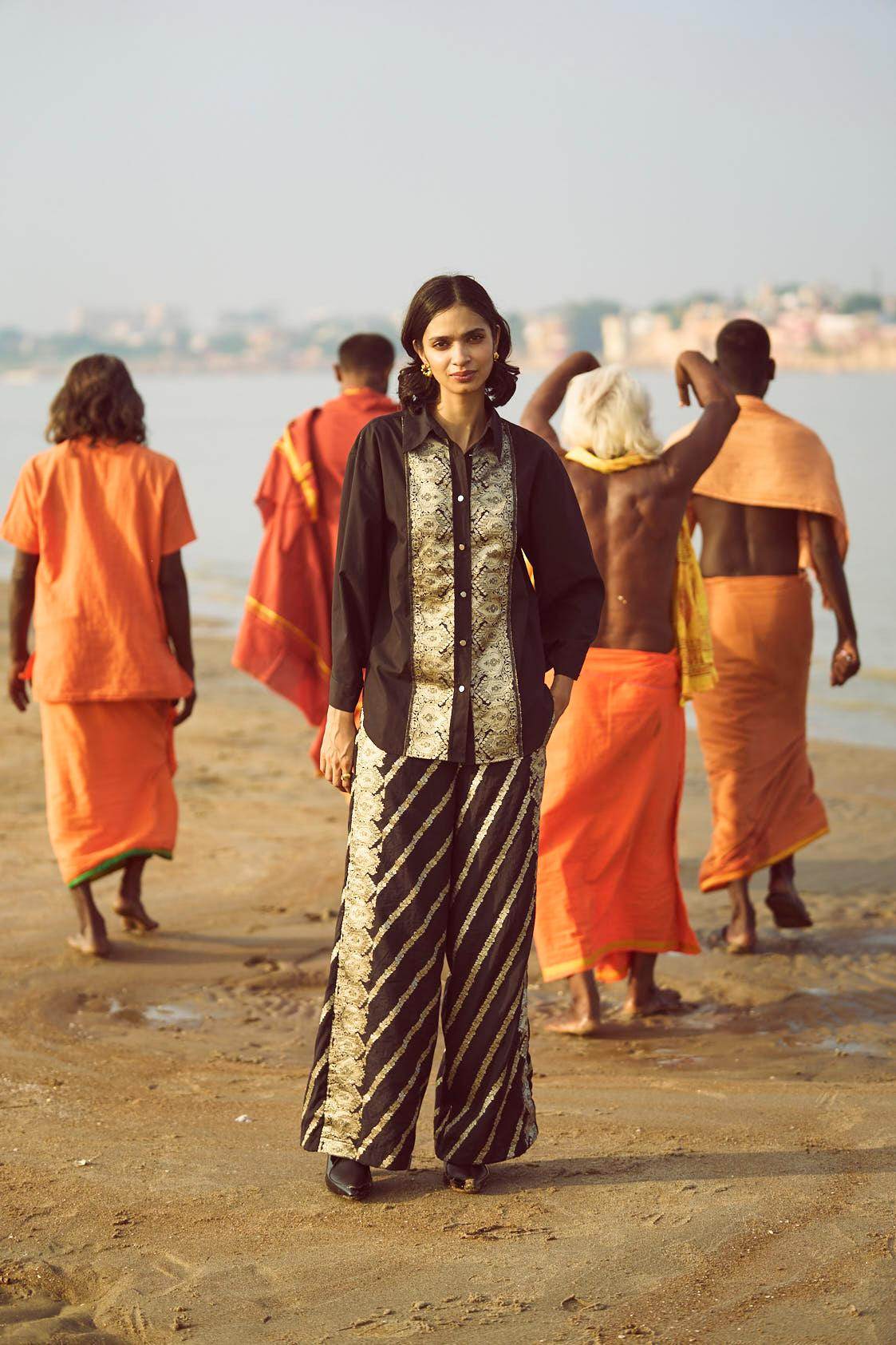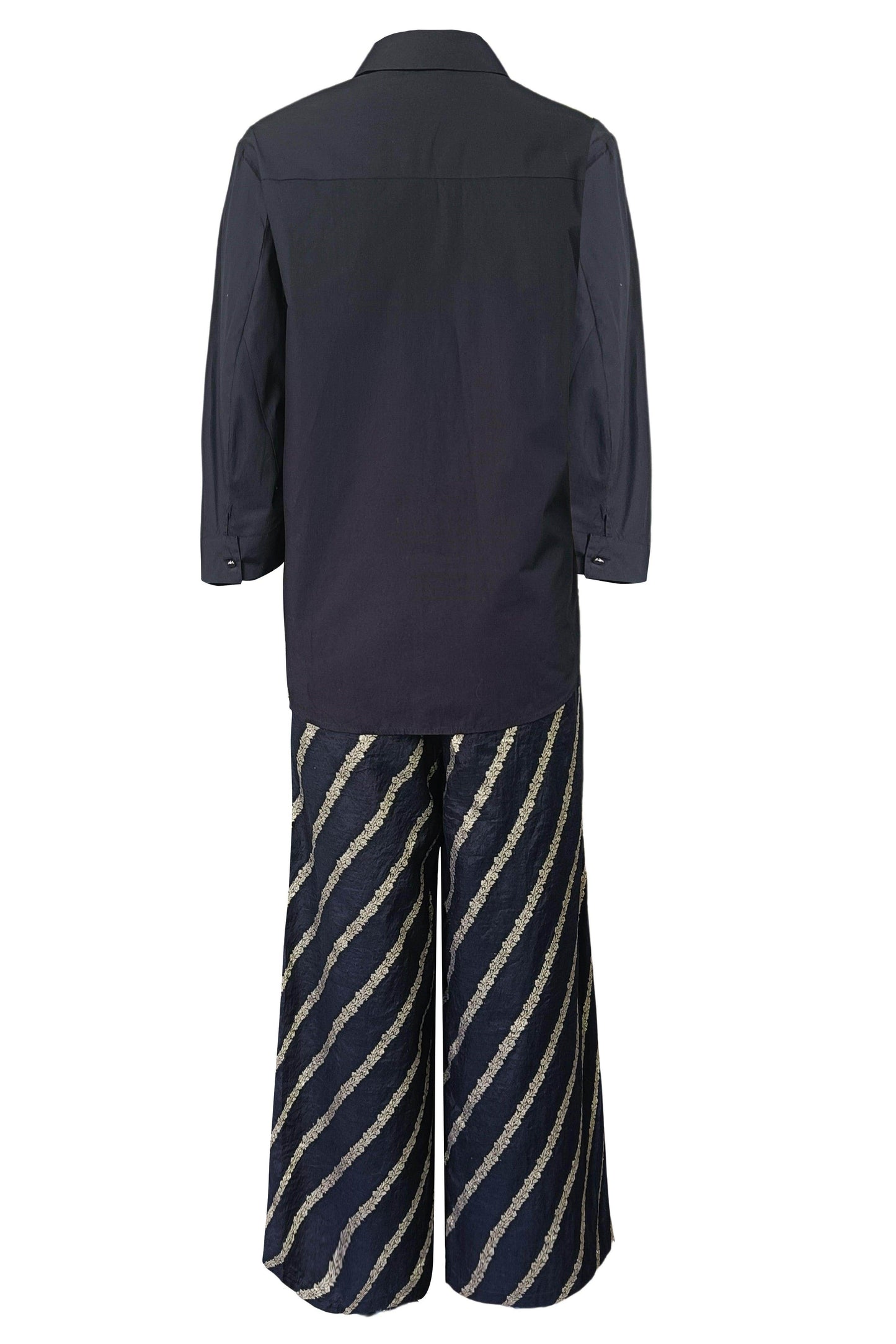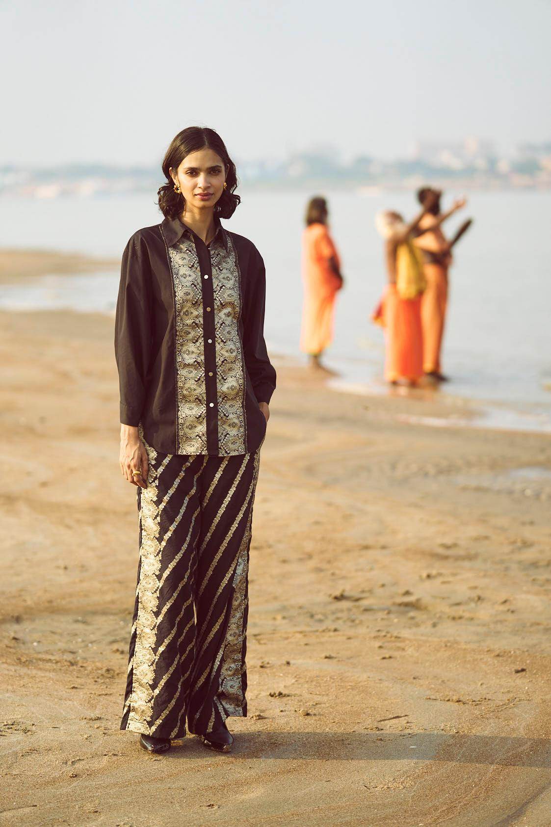 Black cotton poplin shirt with placed chanderi brocade border down the center front. Pleat and fold constructed sleeve and cuff. Metallic button closure at the front and cuffs. Paired with black wide legged pants with allover patterend gold chanderi lurex brocade fabric. Placed border down the sides of the pants. Elasticated at the back. Hook and zip closure at the back. Pockets on the side. The pant is fully lined.