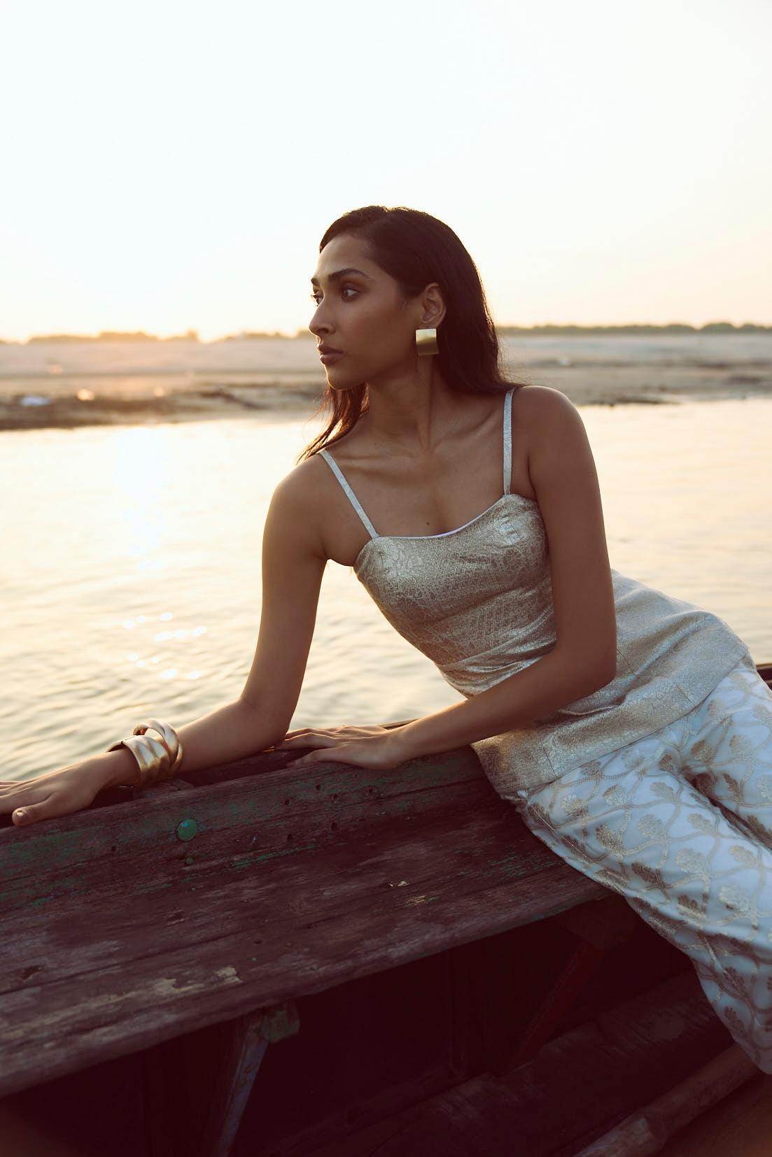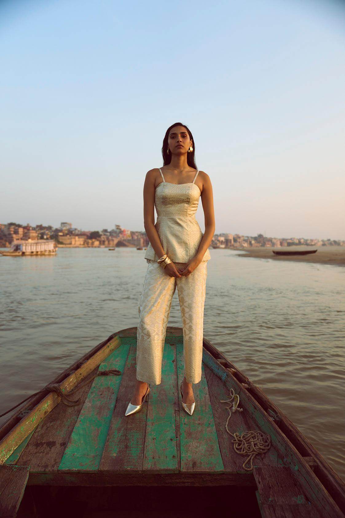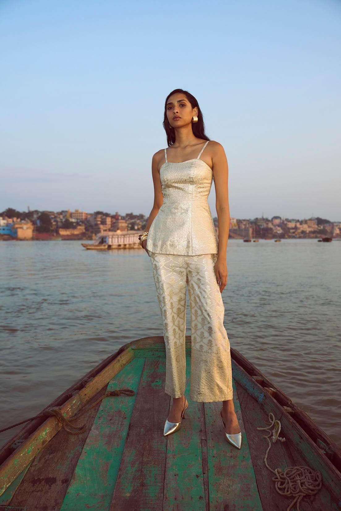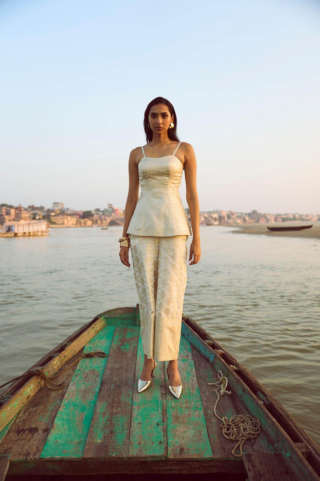 Off-white corset top made of placed brocade borders champagne lurex chanderi fabric. Peplum style off-shoulder top with a sweetheart neckline. Comes with adjustable, detachable straps. Zip closure at the back. Paired with matching brocade chanderi wide-legged pants. Placed border at the hem. Hook and zip closure at the front. Semi elasticated at the waist. Both garments are fully lined.