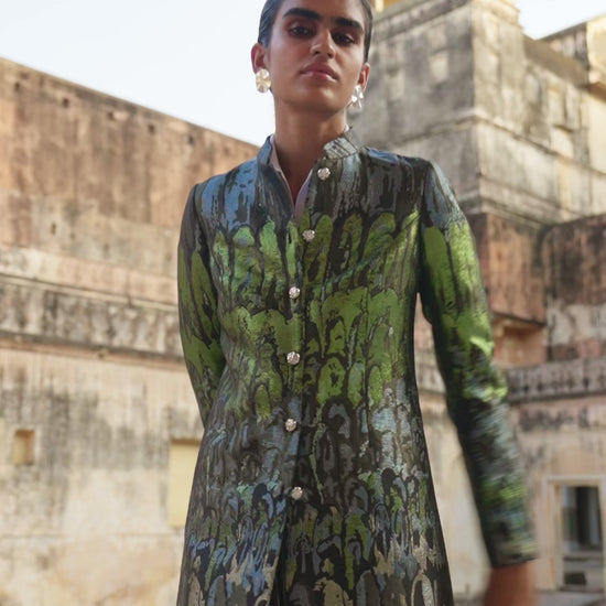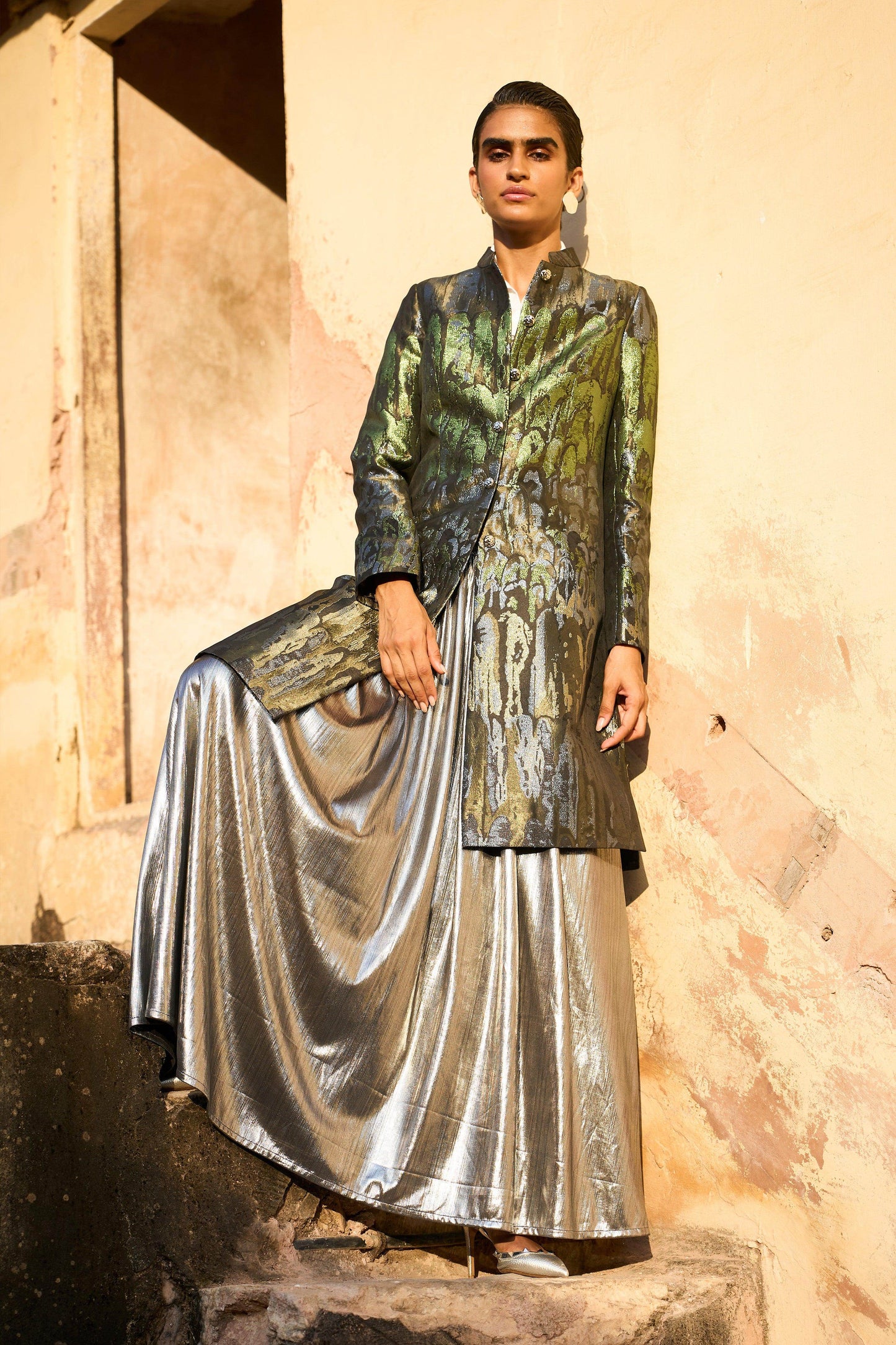 Ombré pattern structured longline jacket in soft brocade. Graded tones of green, pewter and gold. Full sleeve, band collar. Hammered metal silver buttons in the front. Garment is fully lined. Paired with a silver foil lamé flared skirt in flowy fabric. Exaggerated smocking detail at the high waist accentuating the fit and flare silhouette.