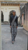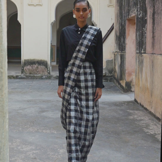 Black organic cotton poplin full sleeve shirt with a high/low front & back hem. Pearl and metal broach pin attached to the front neck and collar. Concealed placket. Full sleeves with notched cuffs and metal button closure. Relaxed fit. Paired with a draped and wrapped straight cut maxi-skirt with hand applied pleats in a shimmering metallic and black check pattern. Free flowing pleated panel with soft raw edge hems wraps around the waist and over the shoulder in a sari-inspired drape detail. Zipper in the side. Garment is fully lined.