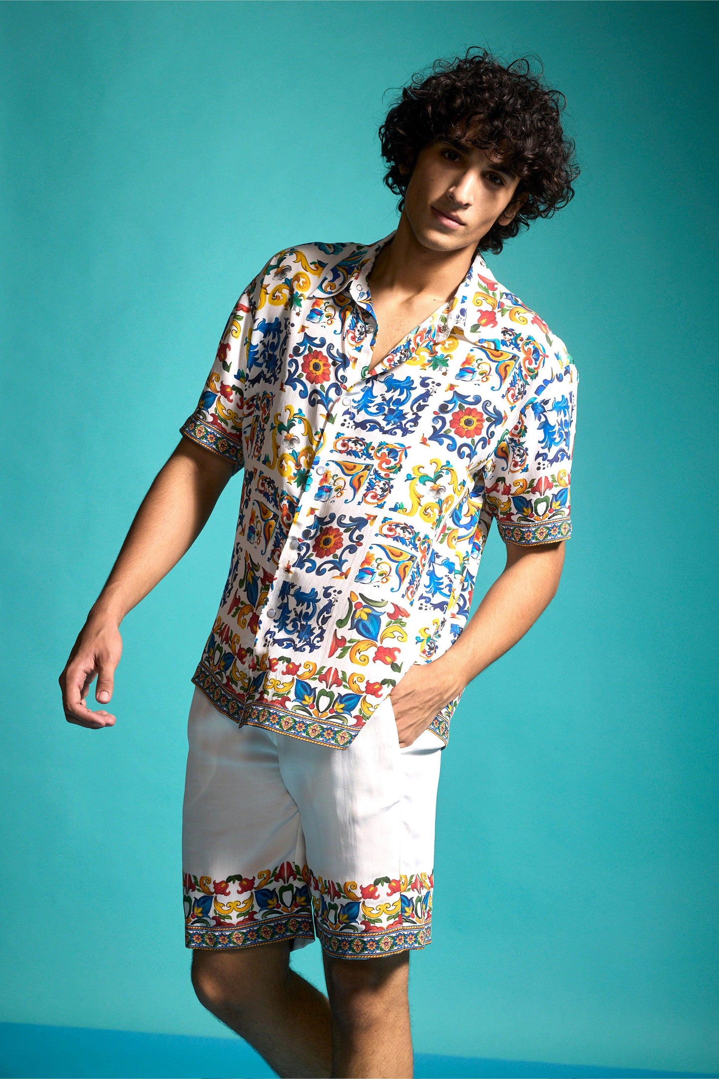 Boxy shirt in breathable viscose fabric with an allover print inspired by hand-painted Mediterranean tiles. Features snap buttons in the front, an inverted box pleat at the back, and half sleeves. Paired with Border-printed shorts inspired by hand-painted Mediterranean tiles. Elasticated waistband with hook-and-eye and zip closure. Side and back pockets. Fully lined.