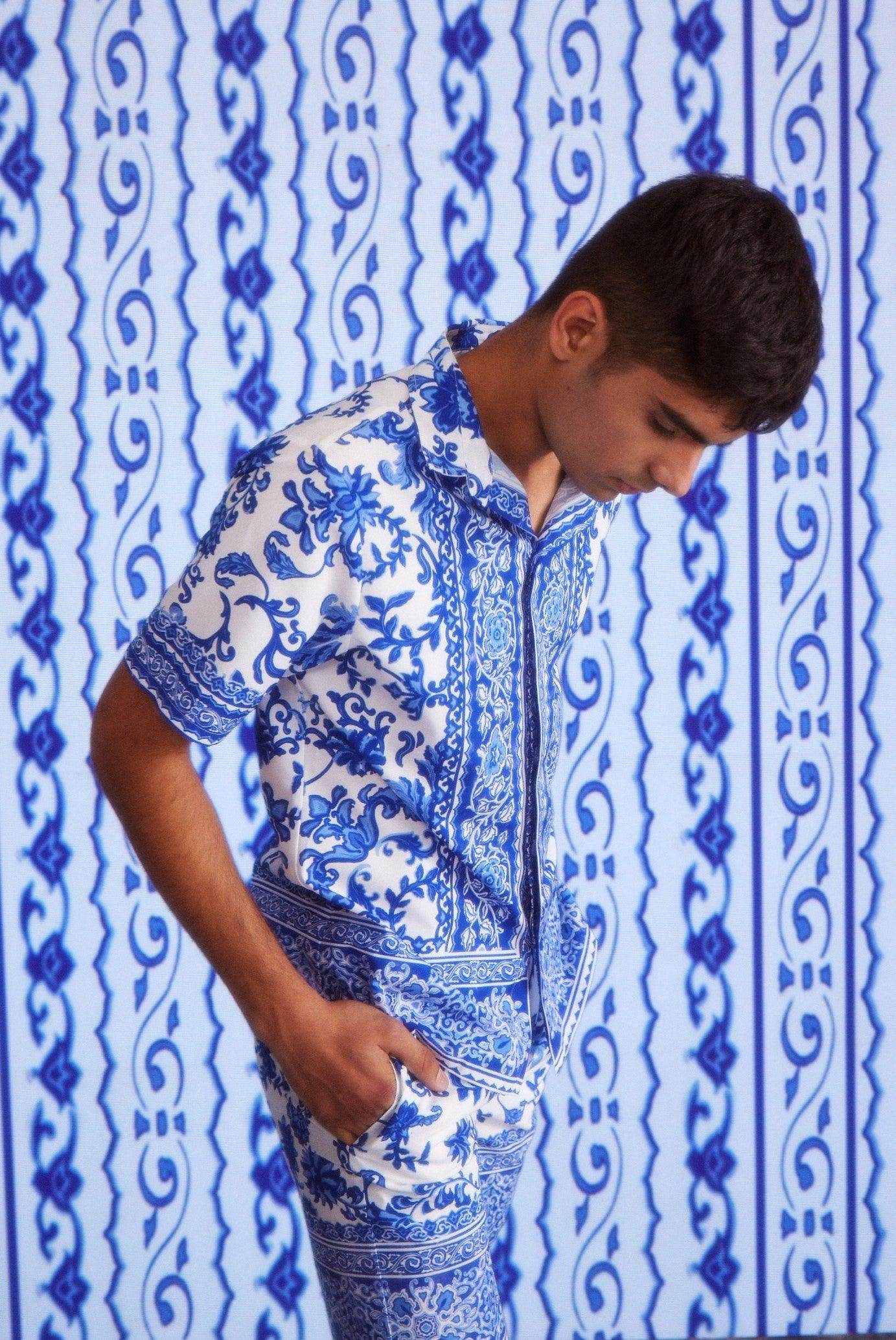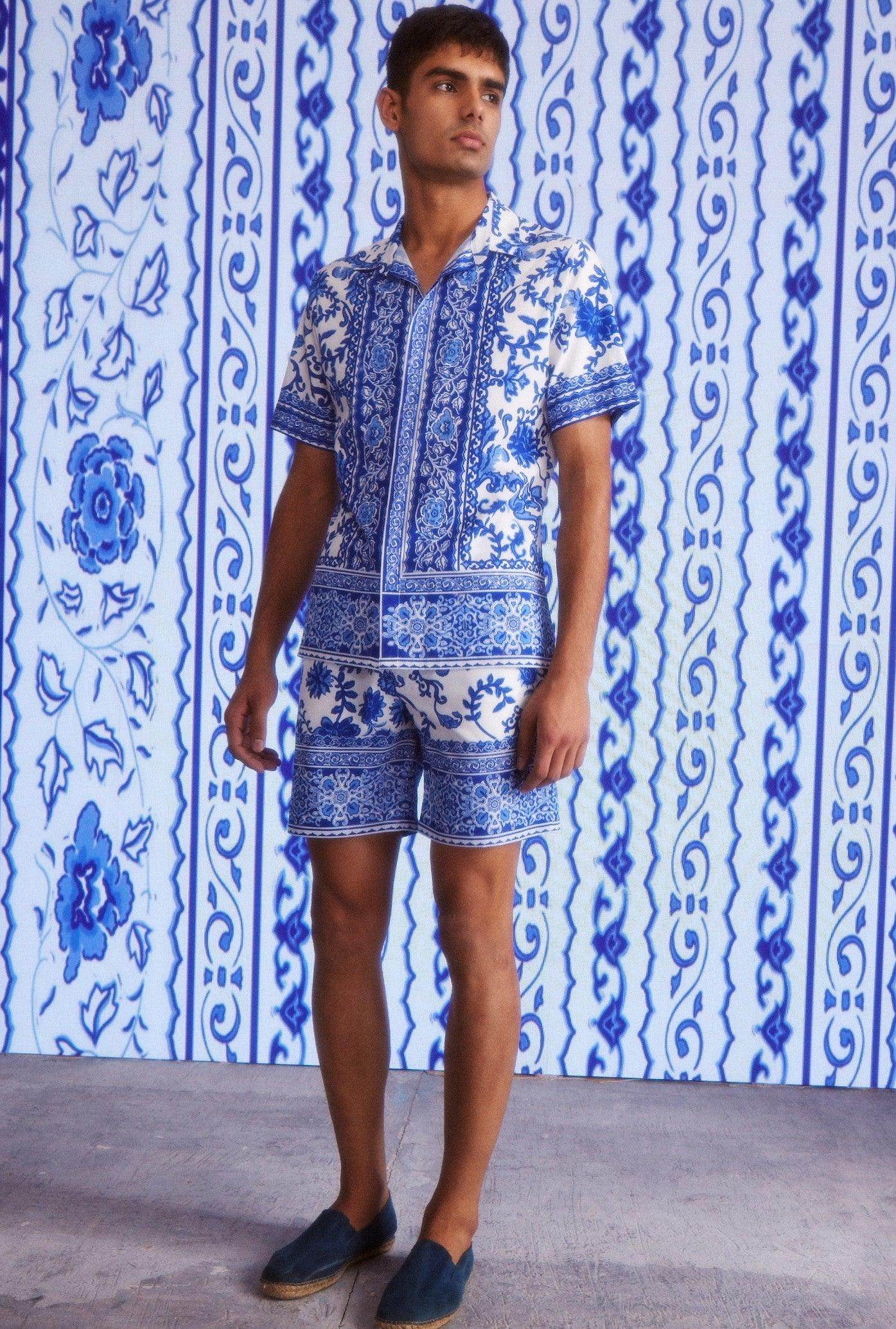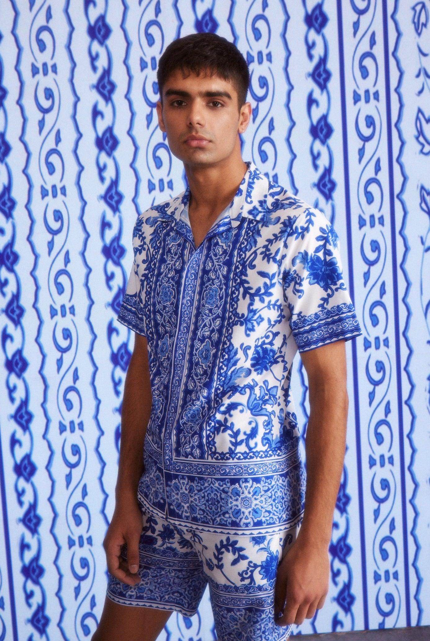 Blue on white floral ceramic inspired printed half sleeve shirt. Placed borders around the center placket, sleeves cuff and the bottom hem. Button-down half sleeve shirt with a concealed placket.