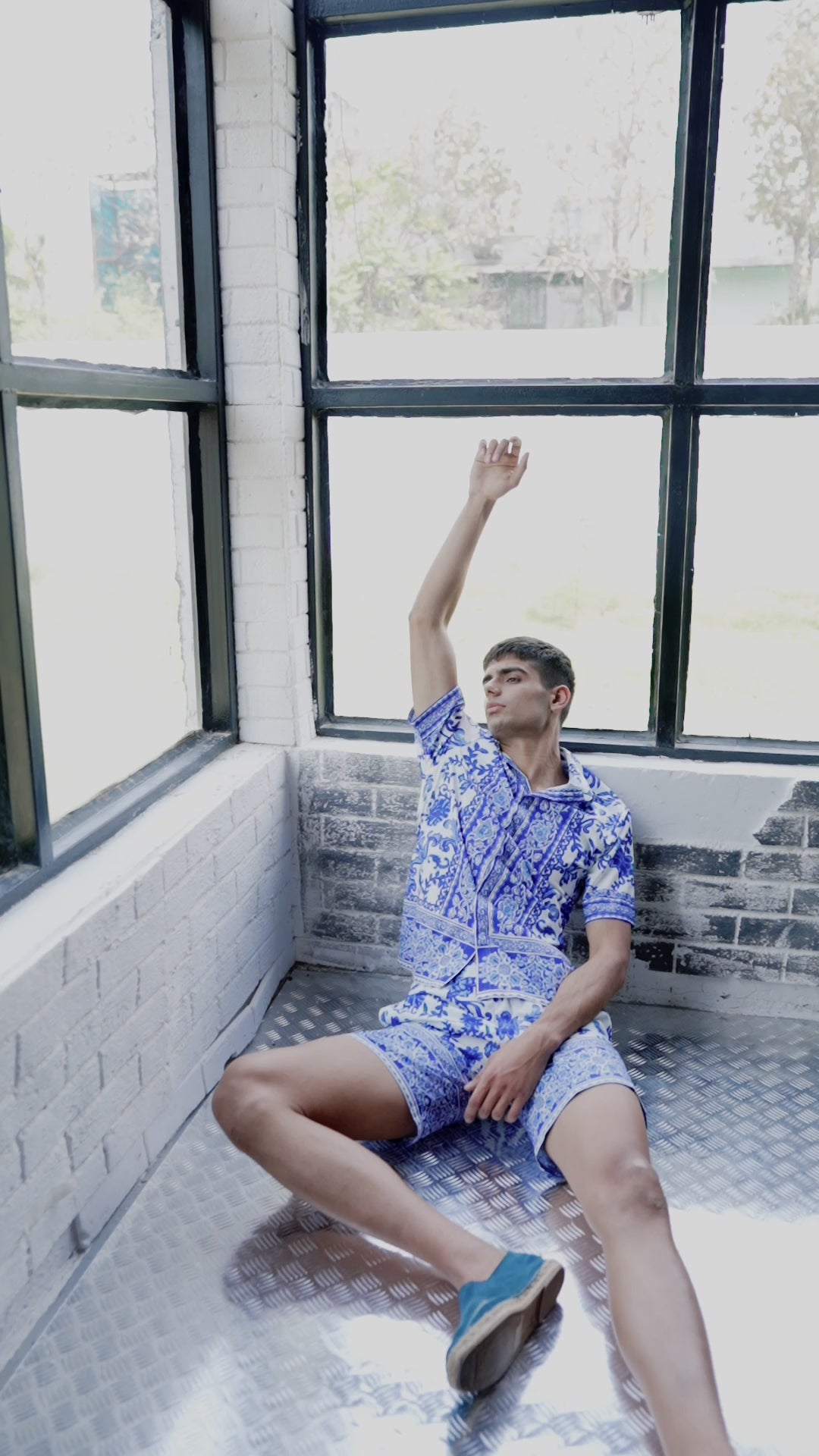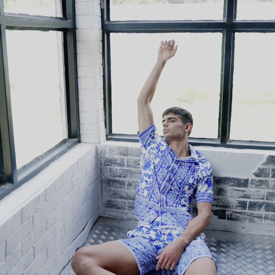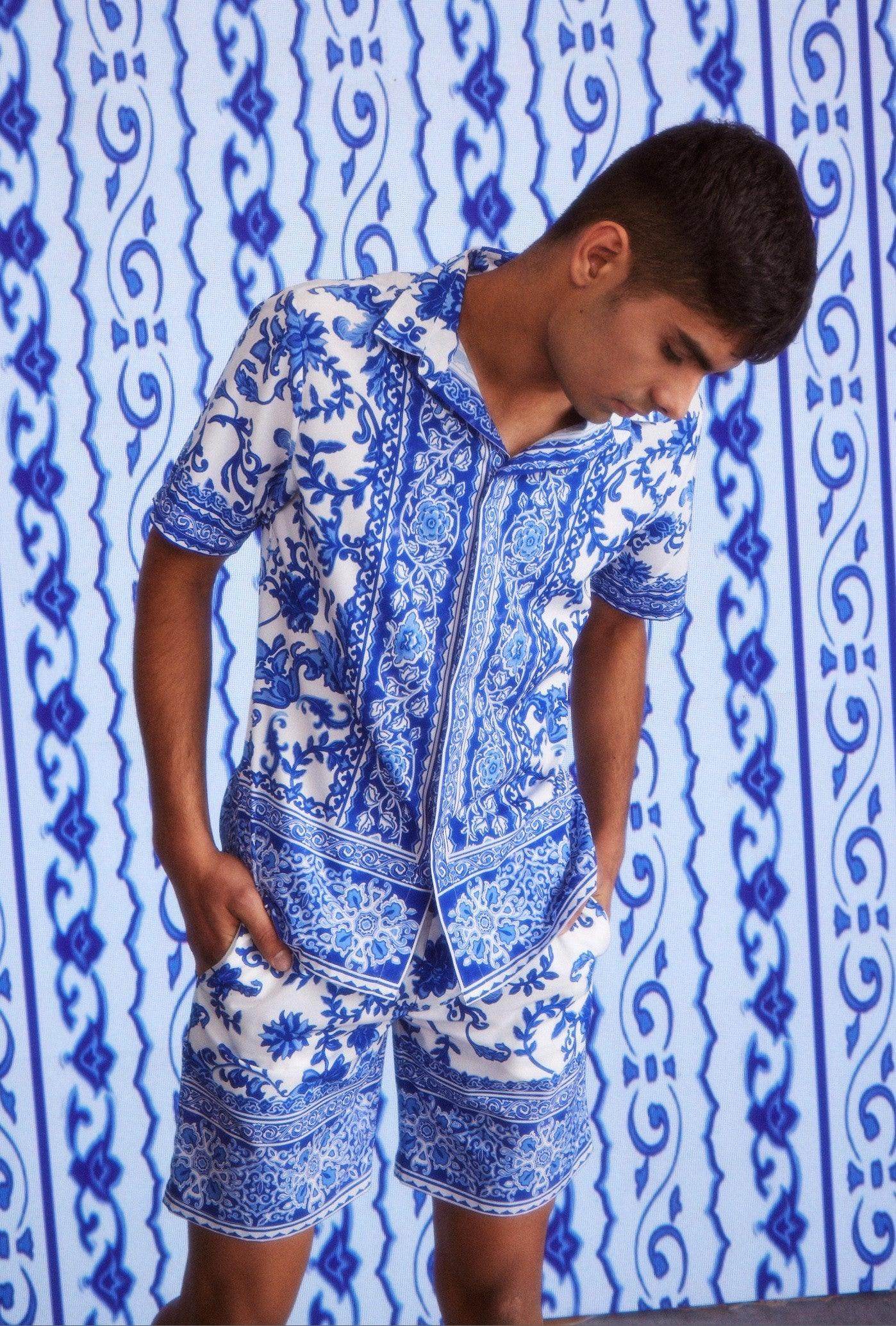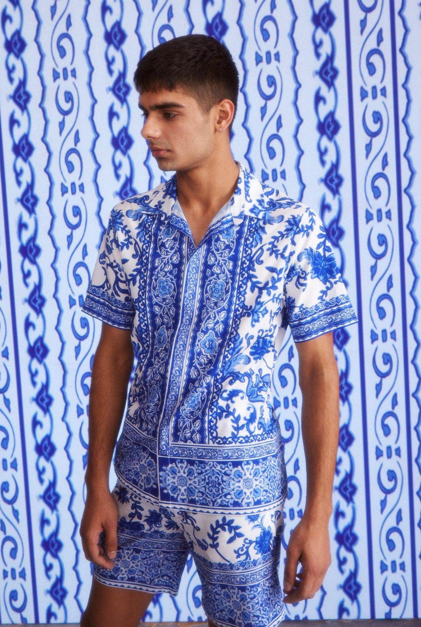 Blue on white floral ceramic inspired printed half sleeve shirt. Placed borders around the center placket, sleeves cuff and the bottom hem. Button-down half sleeve shirt with a concealed placket.