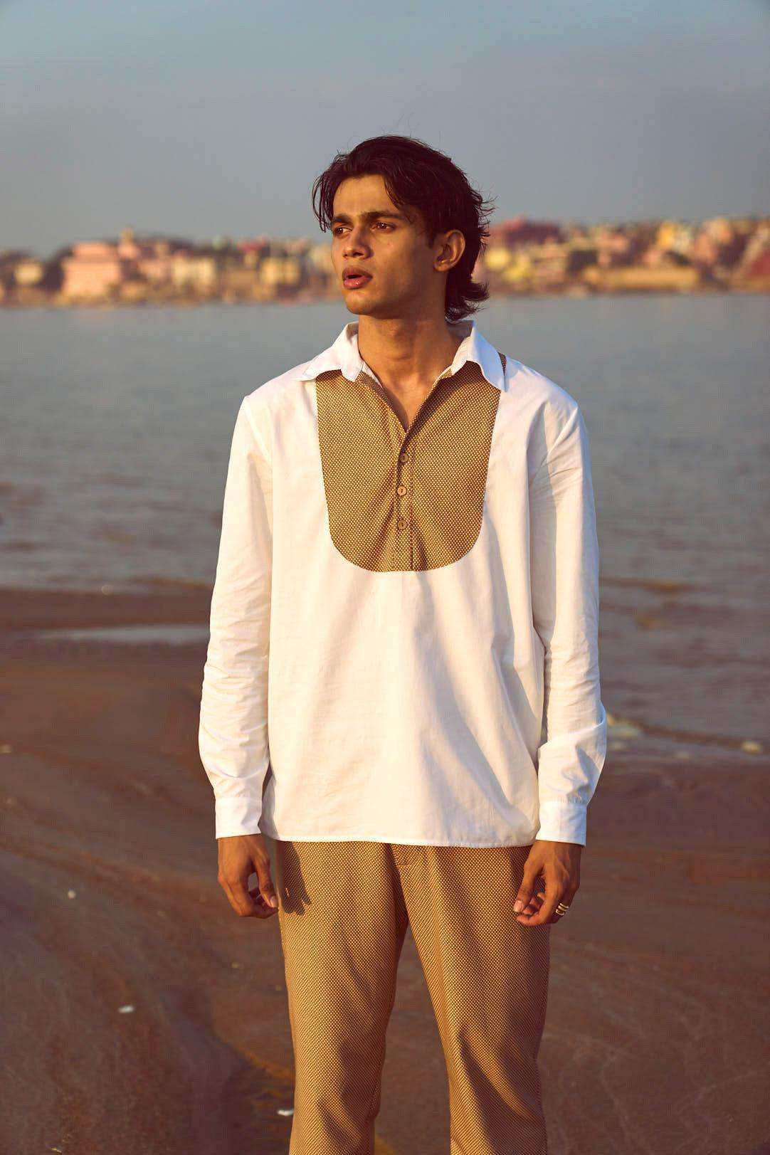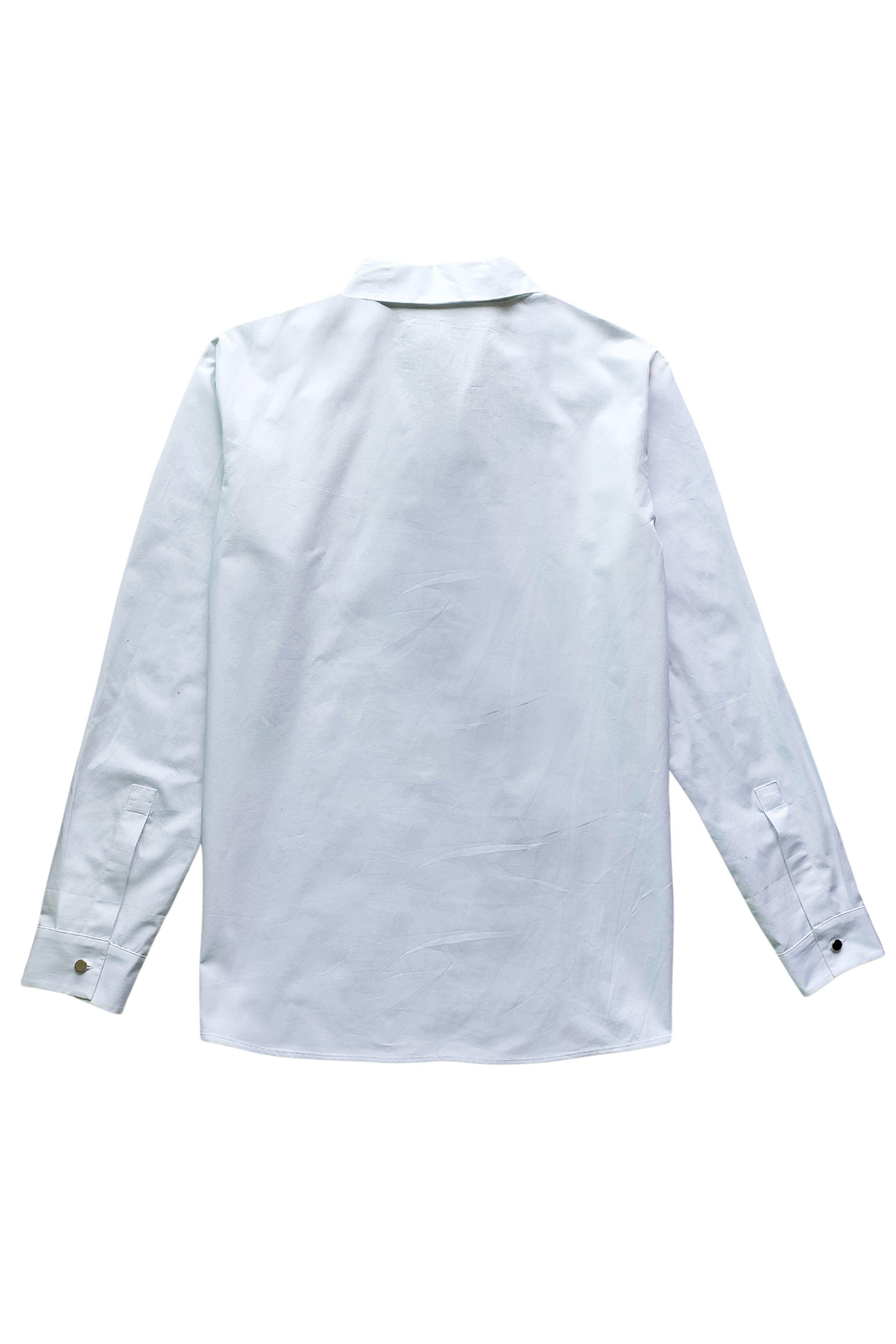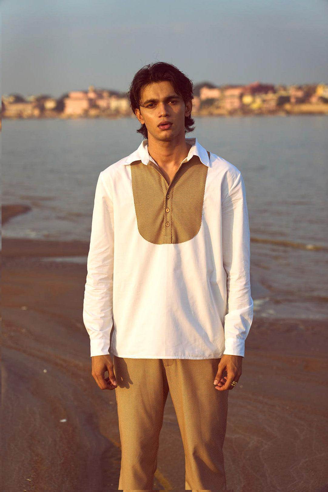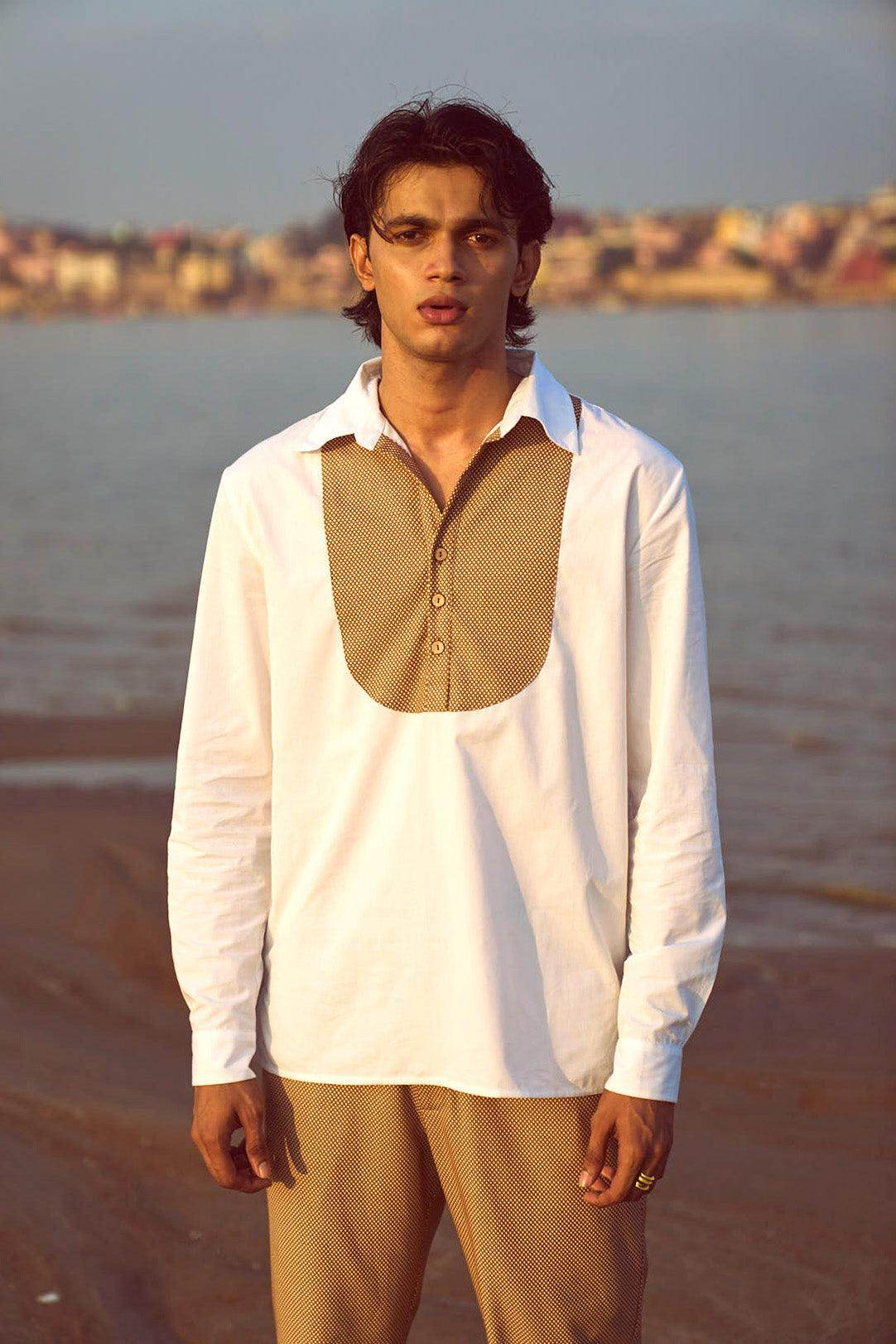 White popover shirt in cotton poplin. Khaki and white textured bib detail. Vents on the sides. Full sleeves. Wooden buttons in the front, metal button closure at the cuff. Relaxed fit.