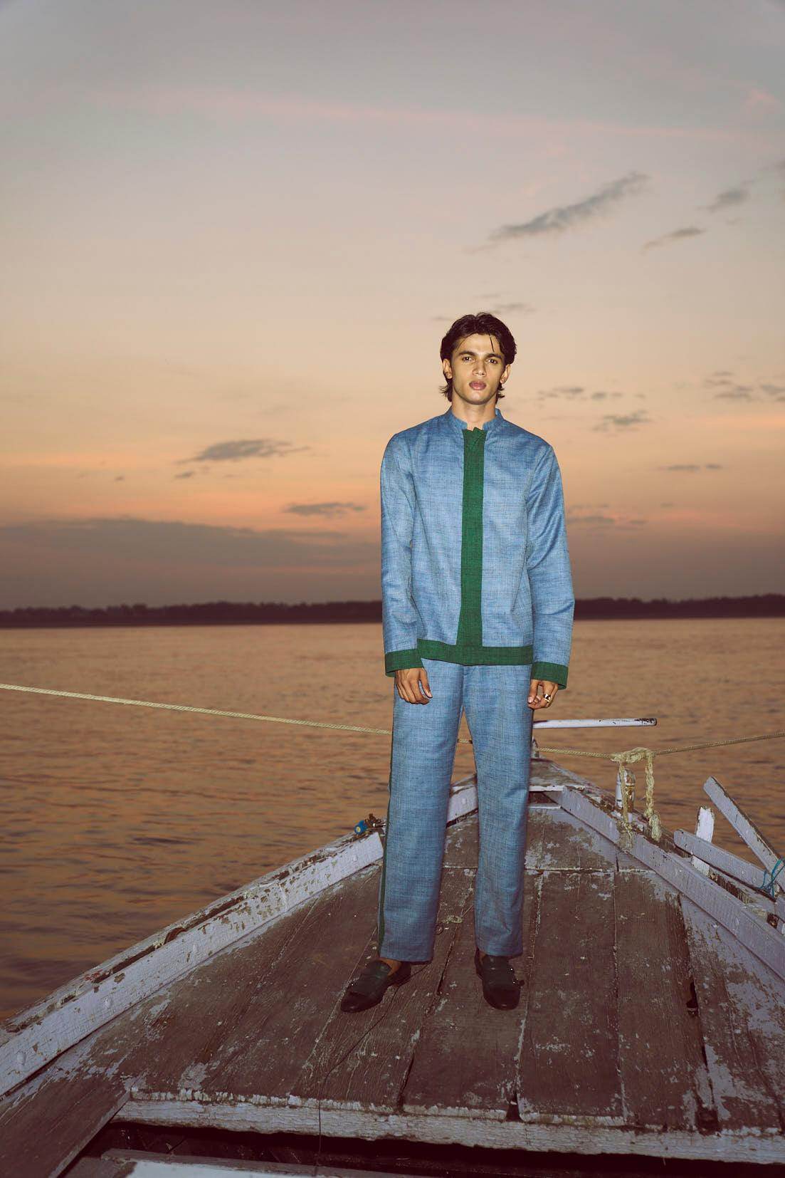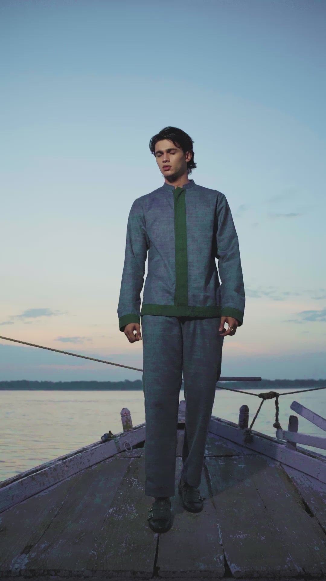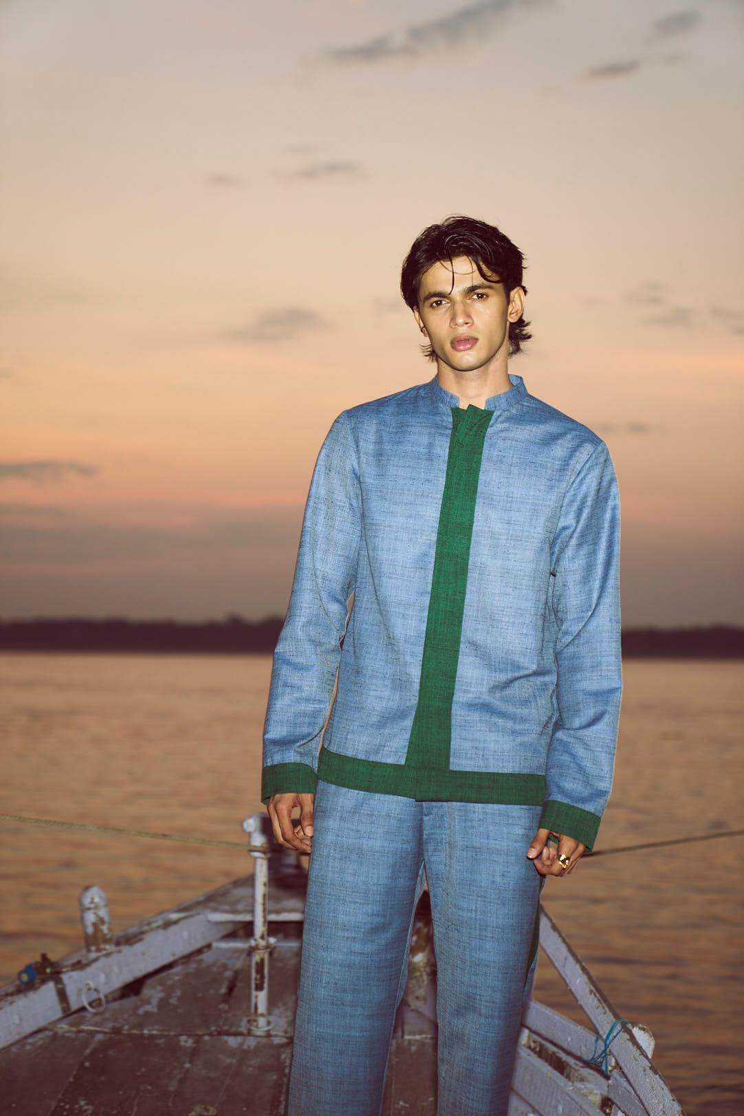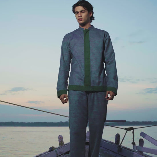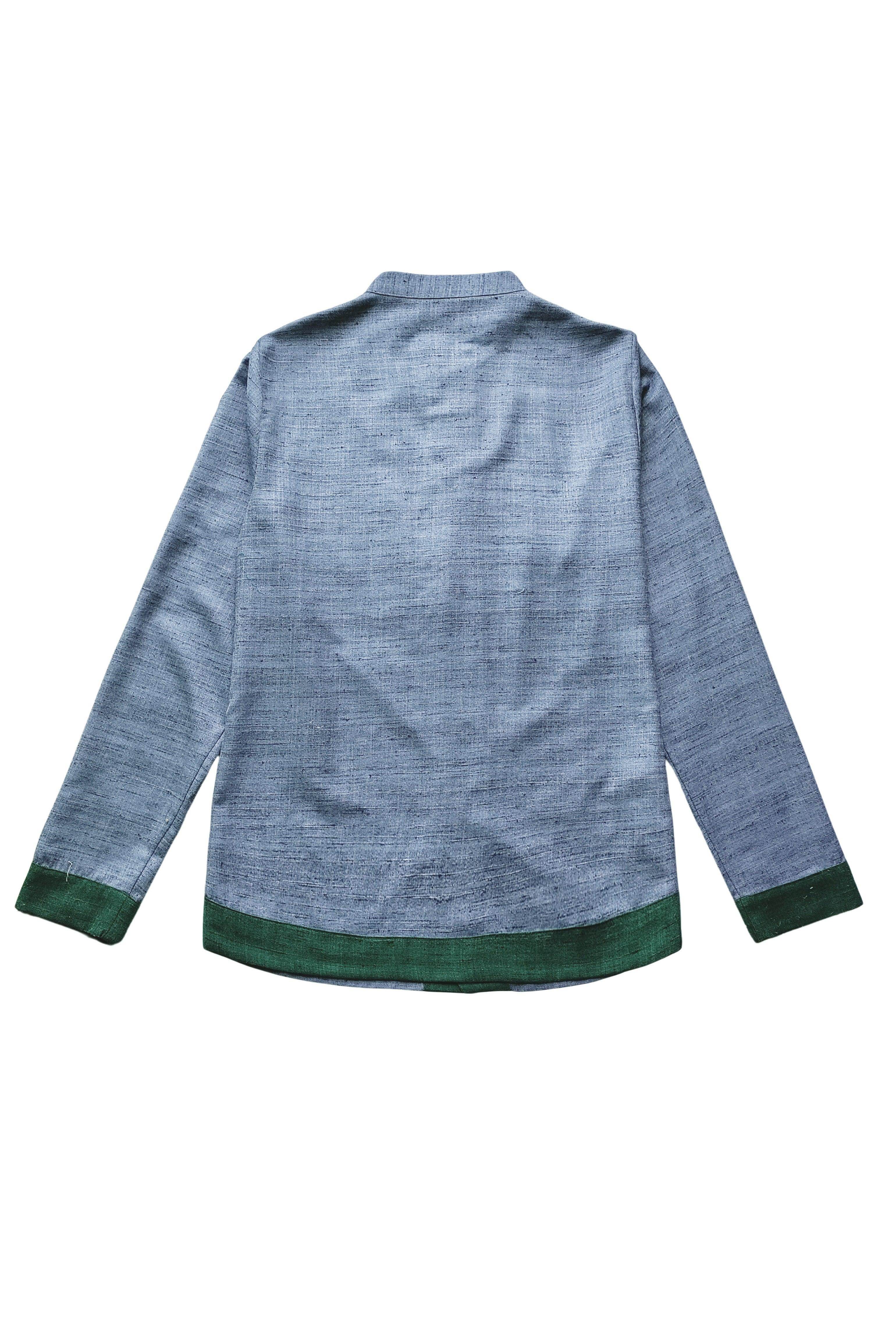 Chambray full-sleeve shirt in matka-inspired textured slub fabric. Contrasting green panel placed at the front placket, bottom hem, and sleeve cuffs. Concealed button placket. Band collar. Regular fit. Vent on the sides.