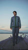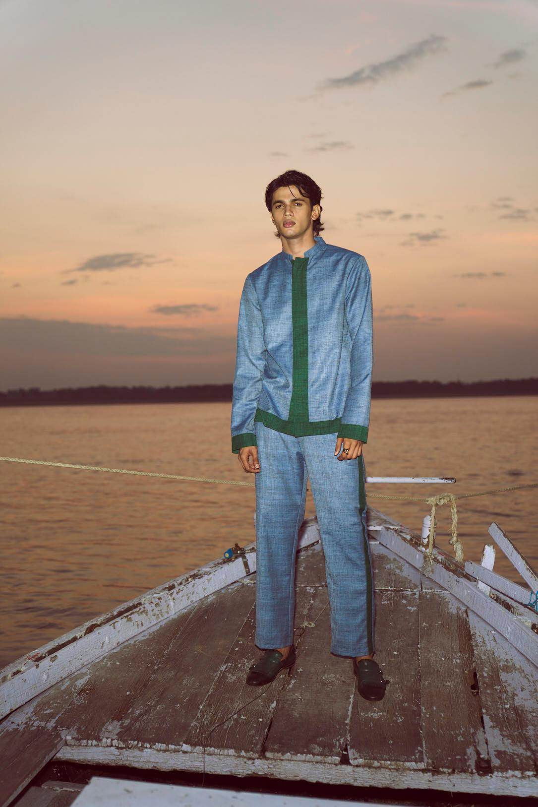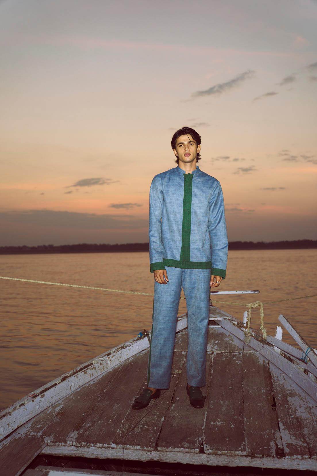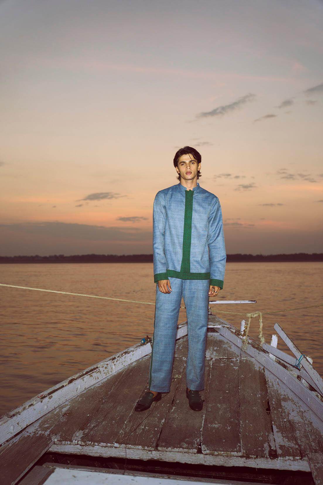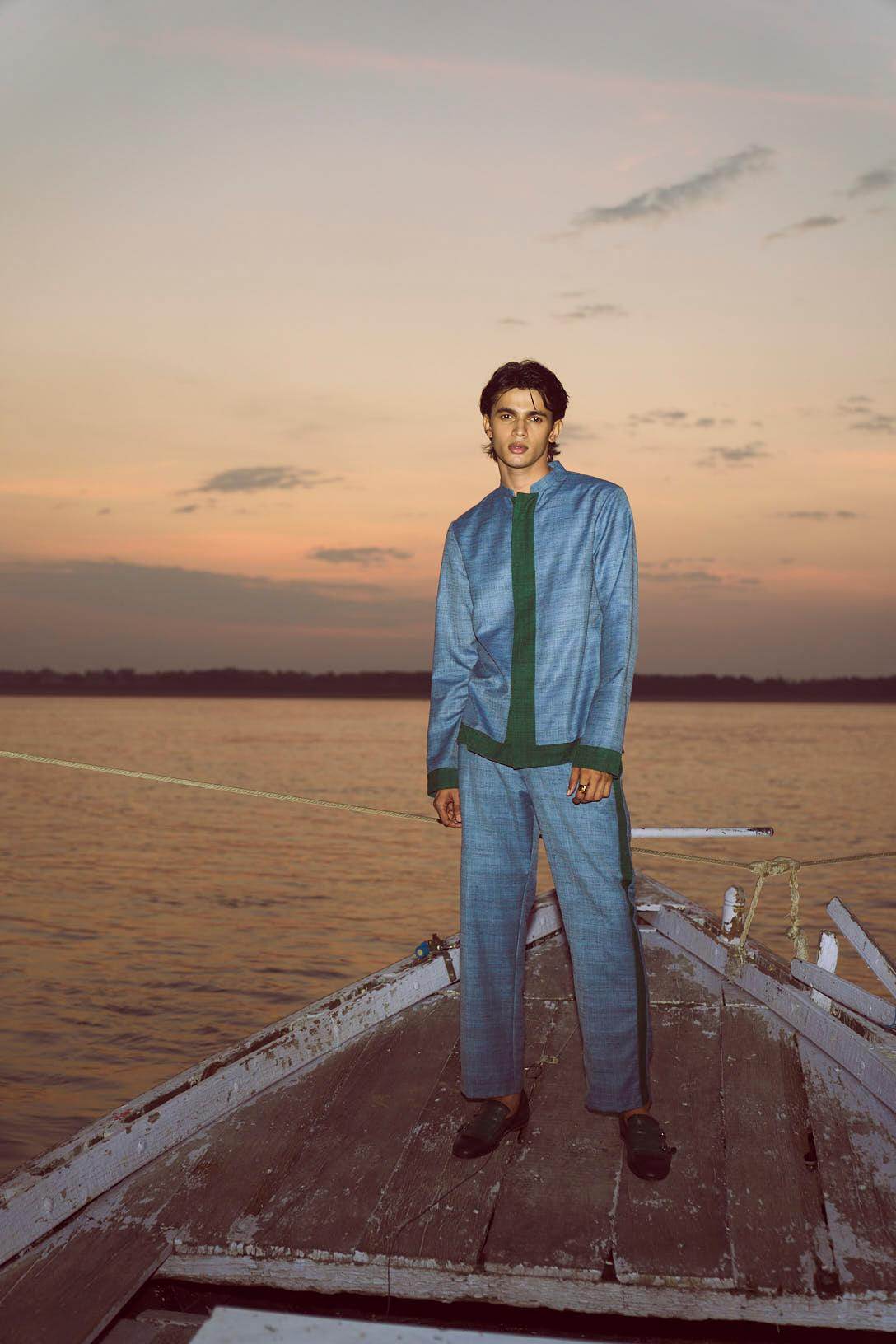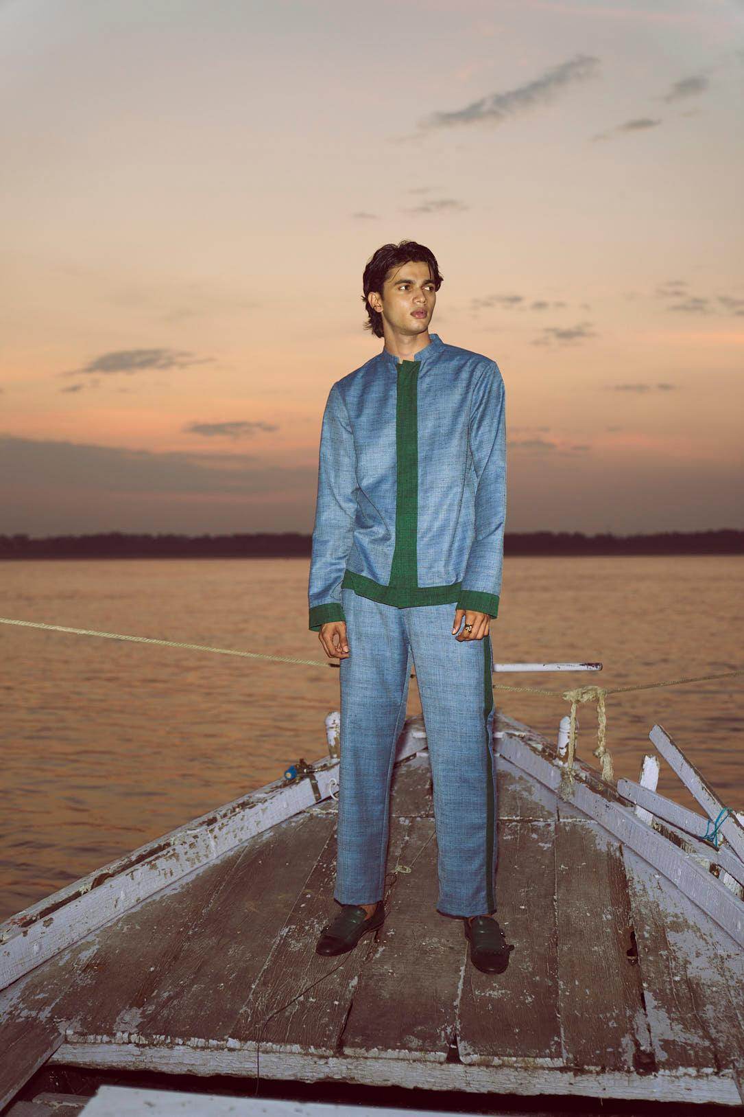 Chambray full-sleeve shirt in matka-inspired textured slub fabric. Contrasting green panel placed at the front placket, bottom hem, and sleeve cuffs. Concealed button placket. Band collar. Regular fit. Vent on the sides.