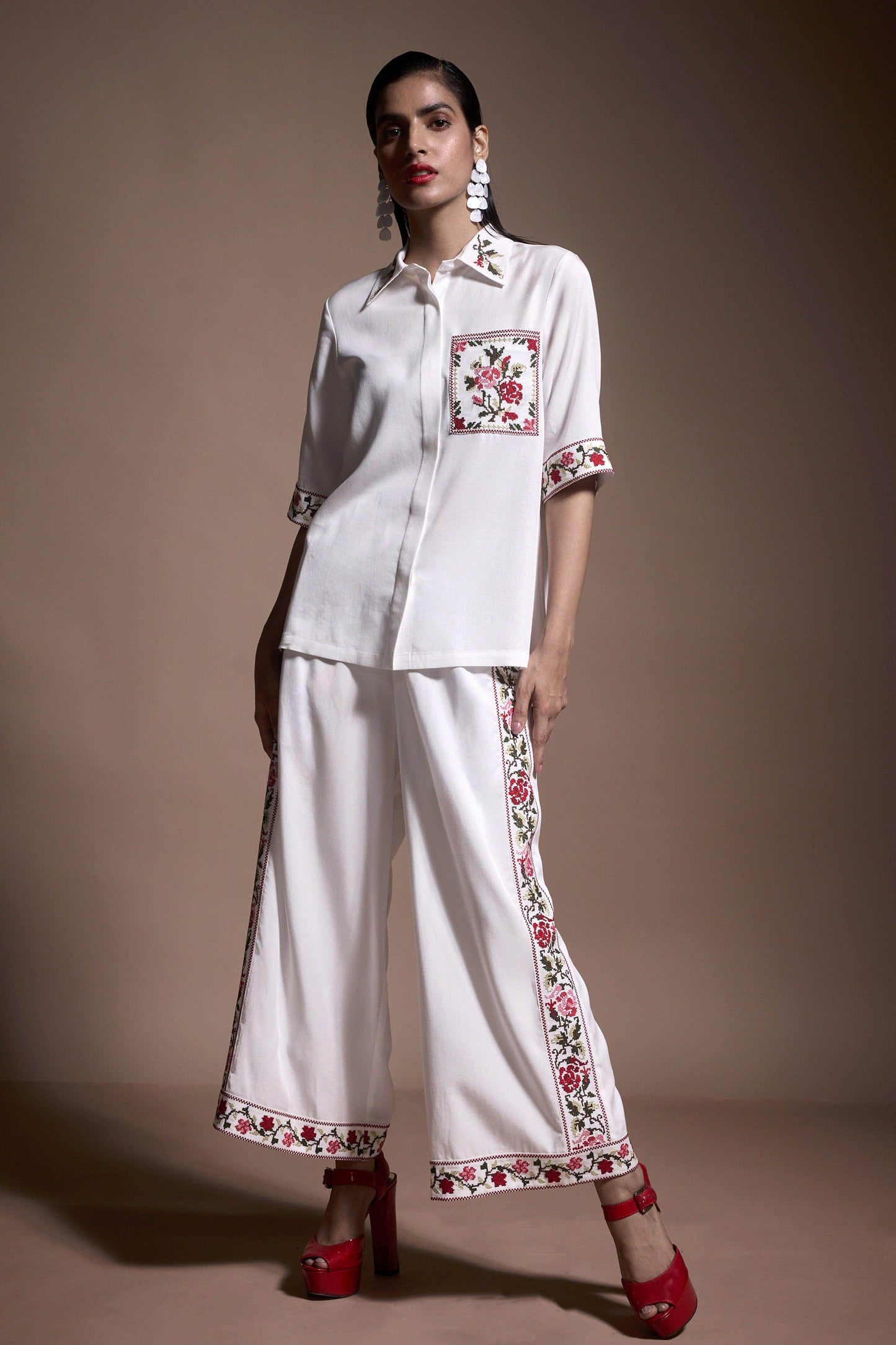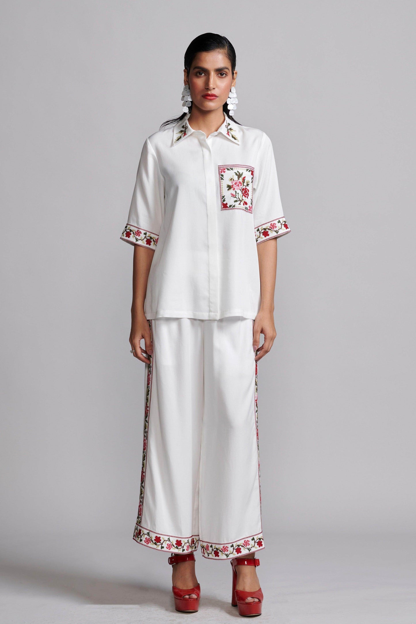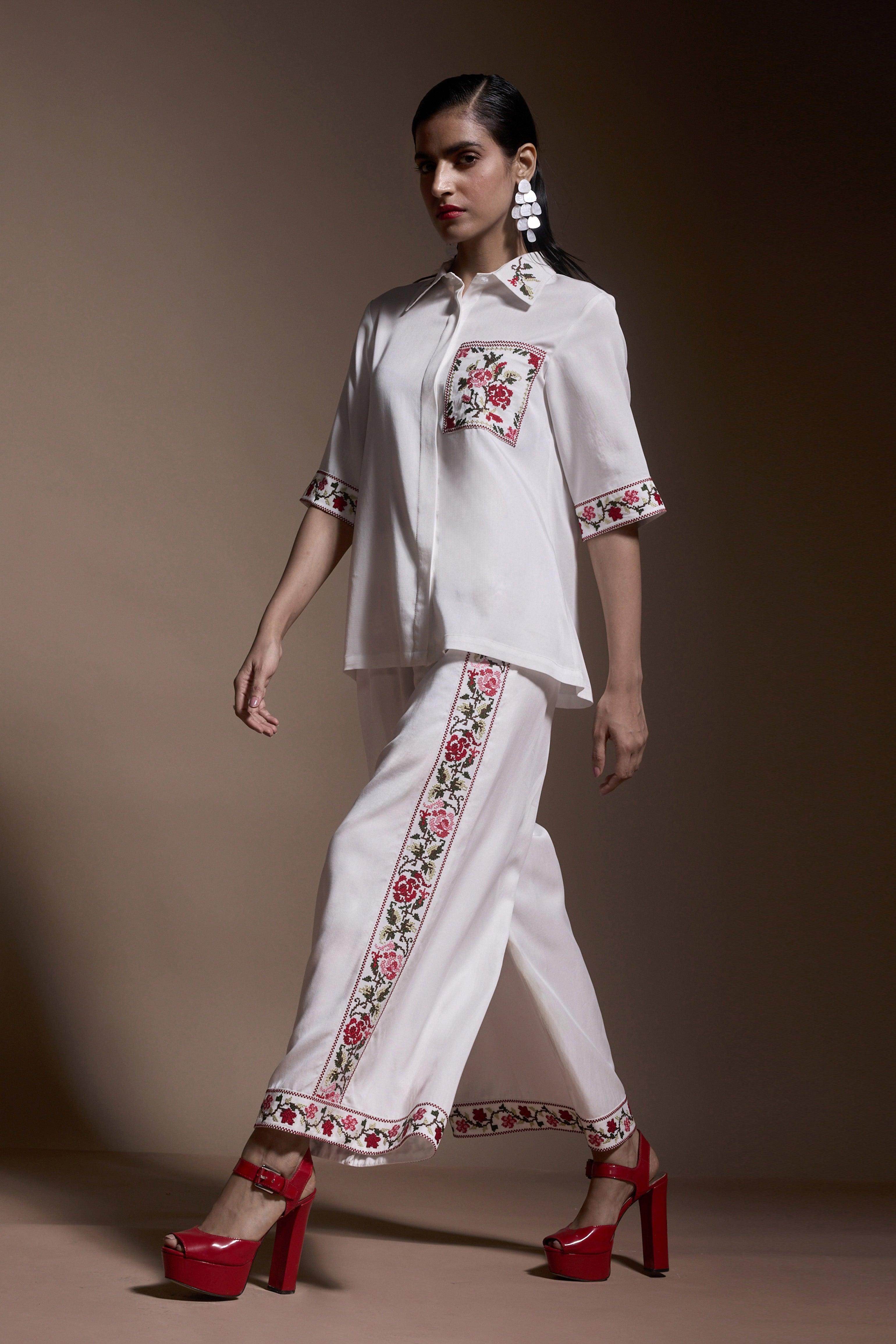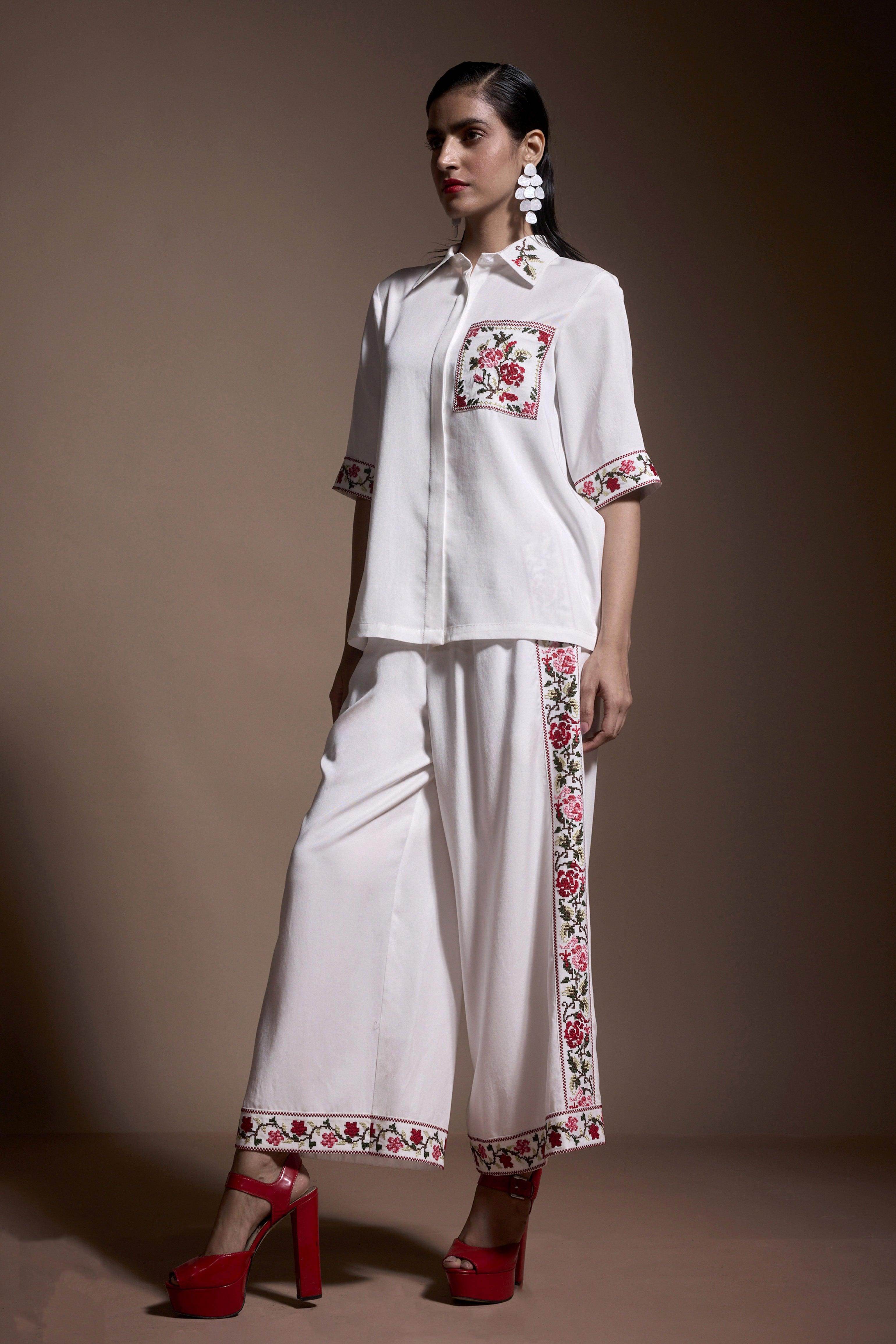 Ivory wide-leg pants with multicolor cross-stitch embroidery on the sides and bottom hem. Elasticated waist, side pockets. Made from sustainable, breathable Tencel.
