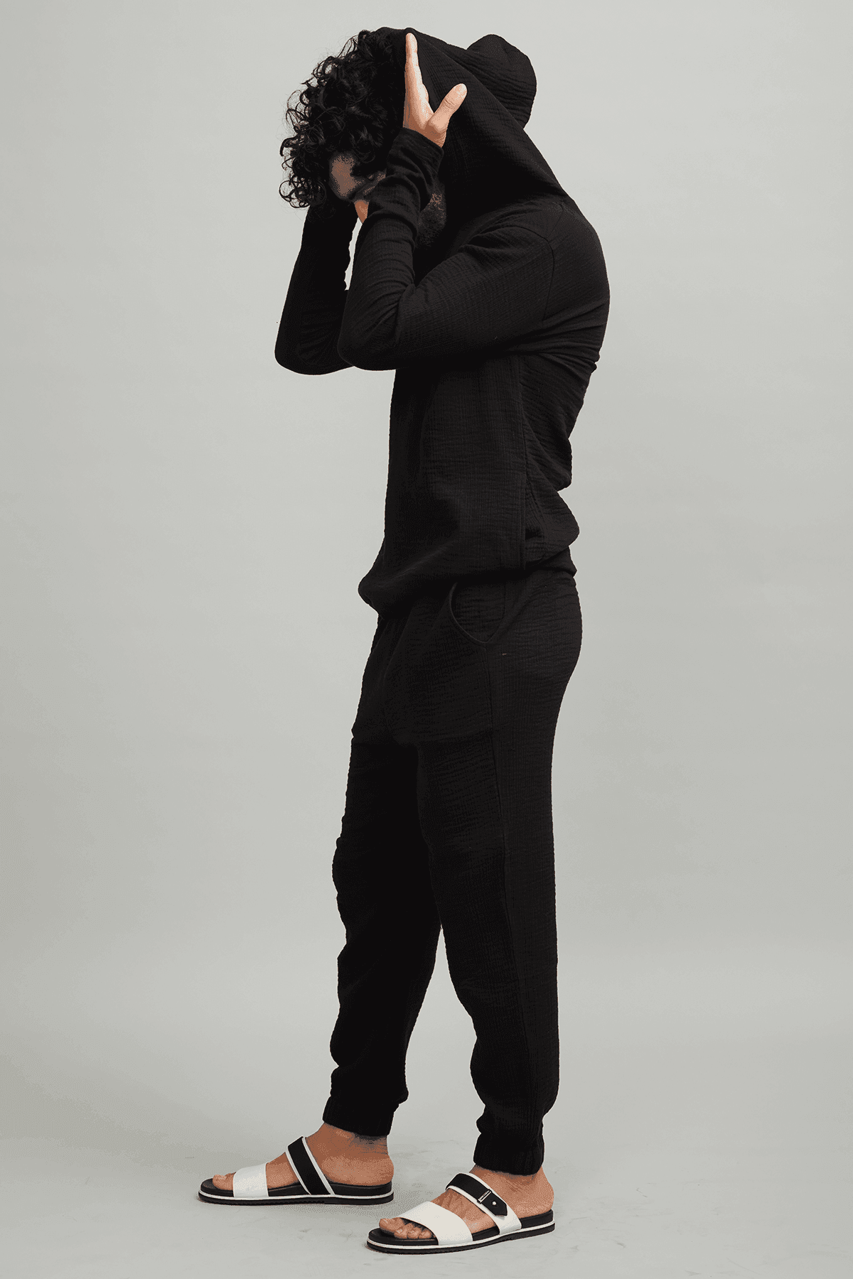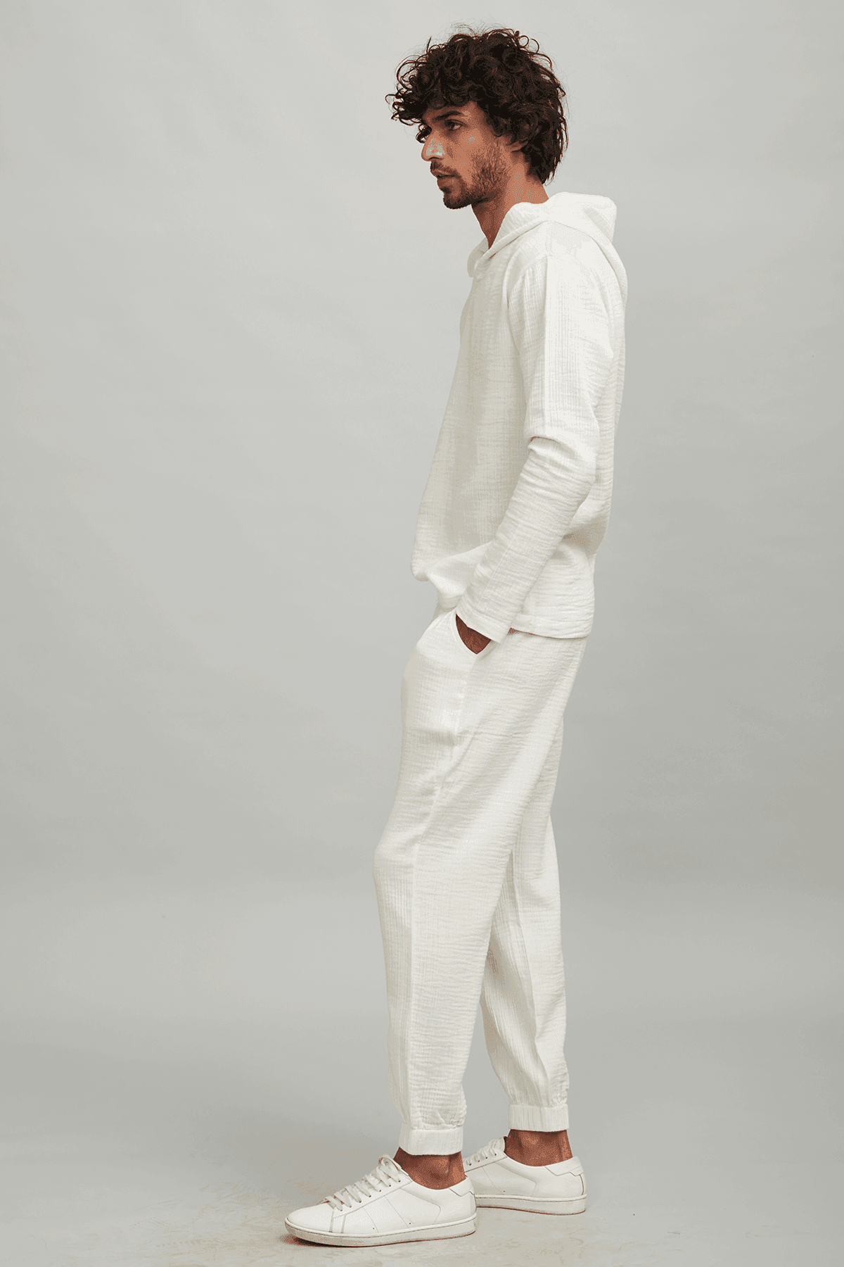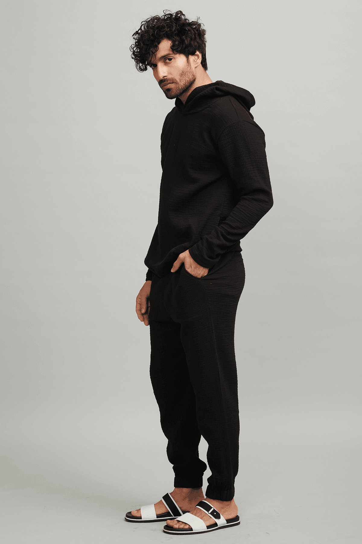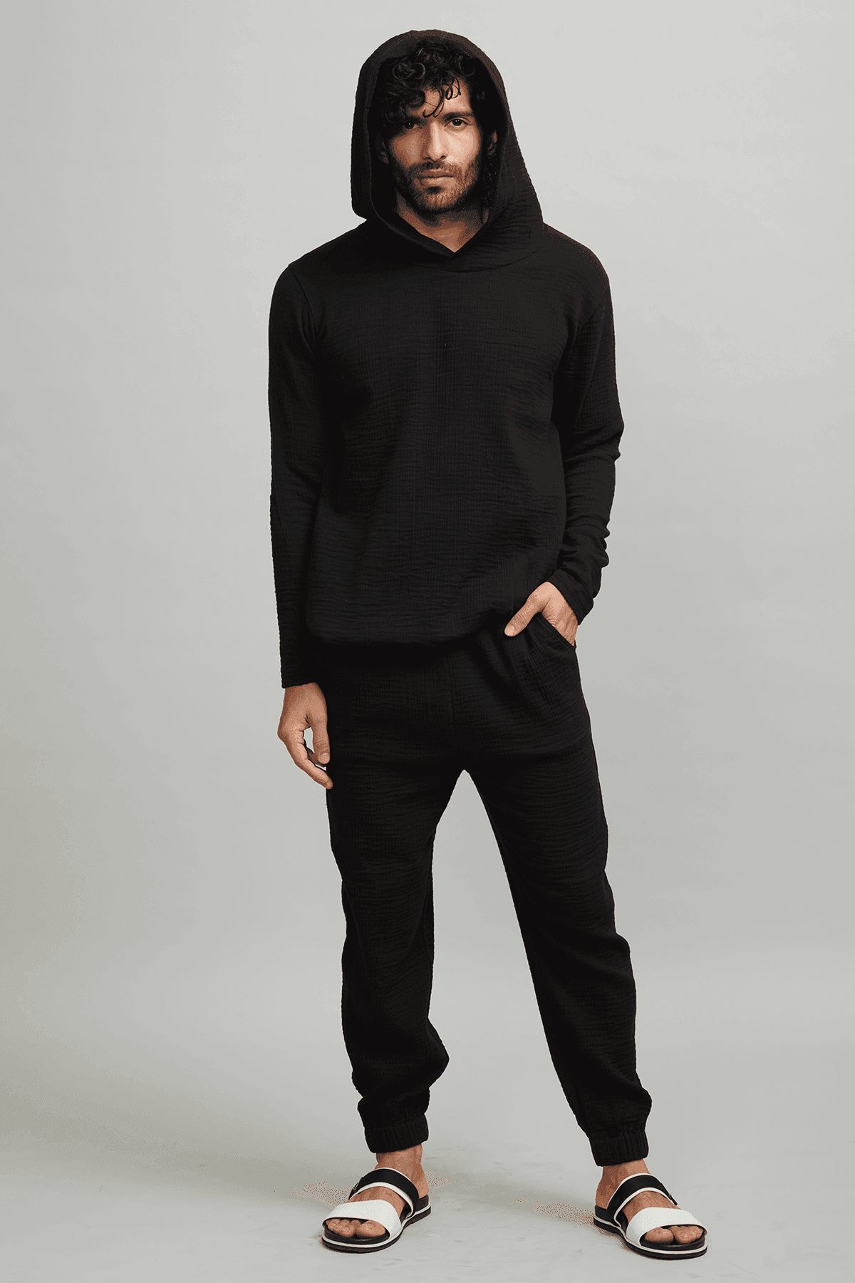 Textured woven crinkle cotton lounge set. Popover hoodie and jogger pant. Comfort fit.
