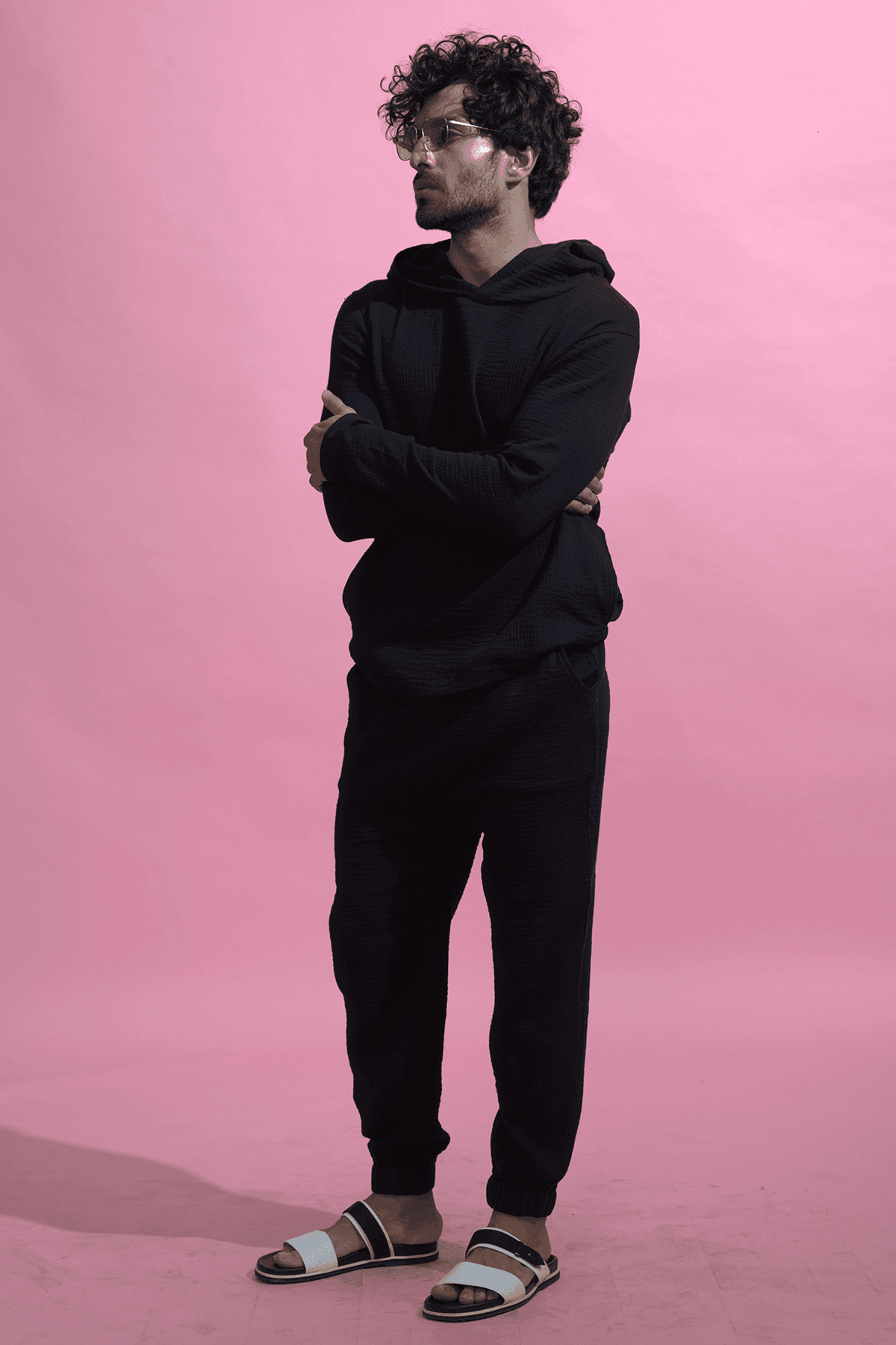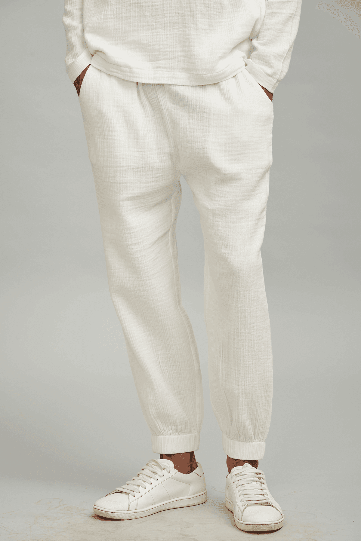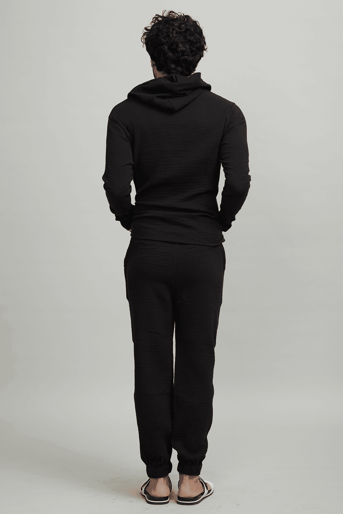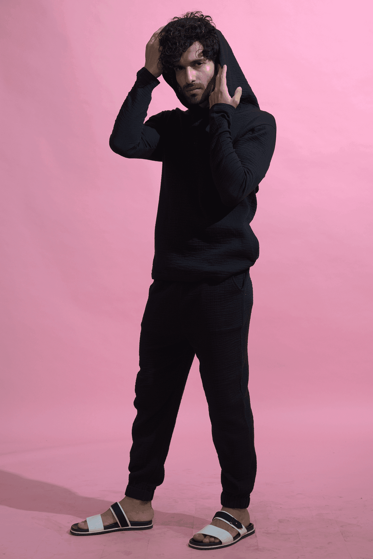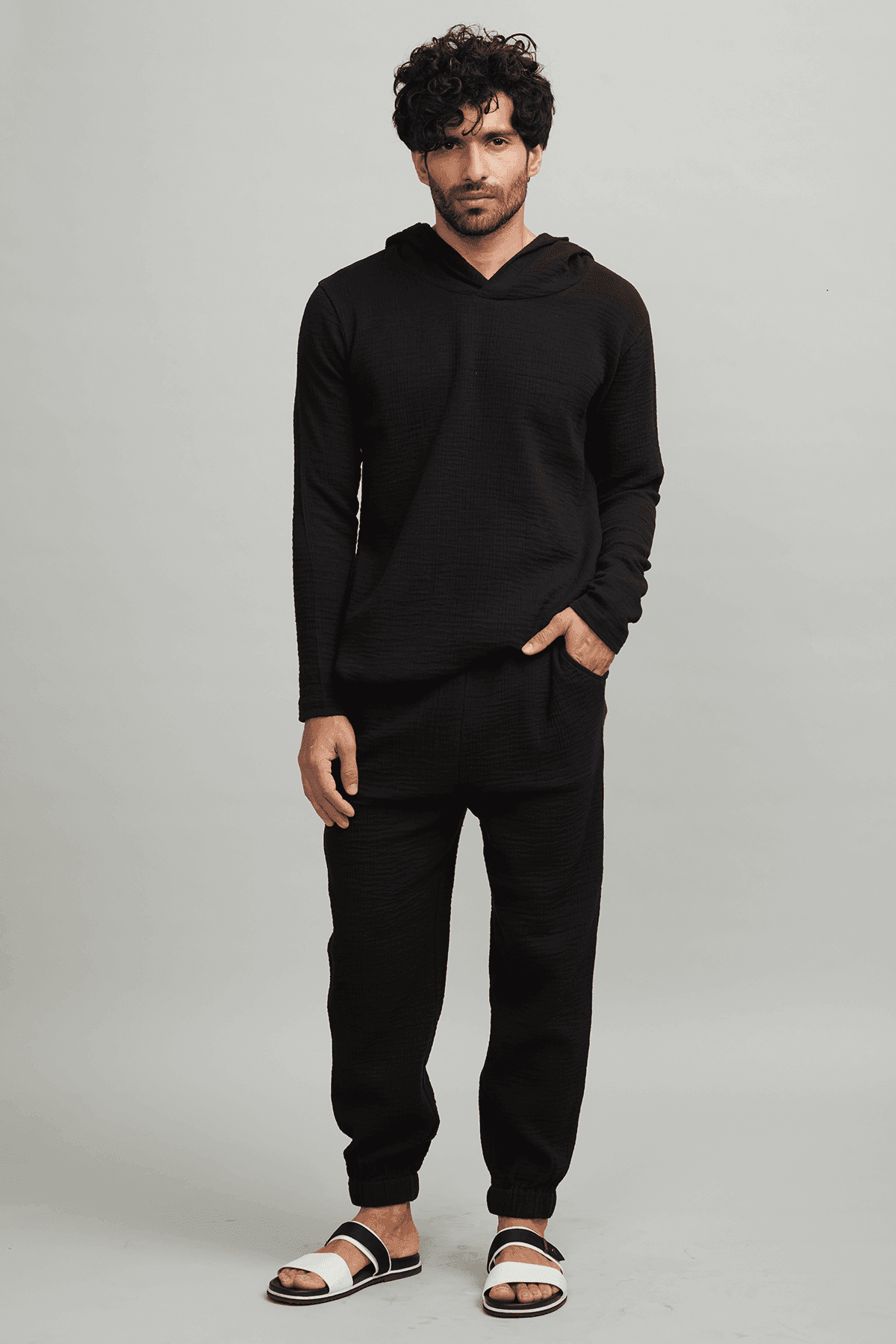Textured woven crinkle cotton lounge set. Popover hoodie and jogger pant. Comfort fit.