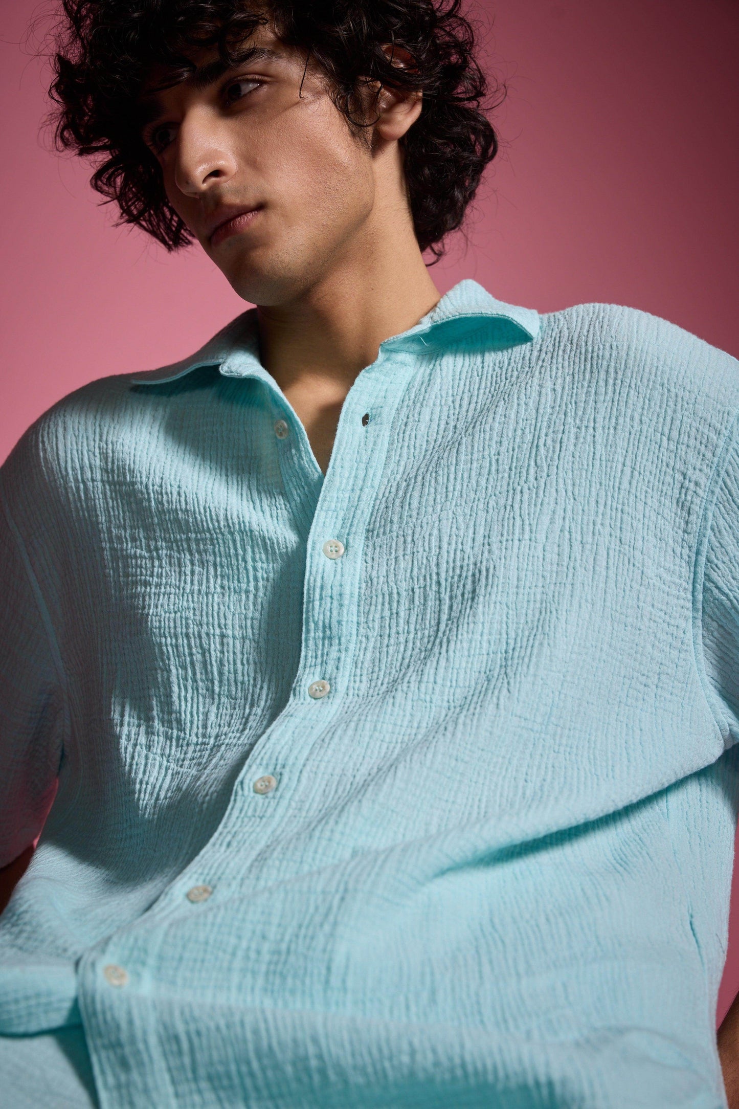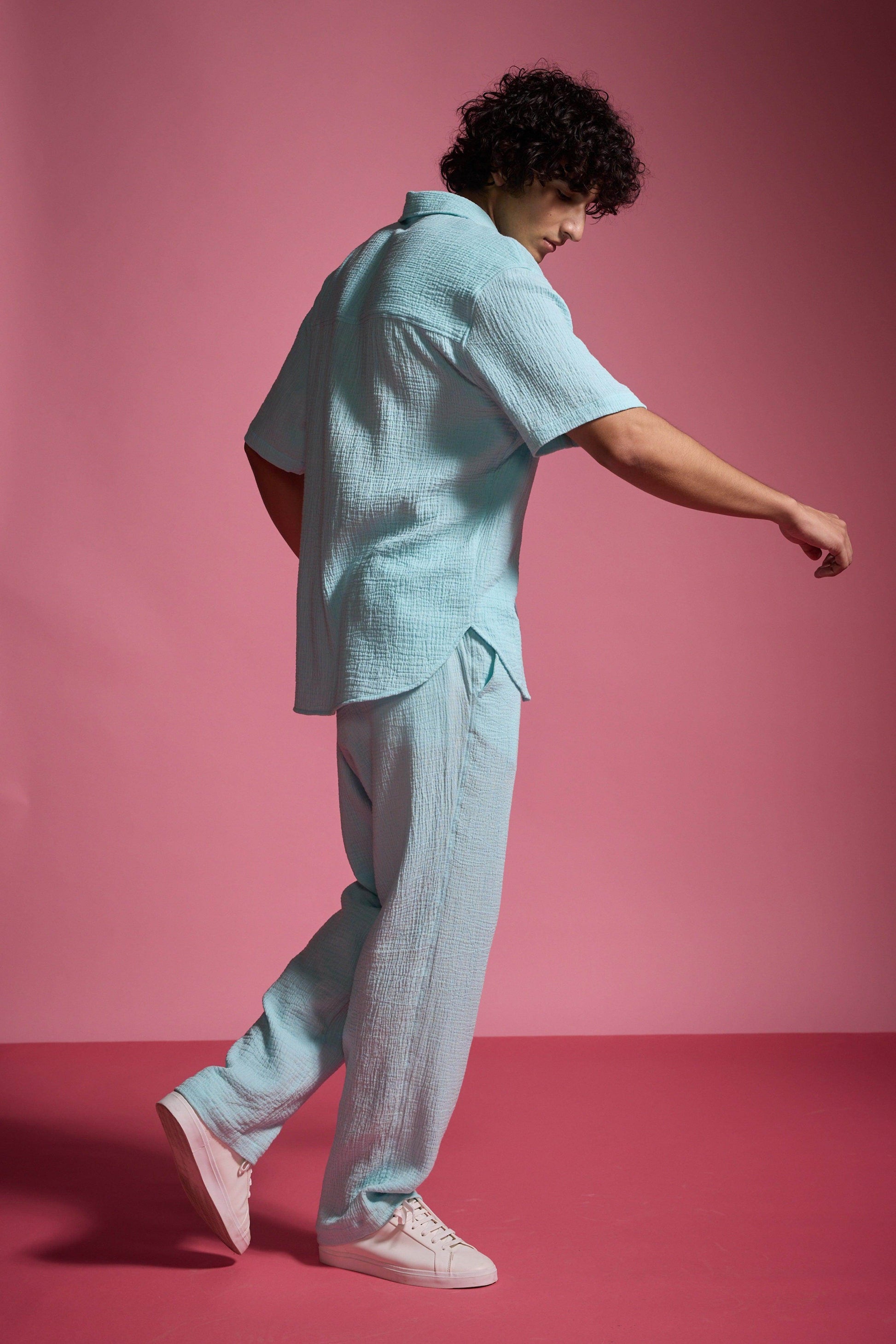 Boxy shirt in textured organic crinkle cotton fabric. Features a button-down placket, curved hem, shirt collar, and half sleeves. Paired with Straight cut pants in textured organic crinkle cotton fabric. Features an elastic waistband with drawstrings, and side and back pockets.
