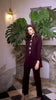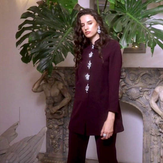 Plum crepe longline blazer with a structured tailored finish. Band collar with show crystal-embellished detailing and a concealed hook/eye closure down the front. Full sleeves with welt pockets at the front. Garment is fully lined. Paired with matching relaxed fit pant with a semi-elasticated waistband. Concealed side zip with hook/eye closure.