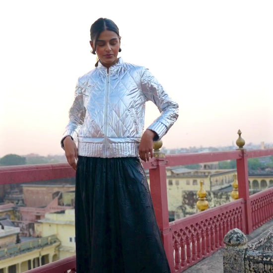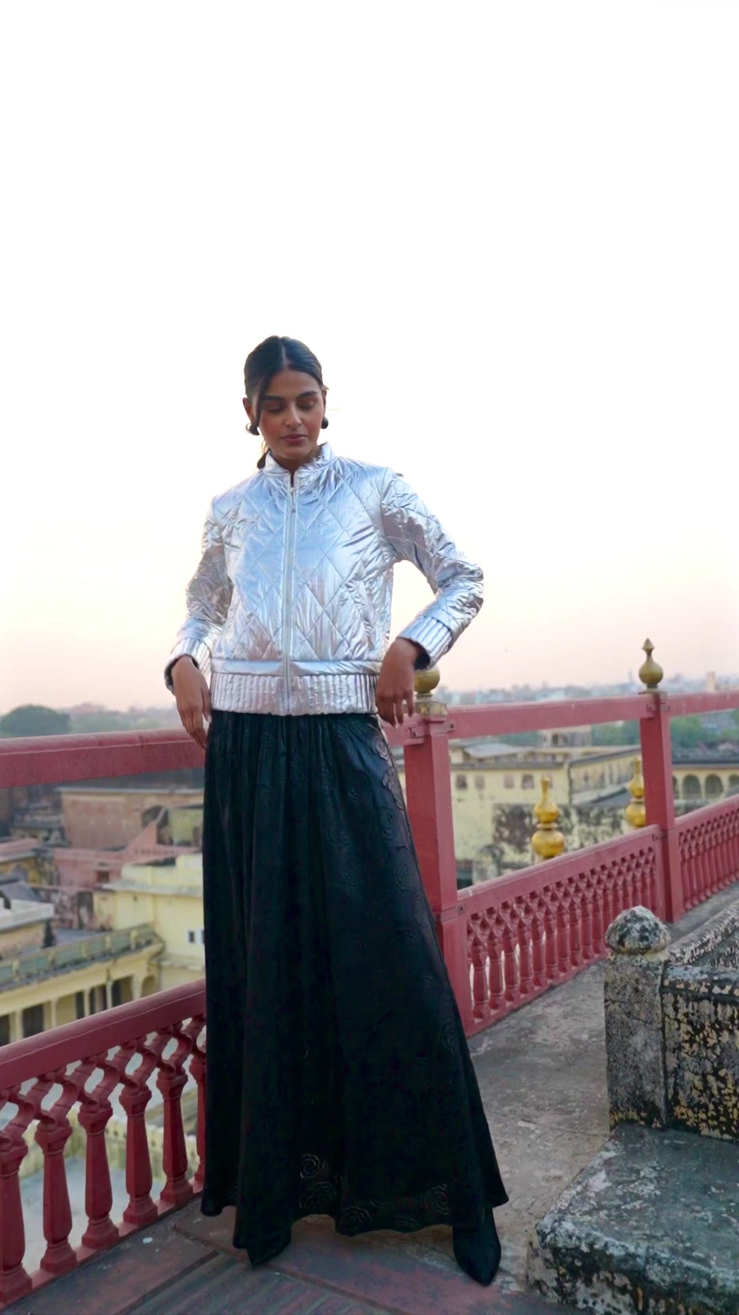 Flared skirt in black foil lamé with a hand-cutout roses pattern. Features exaggerated smocking at the high waist for a defined fit-and-flare silhouette. Lined to the knee.