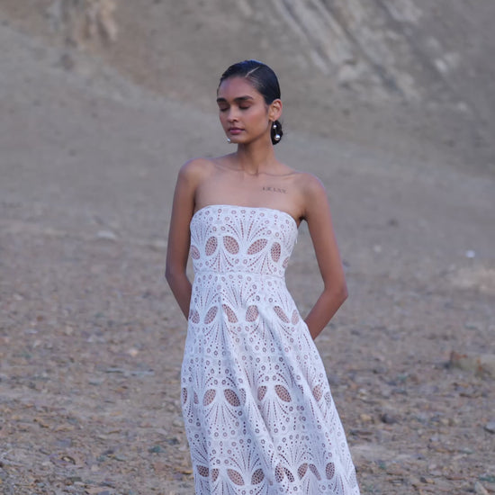 Off-shoulder fit-and-flare white midi dress in intricate cutwork lace. Dramatic scalloped hem with a flattering A-line silhouette. Comes with detachable, adjustable straps. Dress is fully lined.