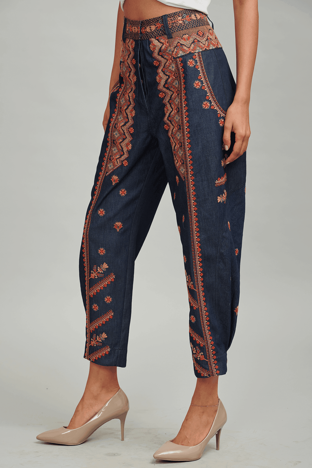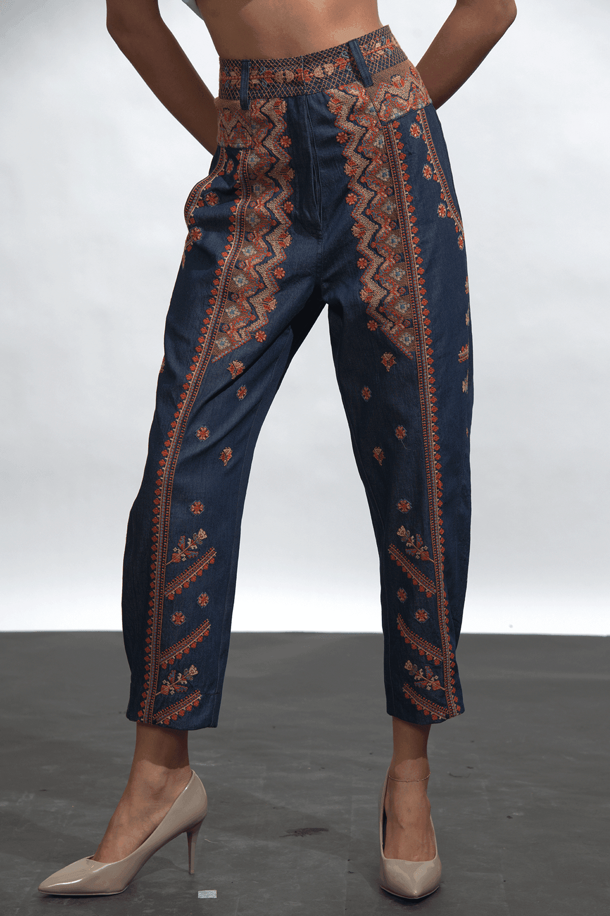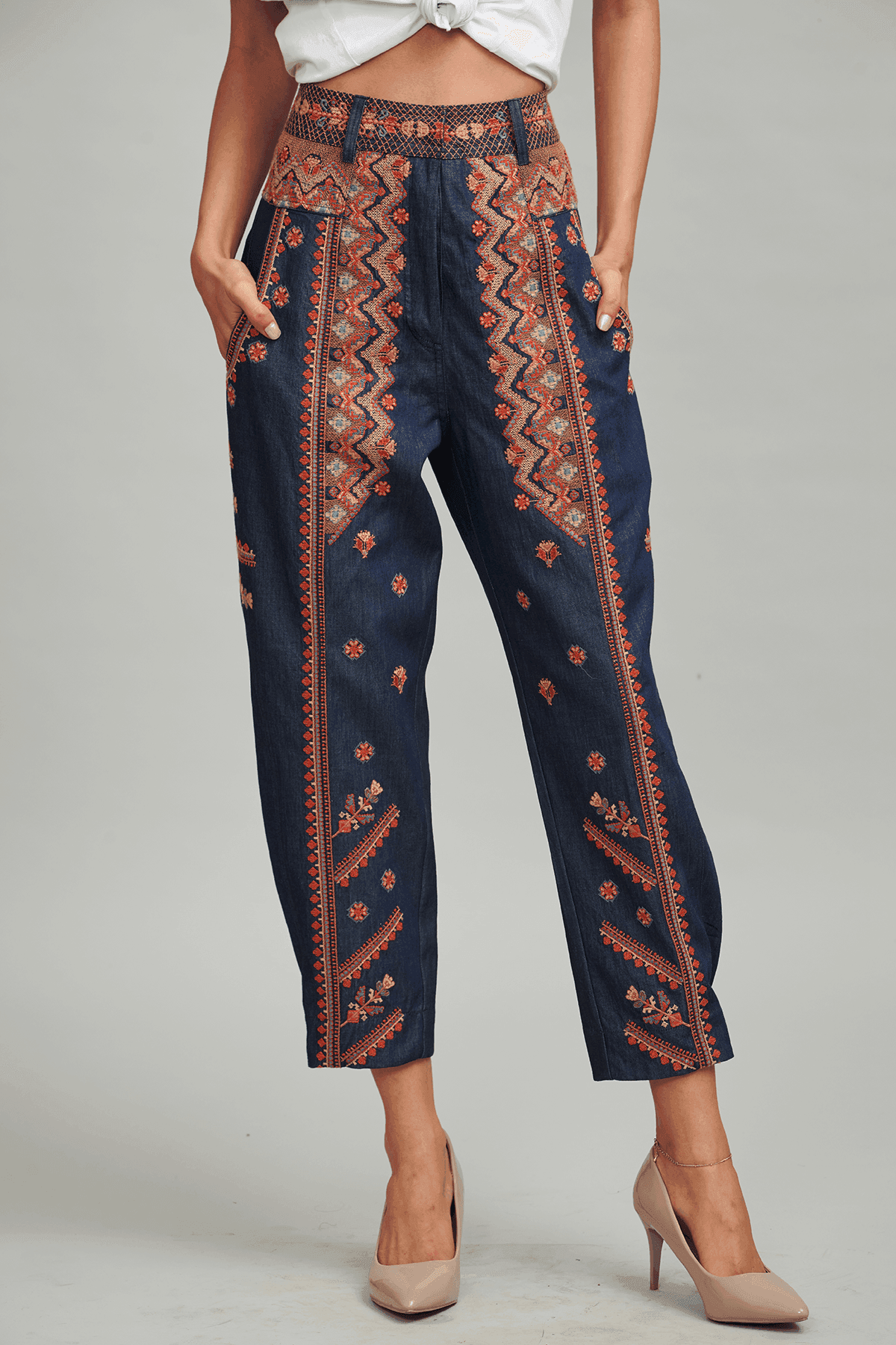 Multicolor placement embroidery on soft summer Tencel denim fabric. High-waisted pants with a tapered fit.