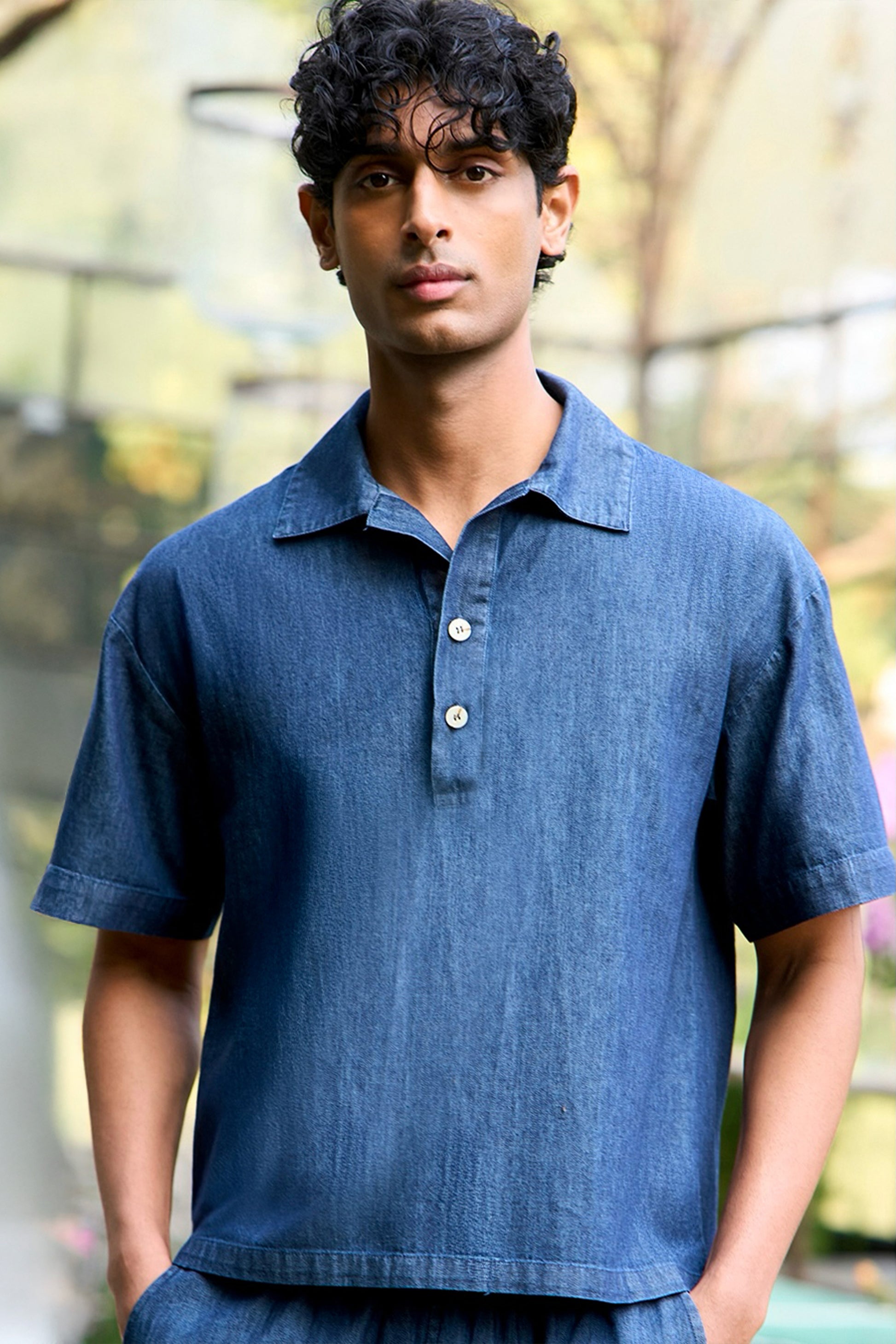 Relaxed-fit denim jogger pant with a fluid fall. Fully elasticated waistband. Hand-sewn pleats towards the cuffs create gentle shaping at the hem. Large-scale patch pockets at the front with side pockets.