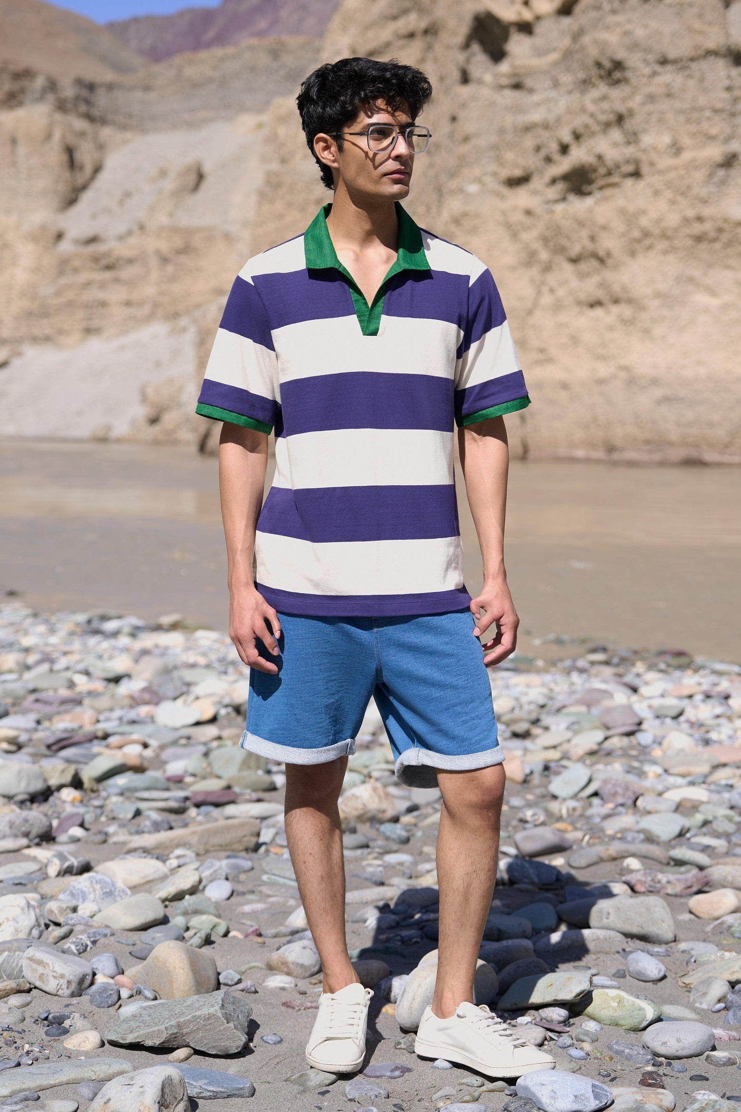 Knitted indigo washed french terry shorts. Metal button closure, front zip and placed rivets to mimic a 5 pocket jean. Turn-up at the hem. Pockets in the sides and back.