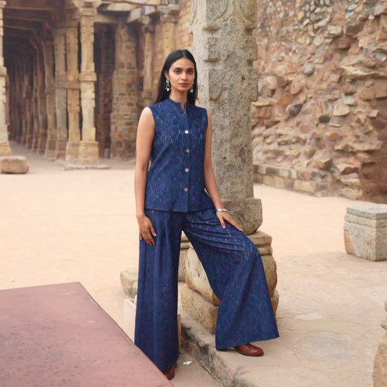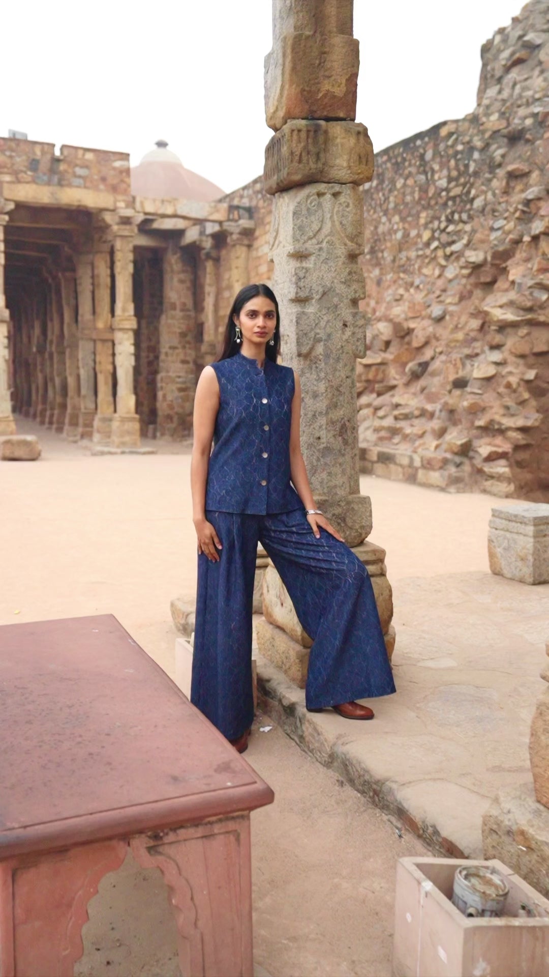 Band collar waistcoat inspired top in a soft knitted indigo denim lace fabric. Floral patterned jacquard weave. Sleeveless, relaxed fit. Dramatic matte silver buttons down the front. Garment is fully lined.