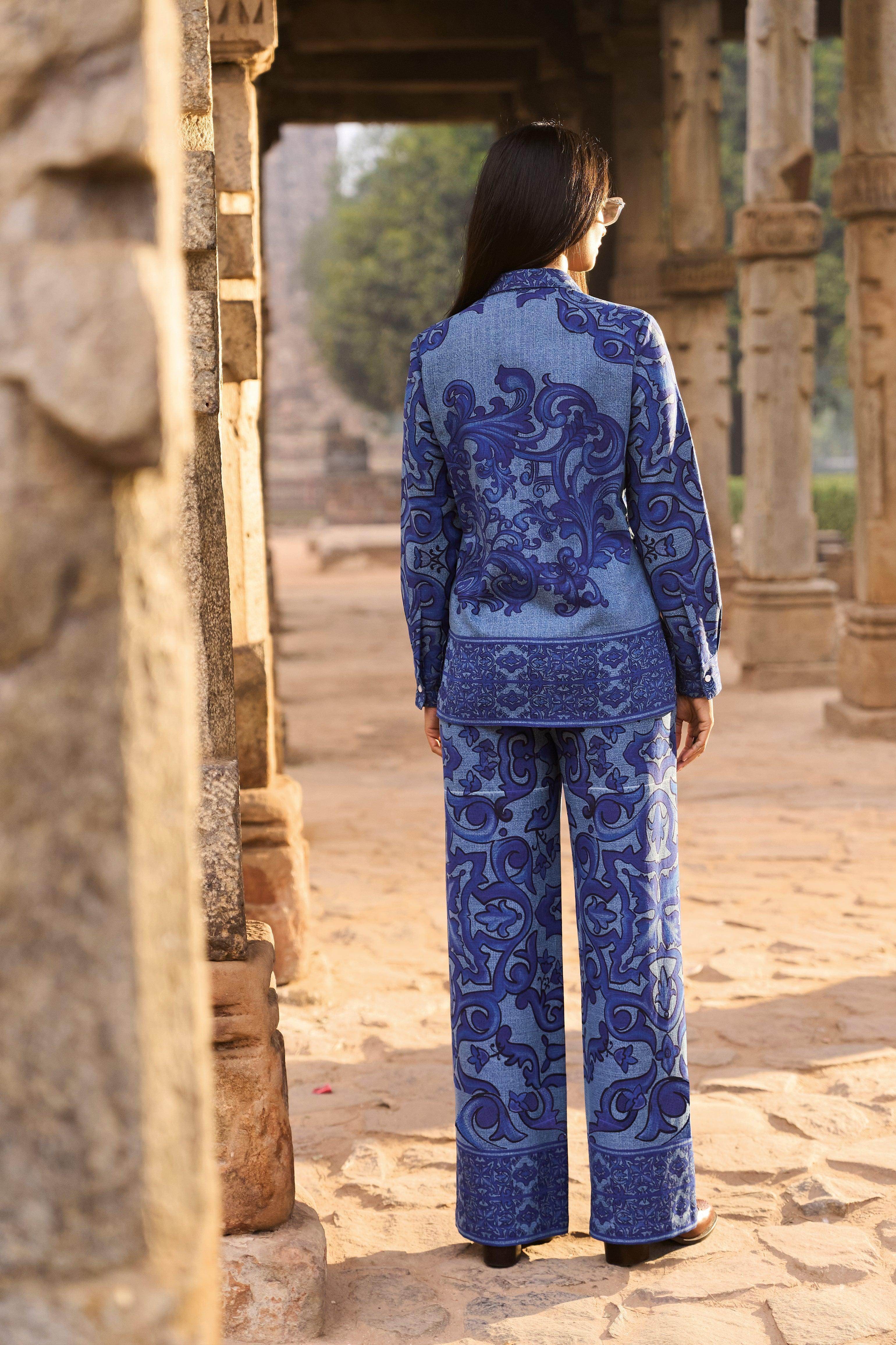 Washed cotton denim shirt with our signature porcelain print. Shirt collar, full sleeves. Concealed button placket in the front, snap buttons on the sleeve cuffs. Vents on the sides, relaxed fit. Paired with matching straight pants. Pockets in the sides. Hook/eye and zipper closure in the front.