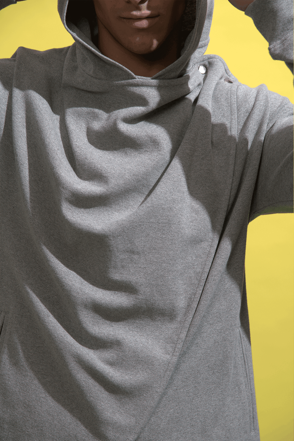 Cowl neck hoodie with a relaxed fit. Front panels cross over and snap into the opposite side shoulders creating a double overlap.