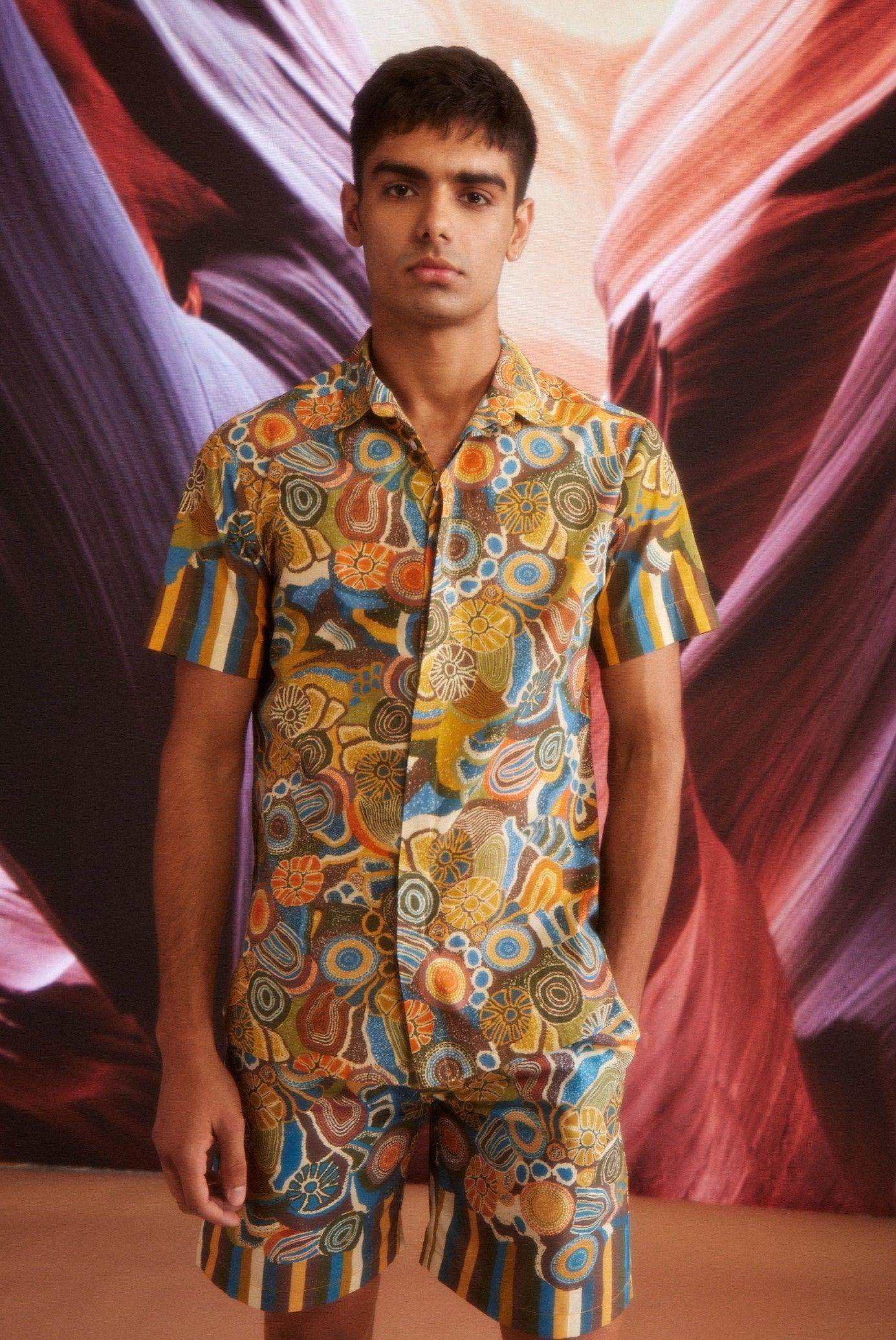 Abstract printed half sleeve shirt and short set in earth tones. Half sleeve shirt with concealed button placket. Paired with matching shorts. Elasticated at the back. Pockets on the side and back. Button closure and zip at the front. Placed stripe border on the sleeve cuff and the hem of the shorts.