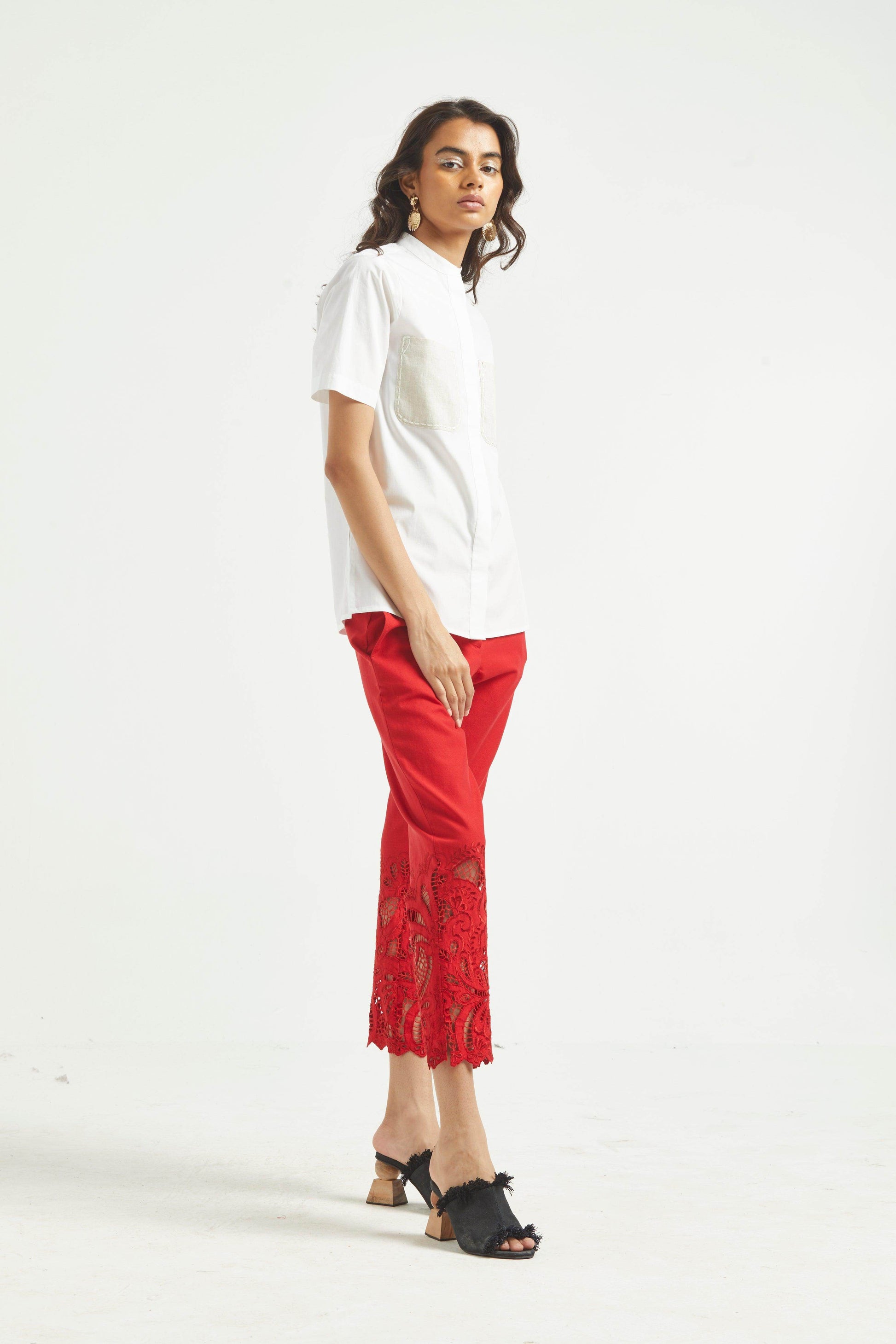 Tapered fit pants. Cutwork embroidery detail below the knee, scalloped hem. Zip fly, hook closure at the front. Pockets on the side. waist?