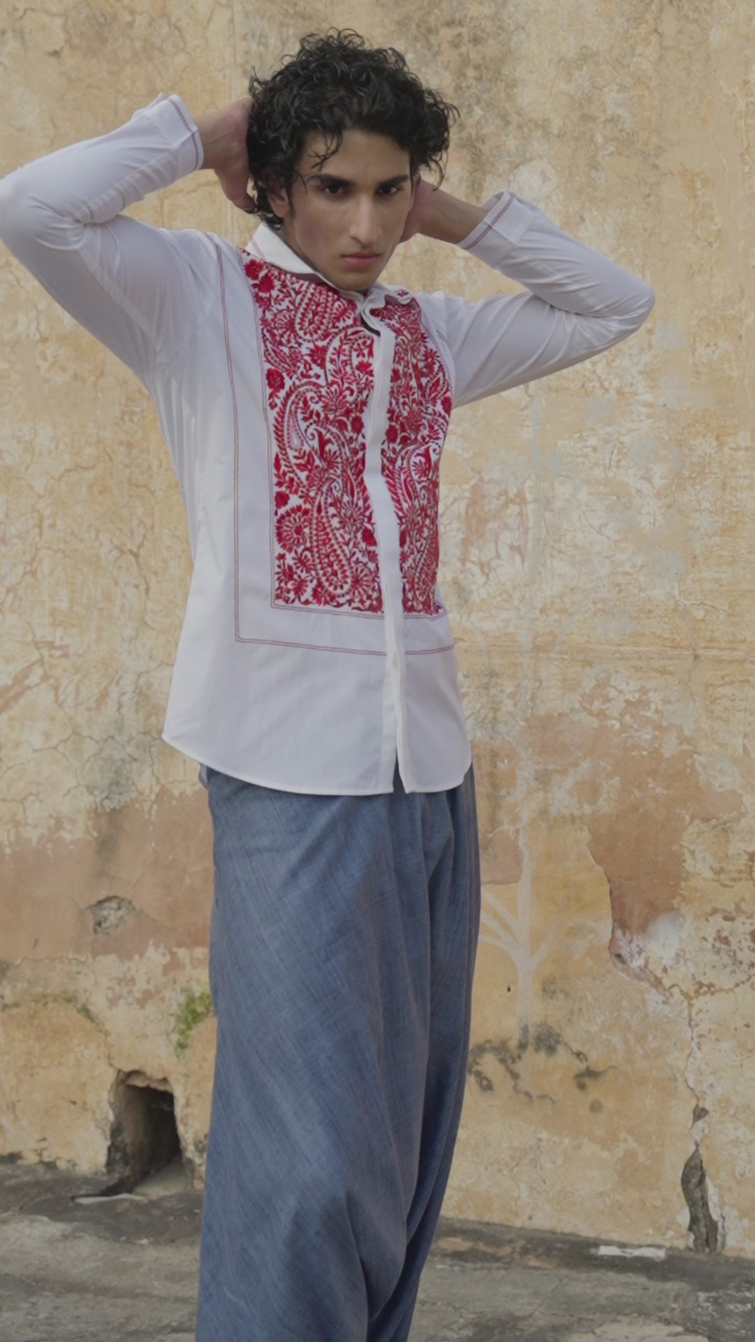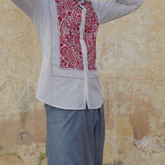 Regular fit white organic cotton poplin shirt with an embroidered front bib detailing. Tones of red in a hand drawn paisley pattern with geometric rice stitch borders. Concealed placket, full sleeves.