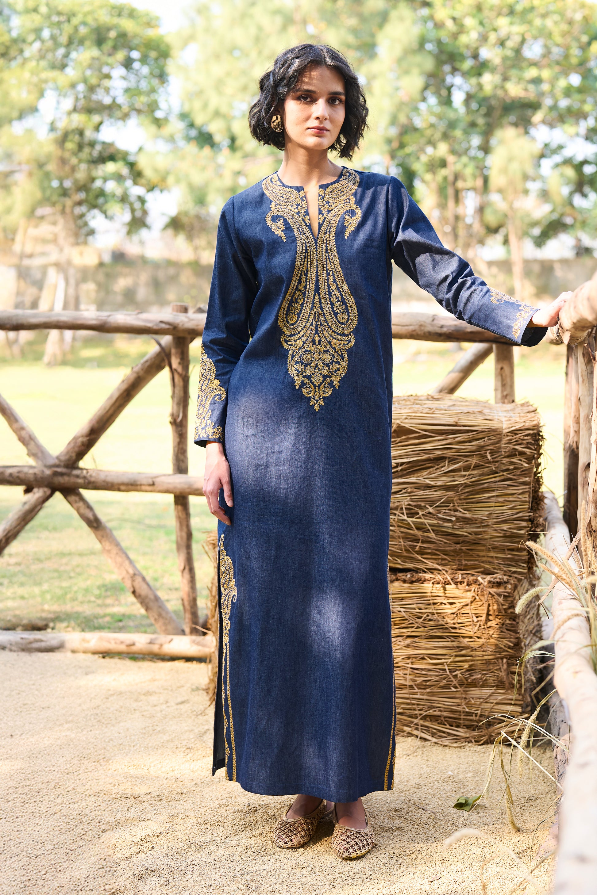 Statement navy denim kaftan dress with muted gold lurex paisley embroidery. V-cut round neckline with embroidery running across the front placket and the front panel. Coordinated embroidery along the sleeve cuffs, side seams and a back yoke motif. Straight-cut, full sleeves with slits in the sides.