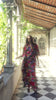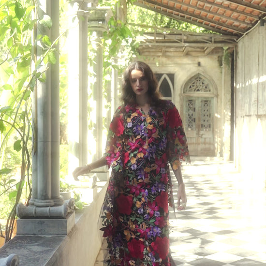 Maxi kaftan dress in all-over multicolour floral embroidery. Scalloped V-neckline and drop-shoulder cropped sleeves. Slits in the sides. Comes with a slip.
