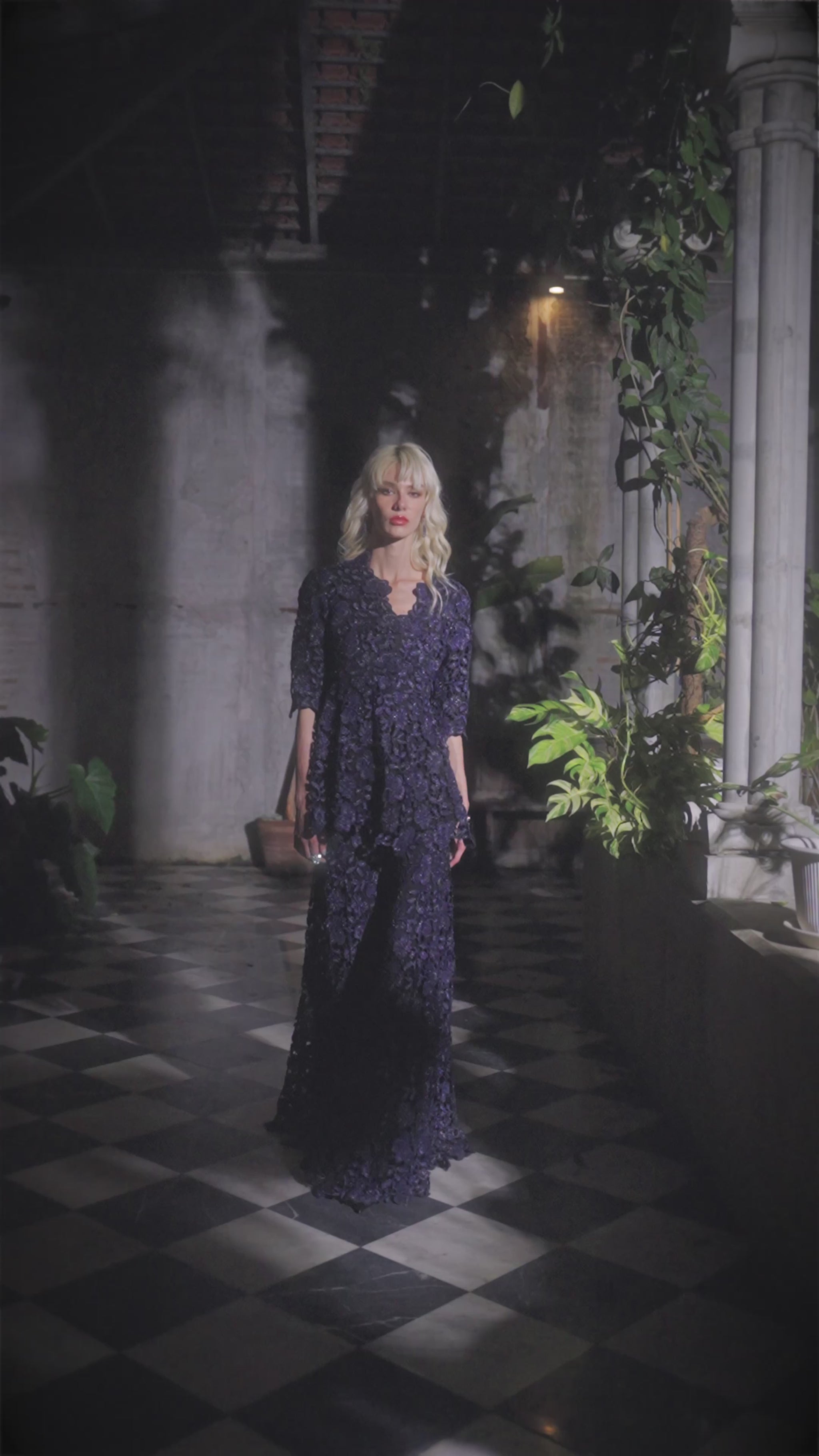 Intricate soft floral lace top with navy thread embroidery. Subtle shimmer adds understated glamour. Peplum V-neck in a flattering fit and flare shape. Scalloped neckline, placket, hem, and half sleeves. Hook/eye closure down the front. Garment is fully lined. Paired with matching flared pant. Subtle shimmer adds understated glamour. Designed with a fluid flare that creates generous movement. Side zip closure with hook/eye. Garment is fully lined.