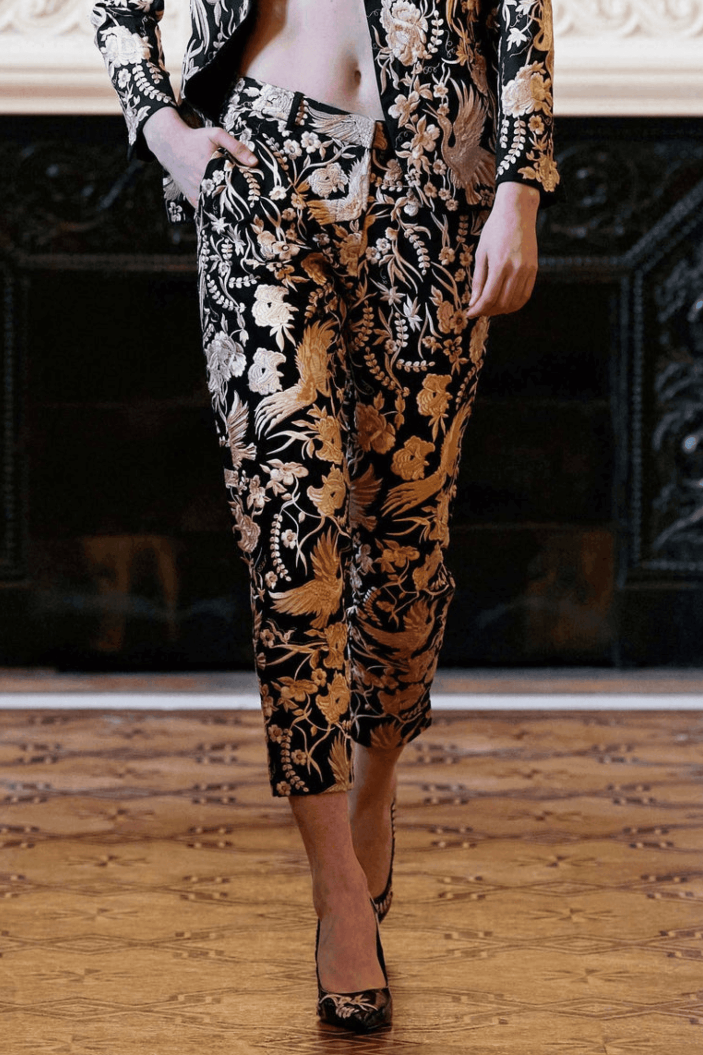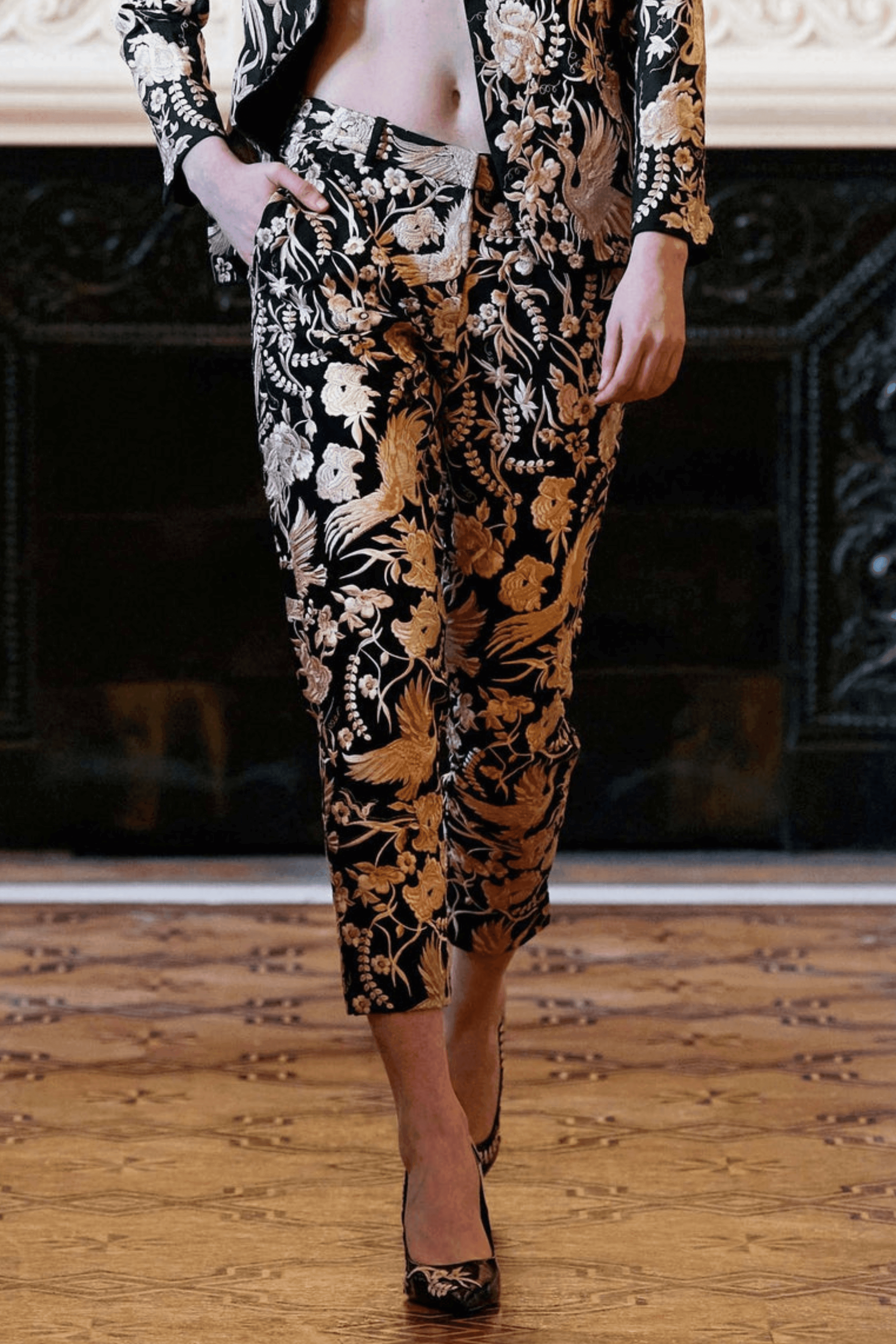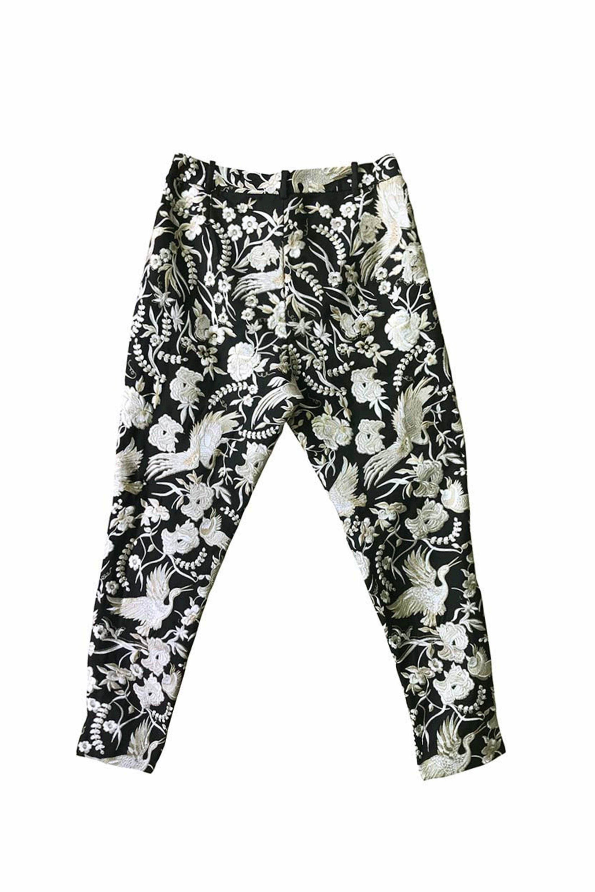 Black tapered fit pants in our signature allover Gara stitch embroidery. Pockets at the side. Zip fly.
