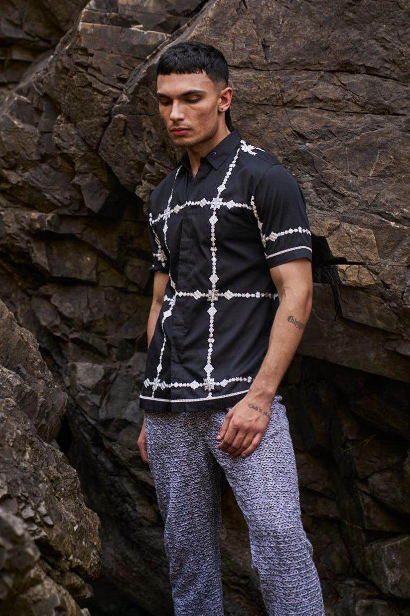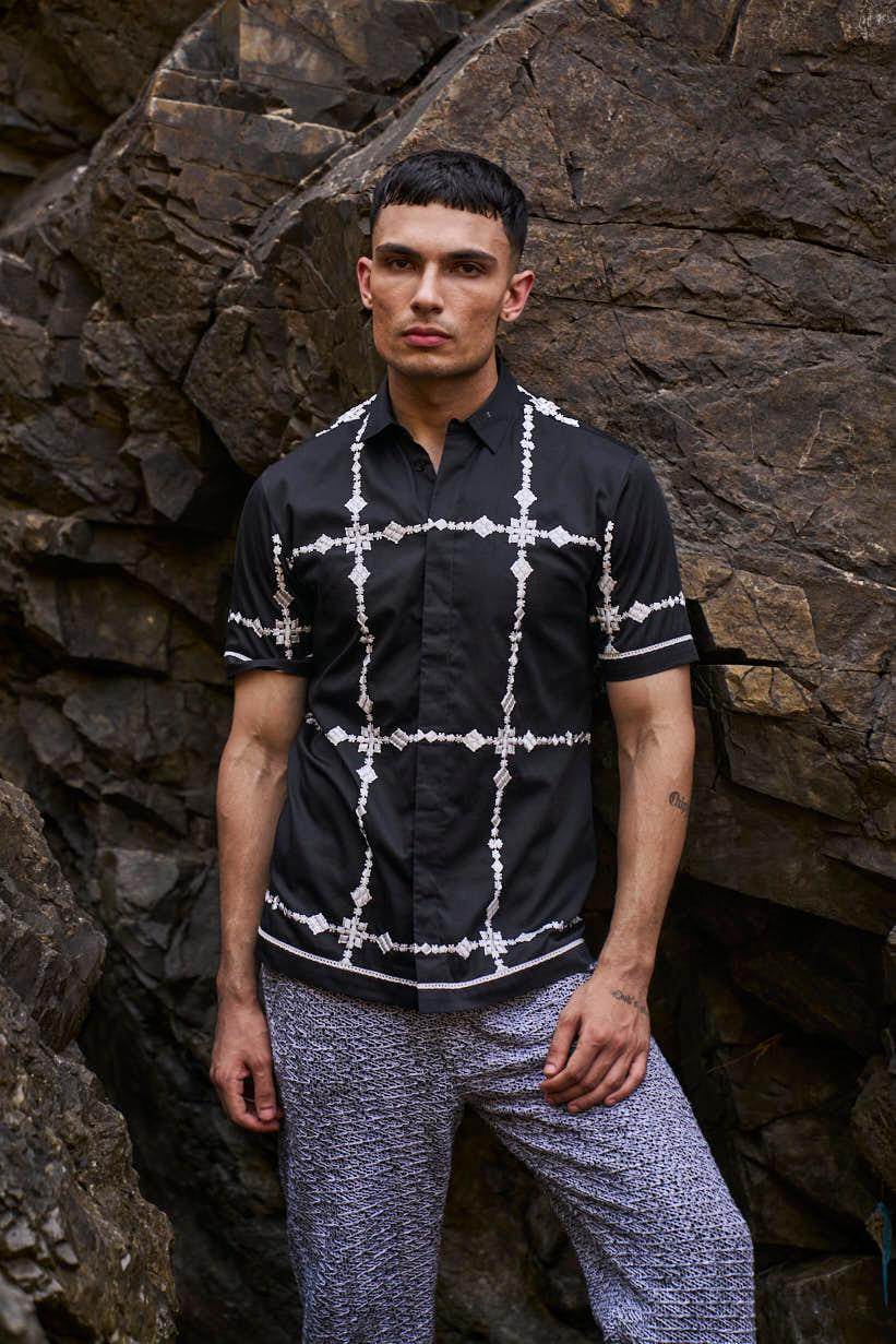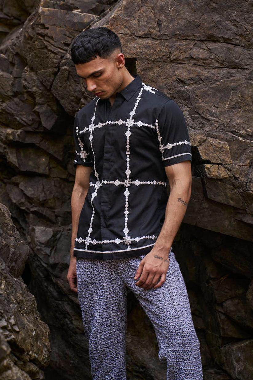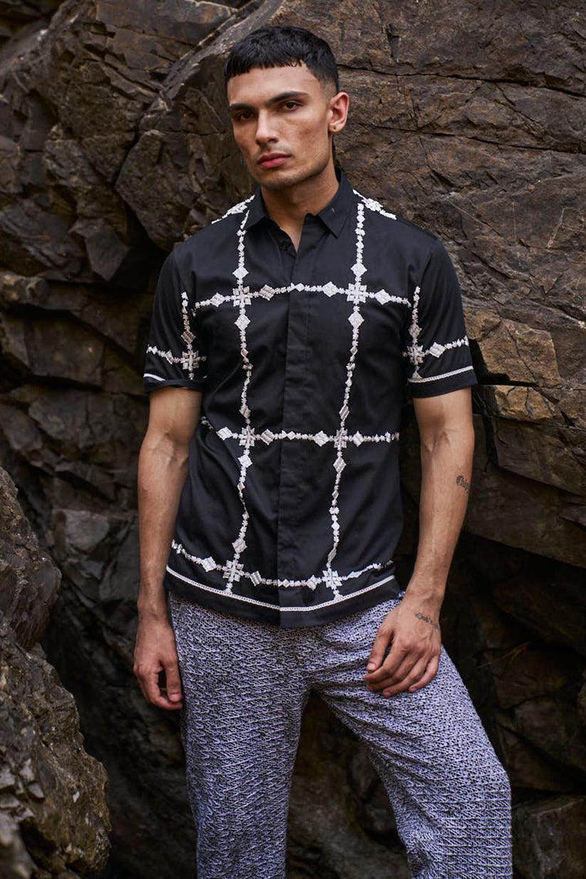 Black cotton poplin half sleeve shirt with contrast white embroidery of motifs running in a check pattern. Inserted ladders on the bottom hem and cuff. Concealed button down placket in the front.