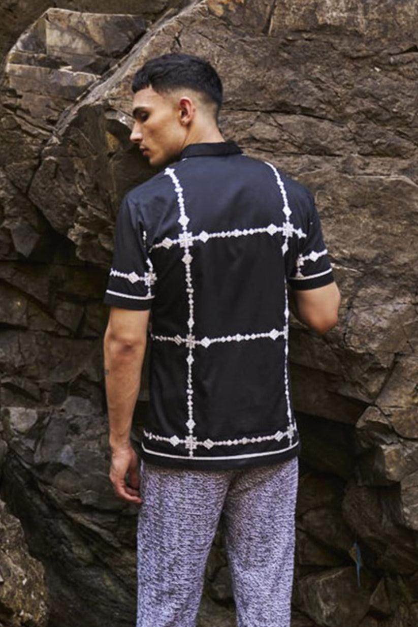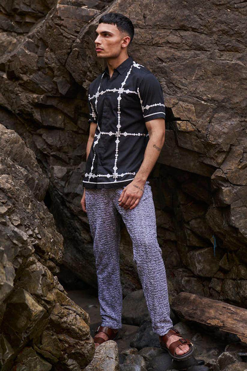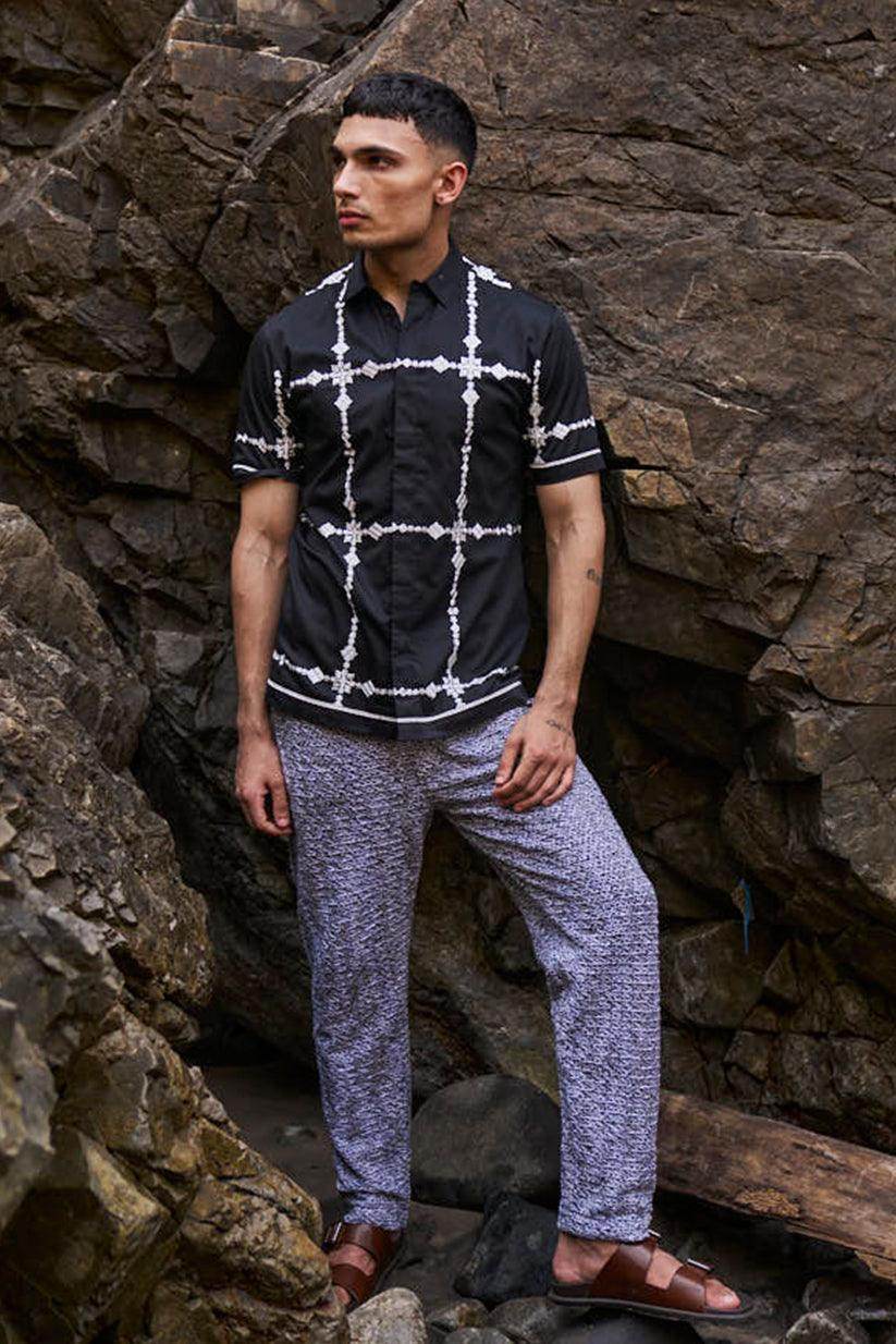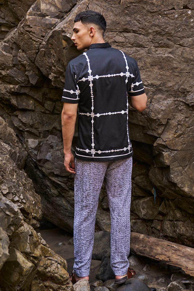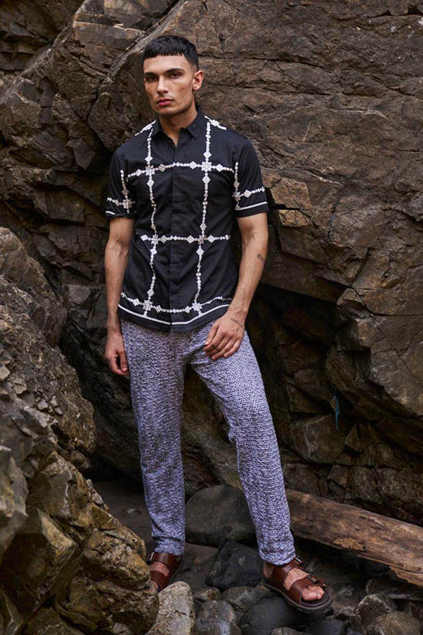 Black cotton poplin half sleeve shirt with contrast white embroidery of motifs running in a check pattern. Inserted ladders on the bottom hem and cuff. Concealed button down placket in the front.