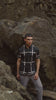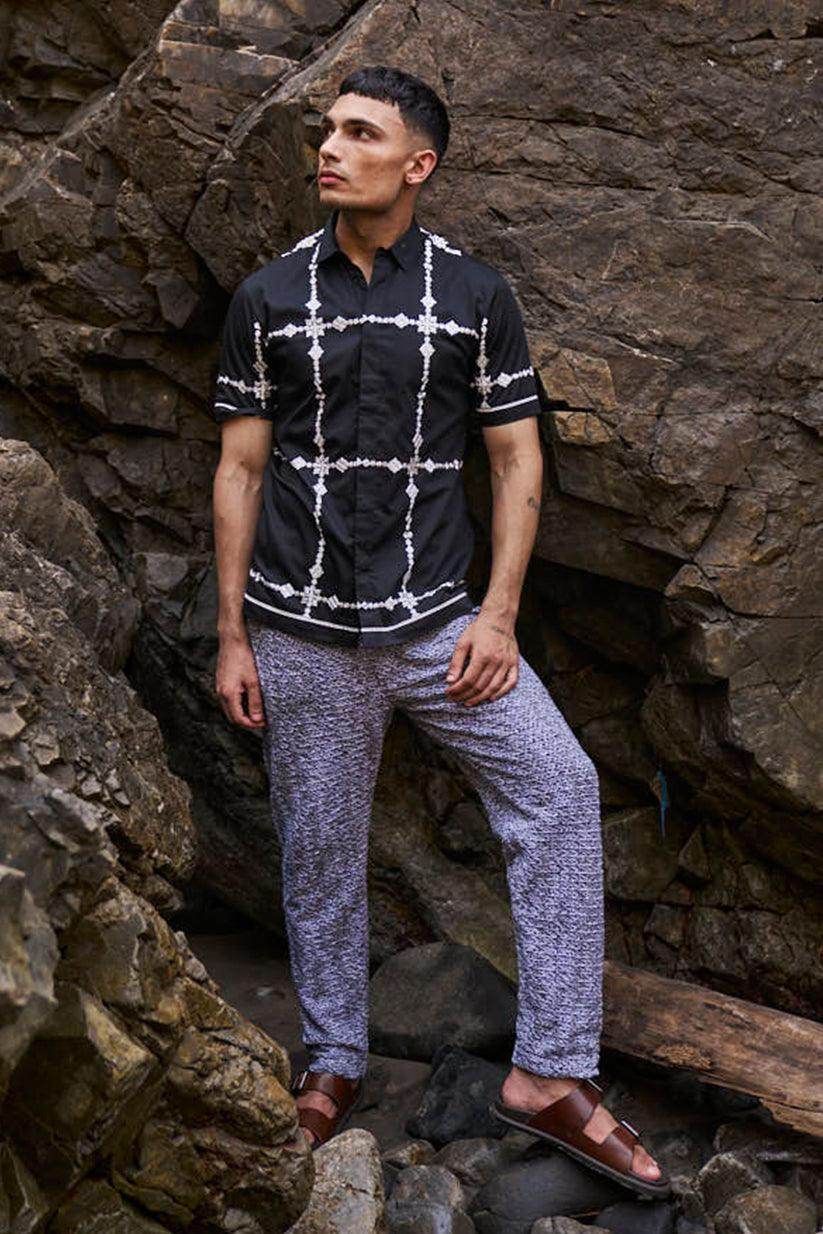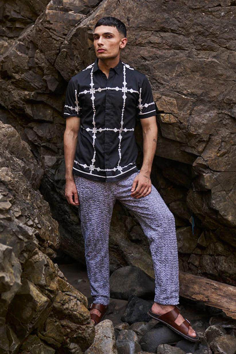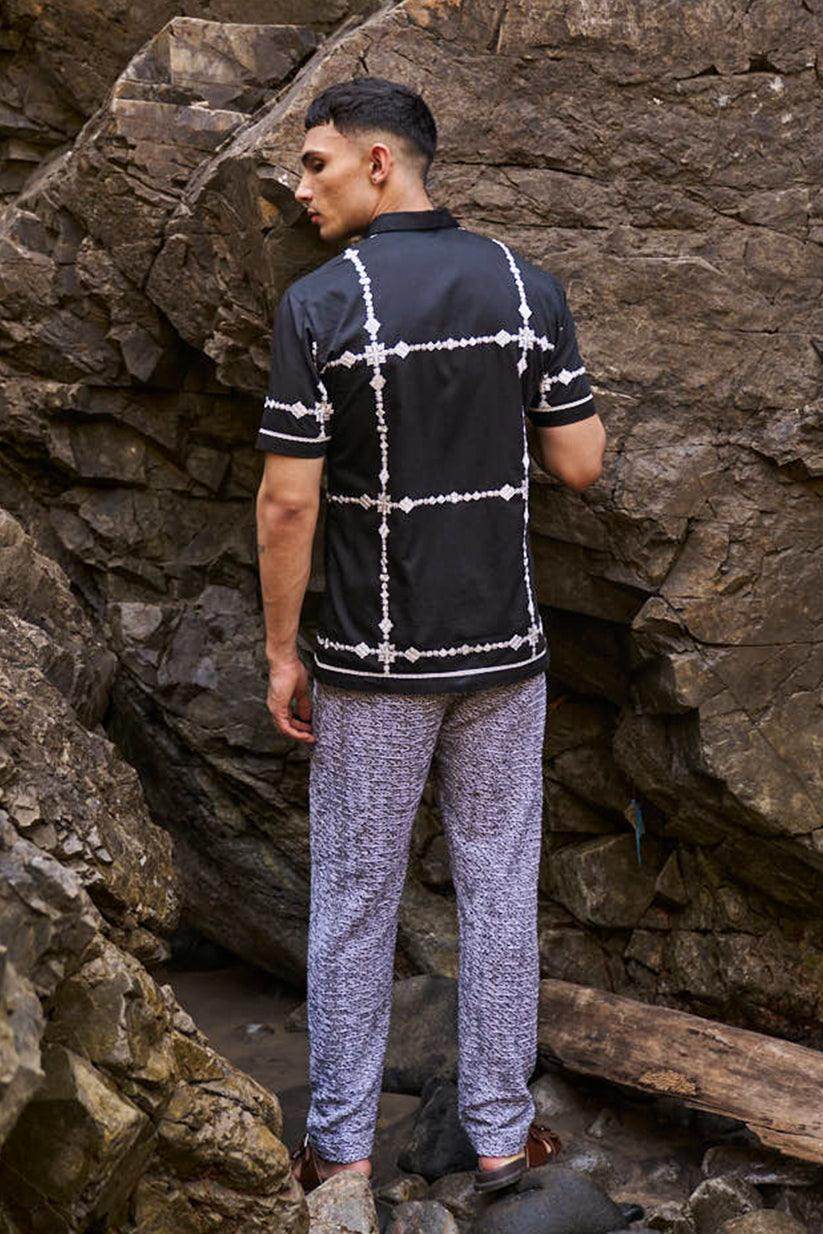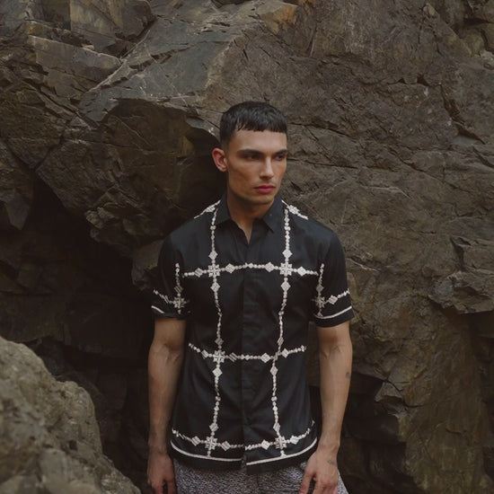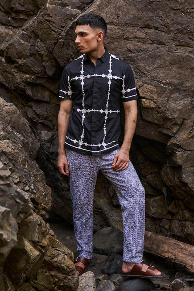 Black cotton poplin half sleeve shirt with contrast white embroidery of motifs running in a check pattern. Inserted ladders on the bottom hem and cuff. Concealed button down placket in the front.