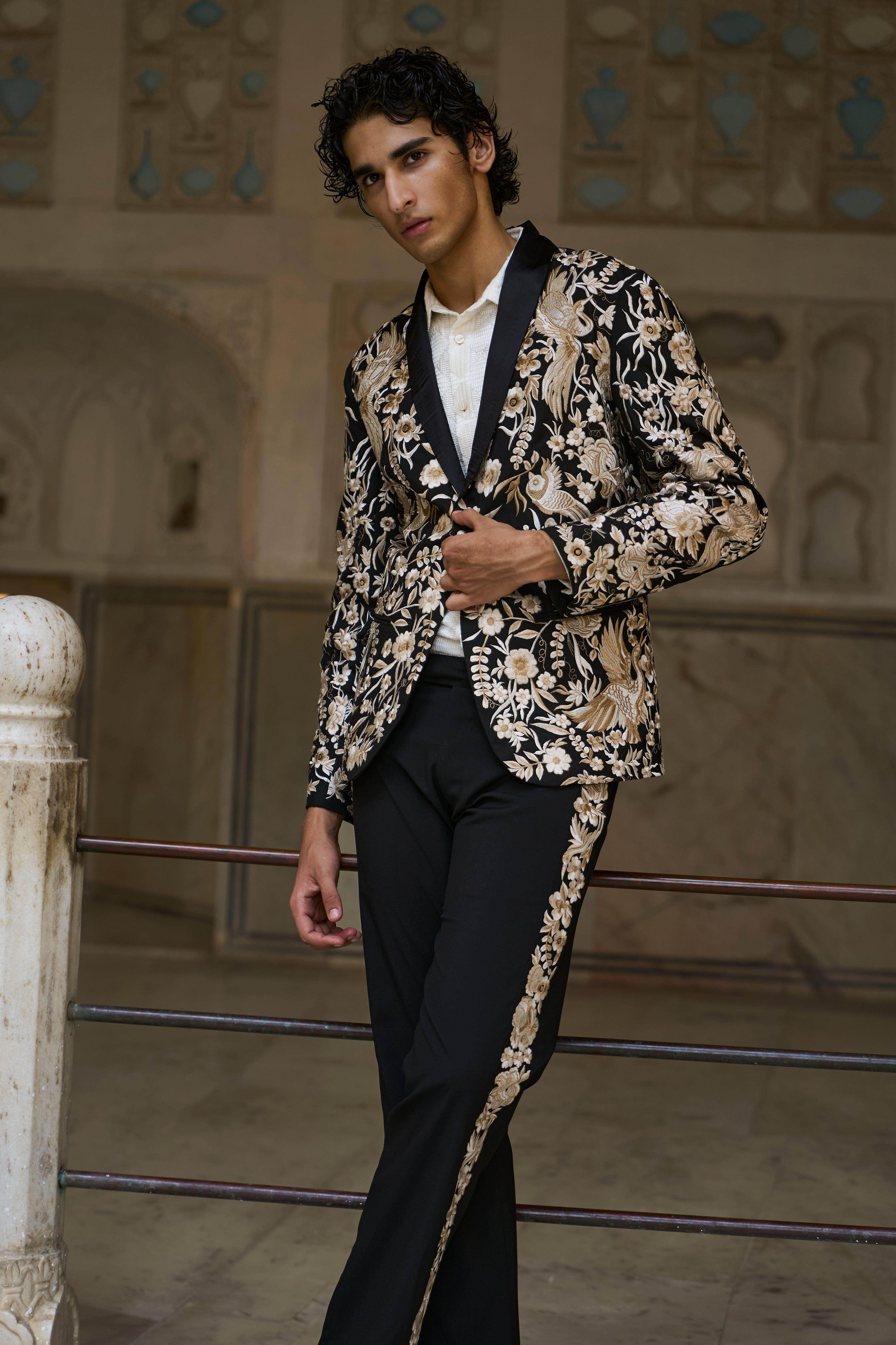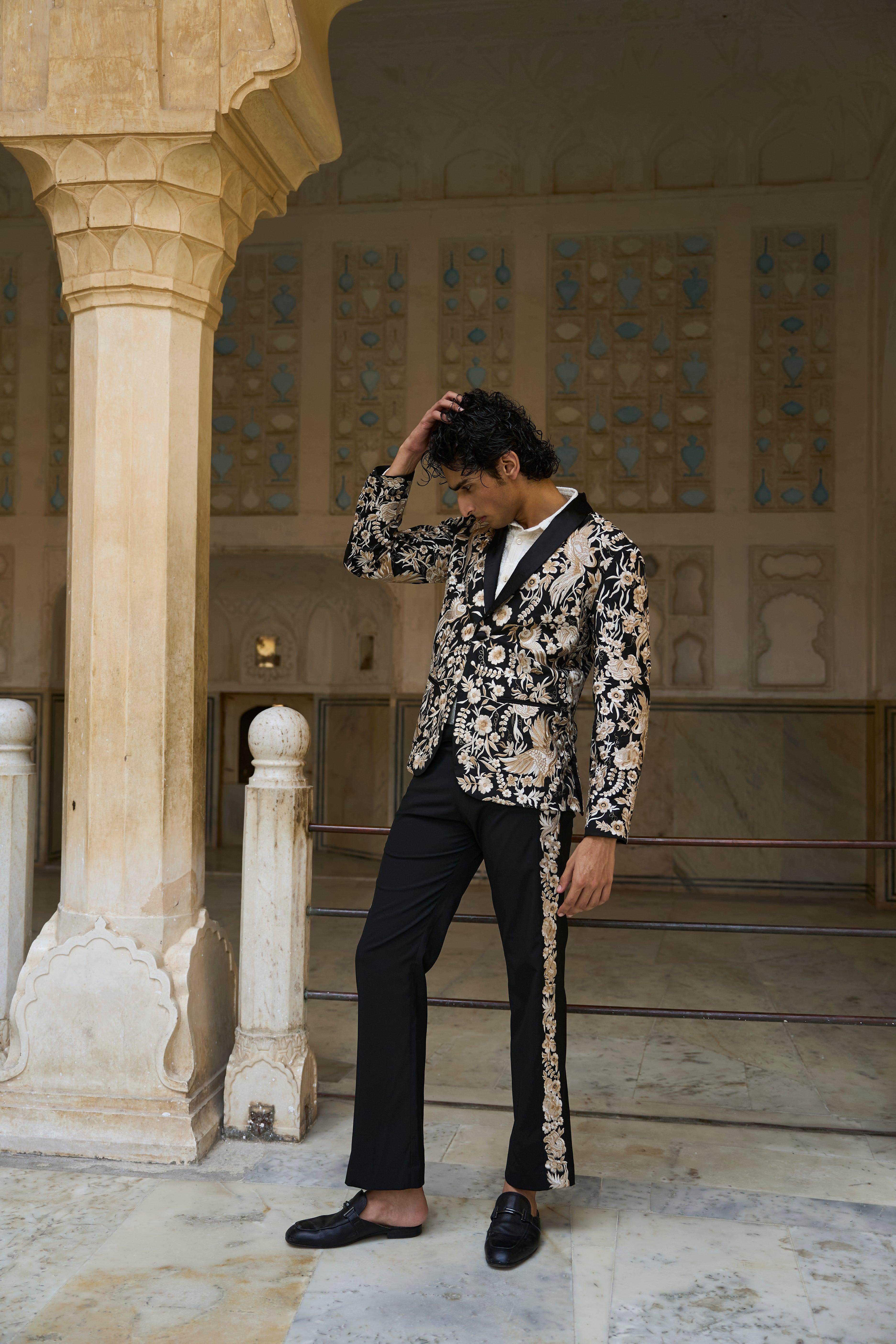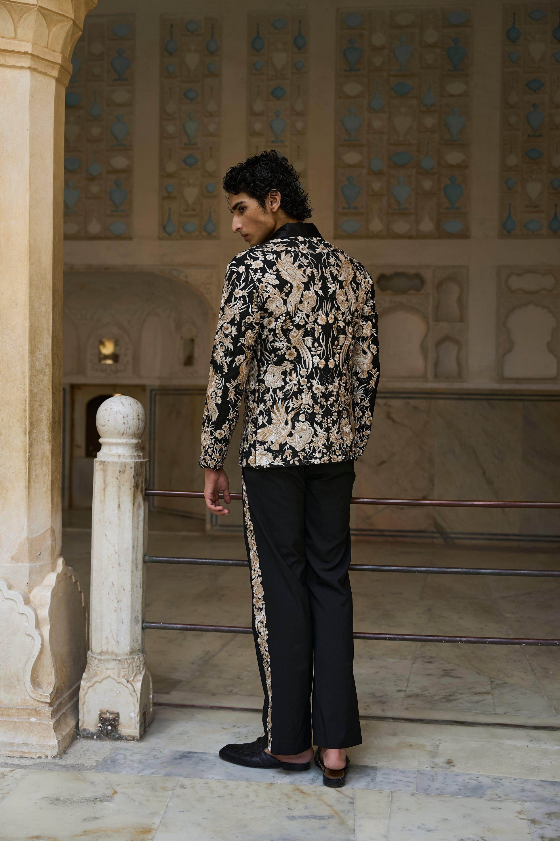 Shawl collar jacket in our signature all over Gara stitch embroidery with a satin lapel and button closure. Pockets in the front. The garment is fully lined. Paired with complementary black straight cut pants with Gara stitch inspired embroidery detailing down the sides inspired by tuxedo pants. Pockets in the sides and back. Hook/eye and zip closure in the front. Made in all weather suiting material.