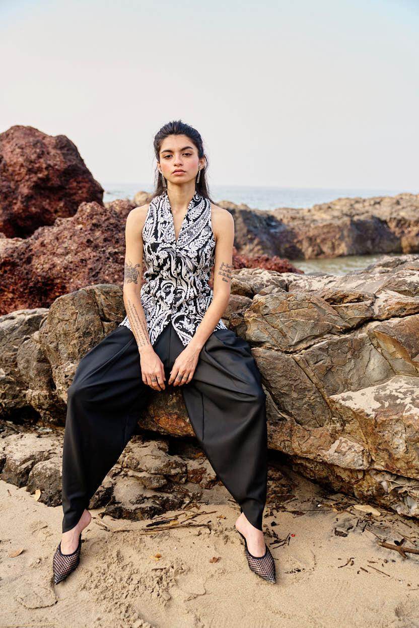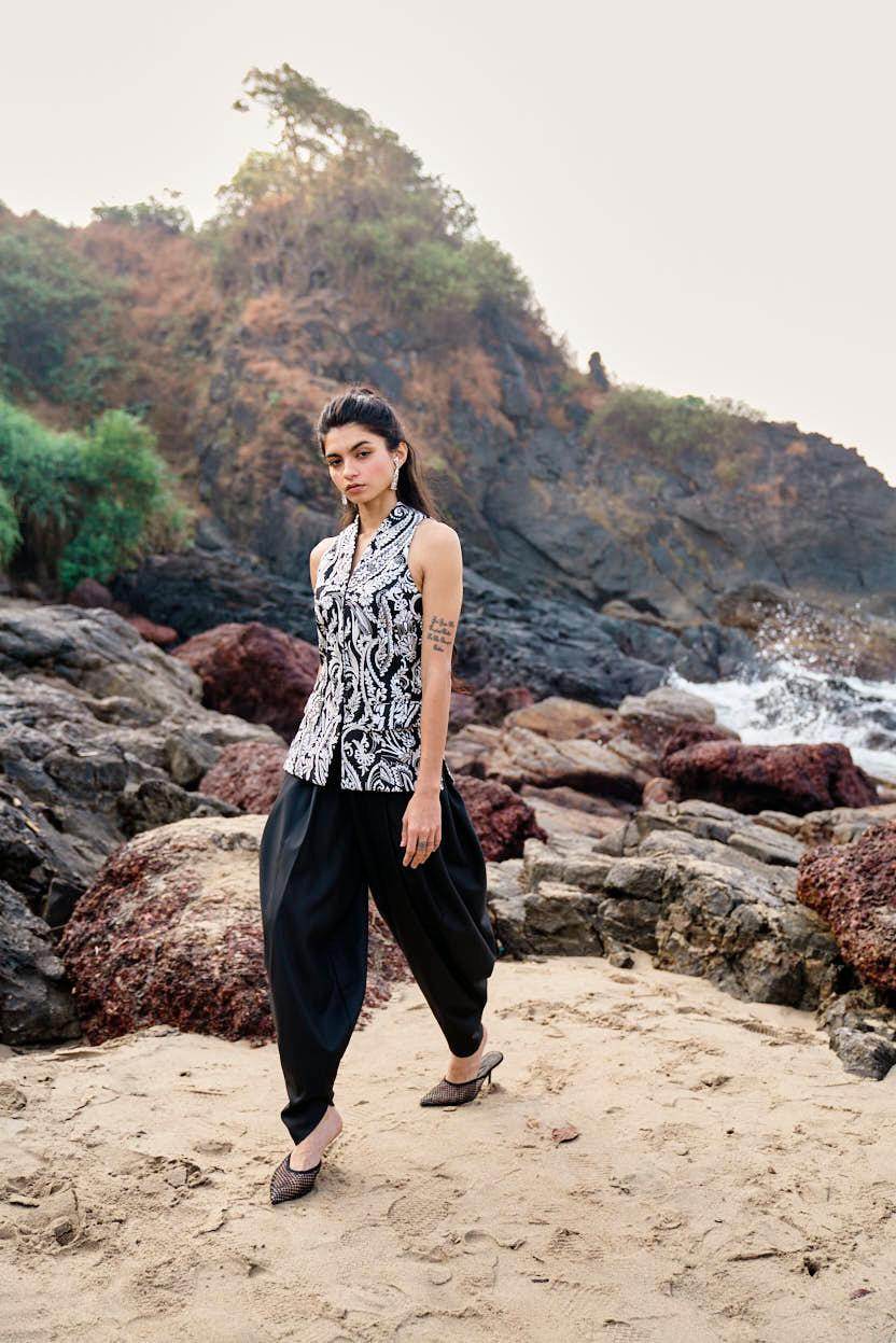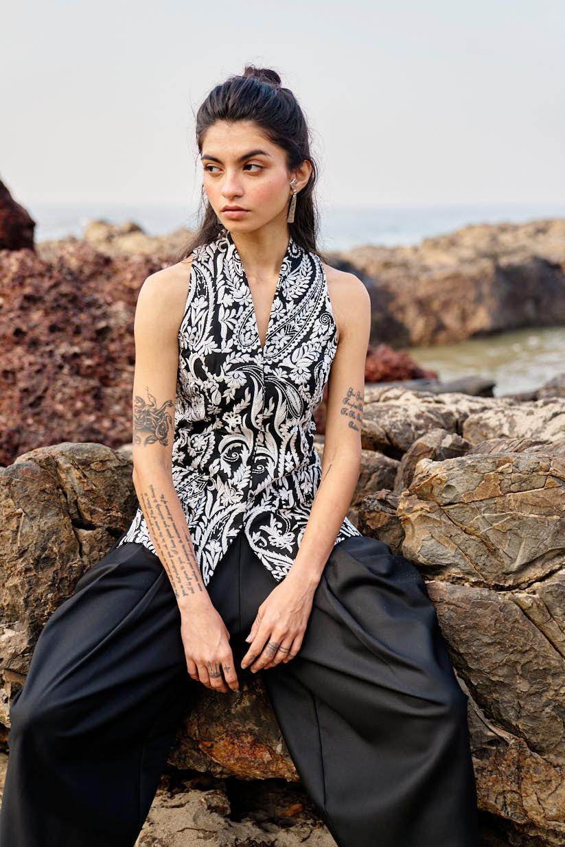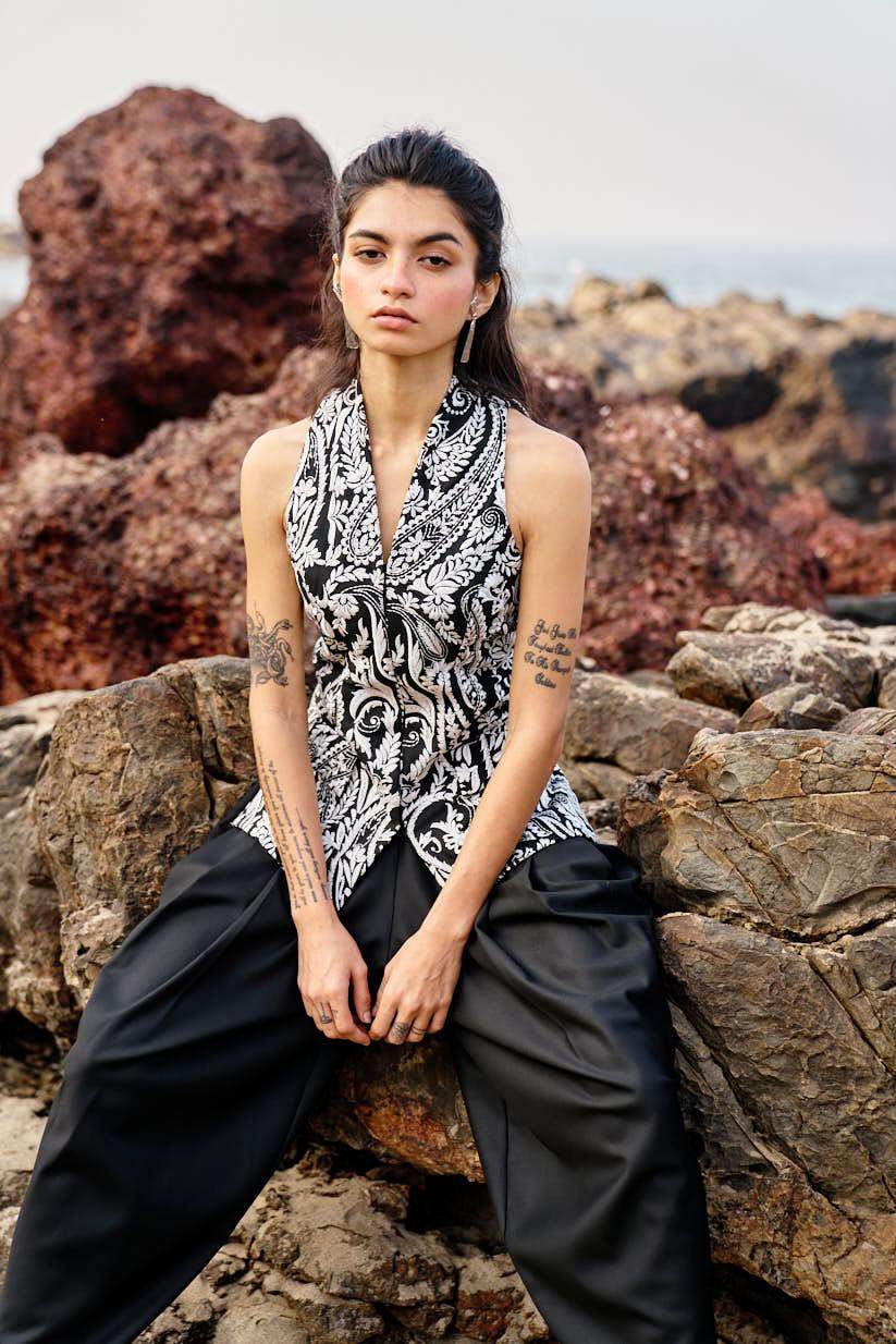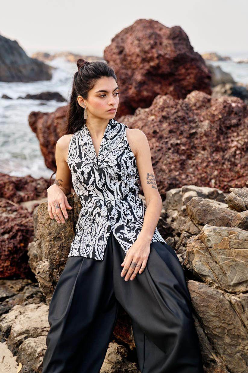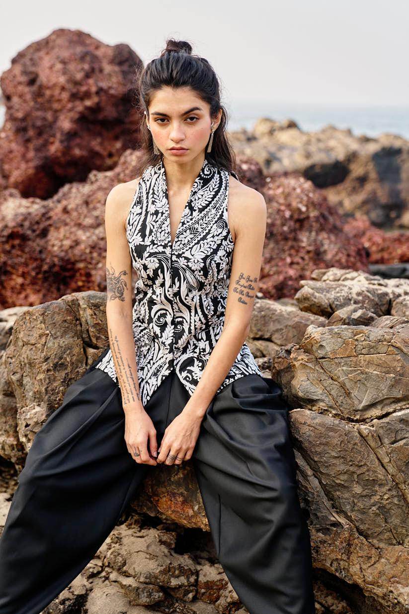 All over white on black embroidered V-neck waistcoat with flap pockets in the front. Concealed hook/eye button closure in the front. Fully lined. Made of all weather suiting material.