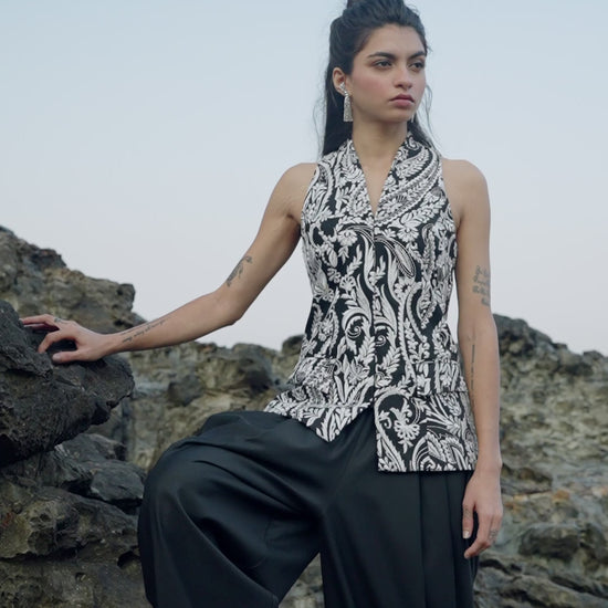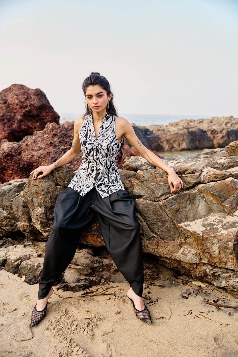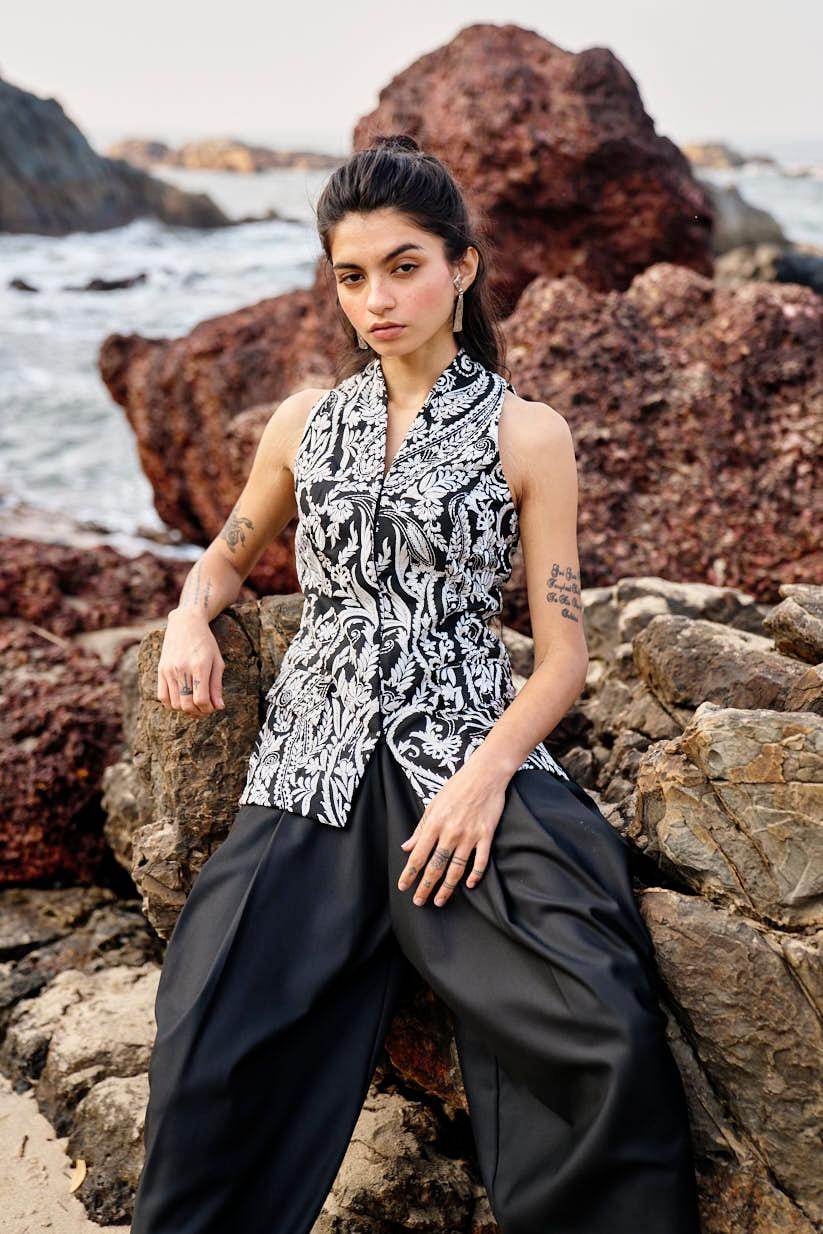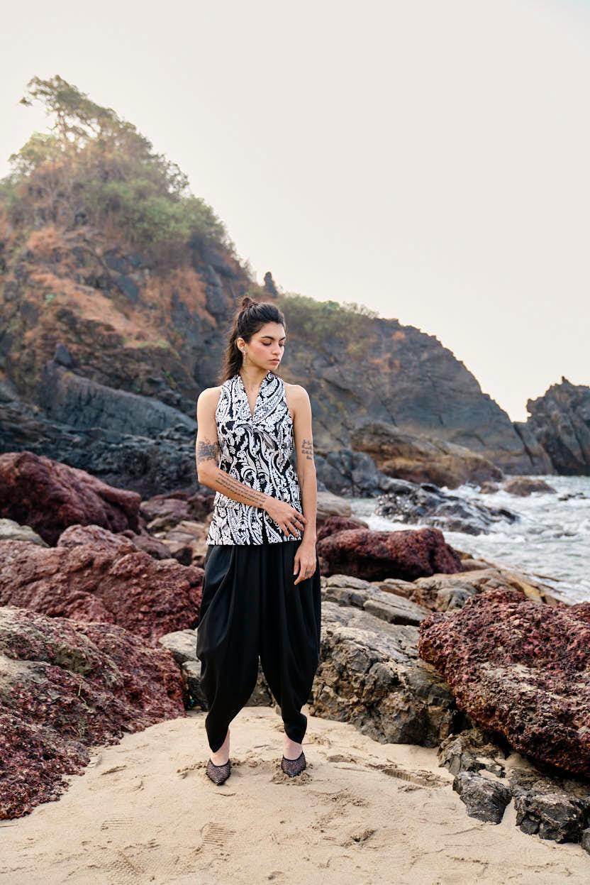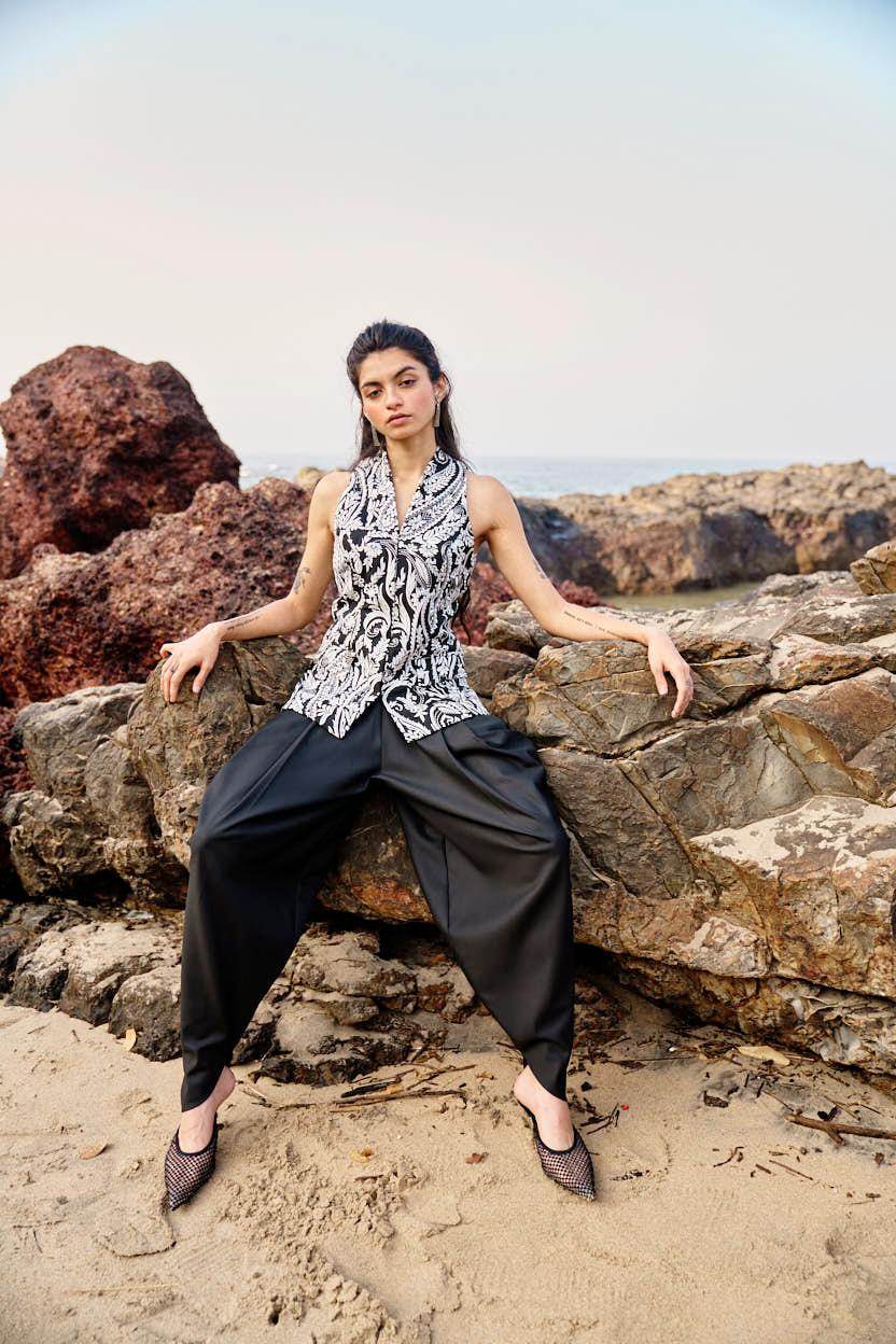 All over white on black embroidered V-neck waistcoat with flap pockets in the front. Concealed hook/eye button closure in the front. Fully lined. Made of all weather suiting material. Paired with black cowled pants in all weather suiting material. Dhoti-inspired draped pleat detail that adds volume and tapers toward the cuff. Elasticated waist. Comfort fit.
