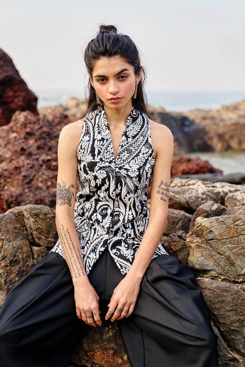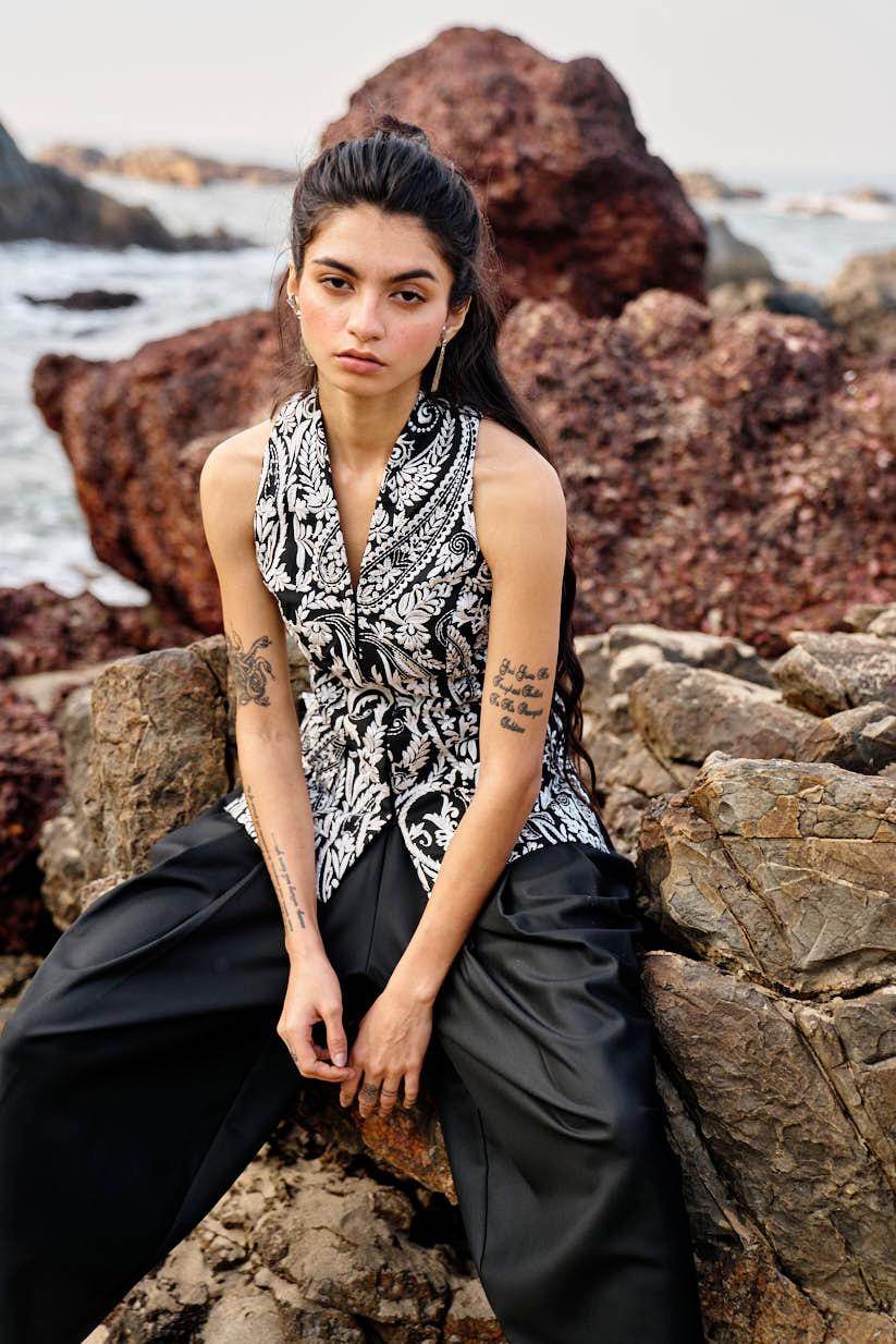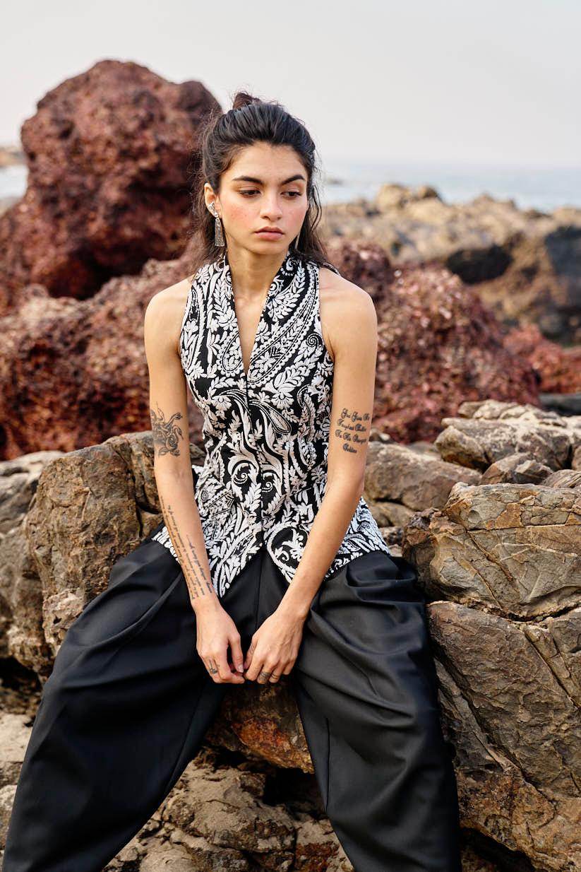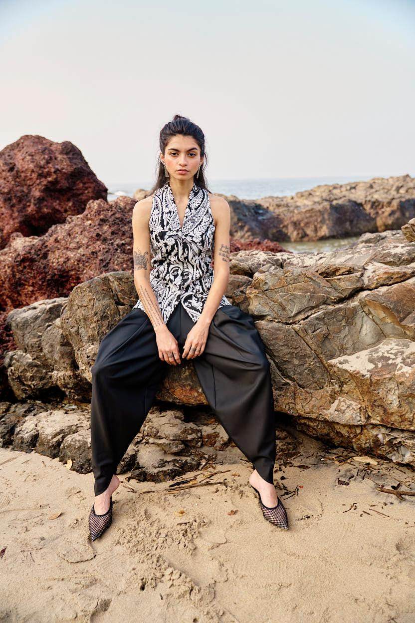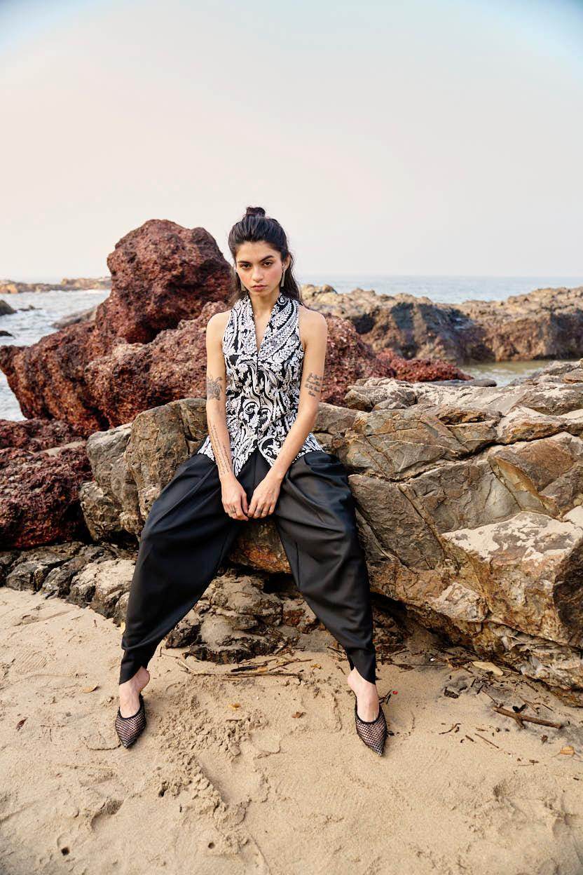 All over white on black embroidered V-neck waistcoat with flap pockets in the front. Concealed hook/eye button closure in the front. Fully lined. Made of all weather suiting material. Paired with black cowled pants in all weather suiting material. Dhoti-inspired draped pleat detail that adds volume and tapers toward the cuff. Elasticated waist. Comfort fit.