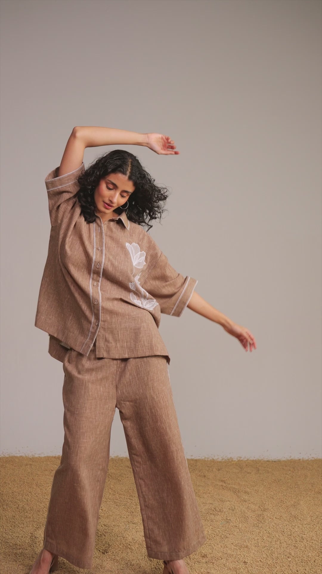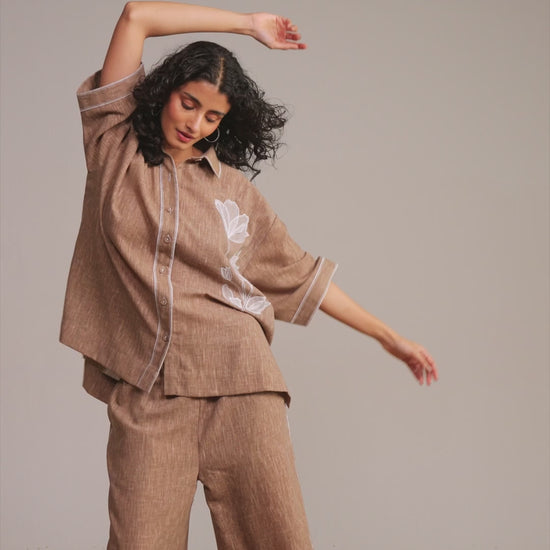 Relaxed fit shirt breathable, textural fabric with a linen-like handfeel. Hand-placed ivory floral appliqué on the wearer’s left side. Contrast running stitch detailing along the placket, collar and cuffs. Shirt collar with self-fabric button closure in the front. Short sleeves with a high-low hem and side vents. Paired with maching wide-legged relaxed fit pant. Contrast ivory running stitch embroidery along the side seams. Semi-elasticated waistband. Pockets in the sides.