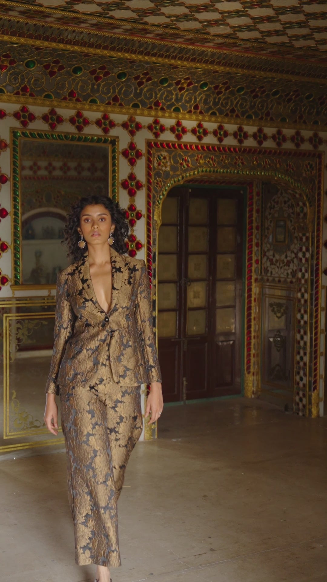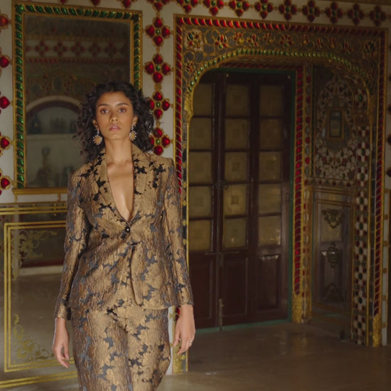Shawl collar blazer jacket in black and gold floral pattern. Crafted in soft summer brocade. Pearl inset black enamel metallic button closure in the front, snap button closure on the sleeves. Vent at the back. The garment is fully lined