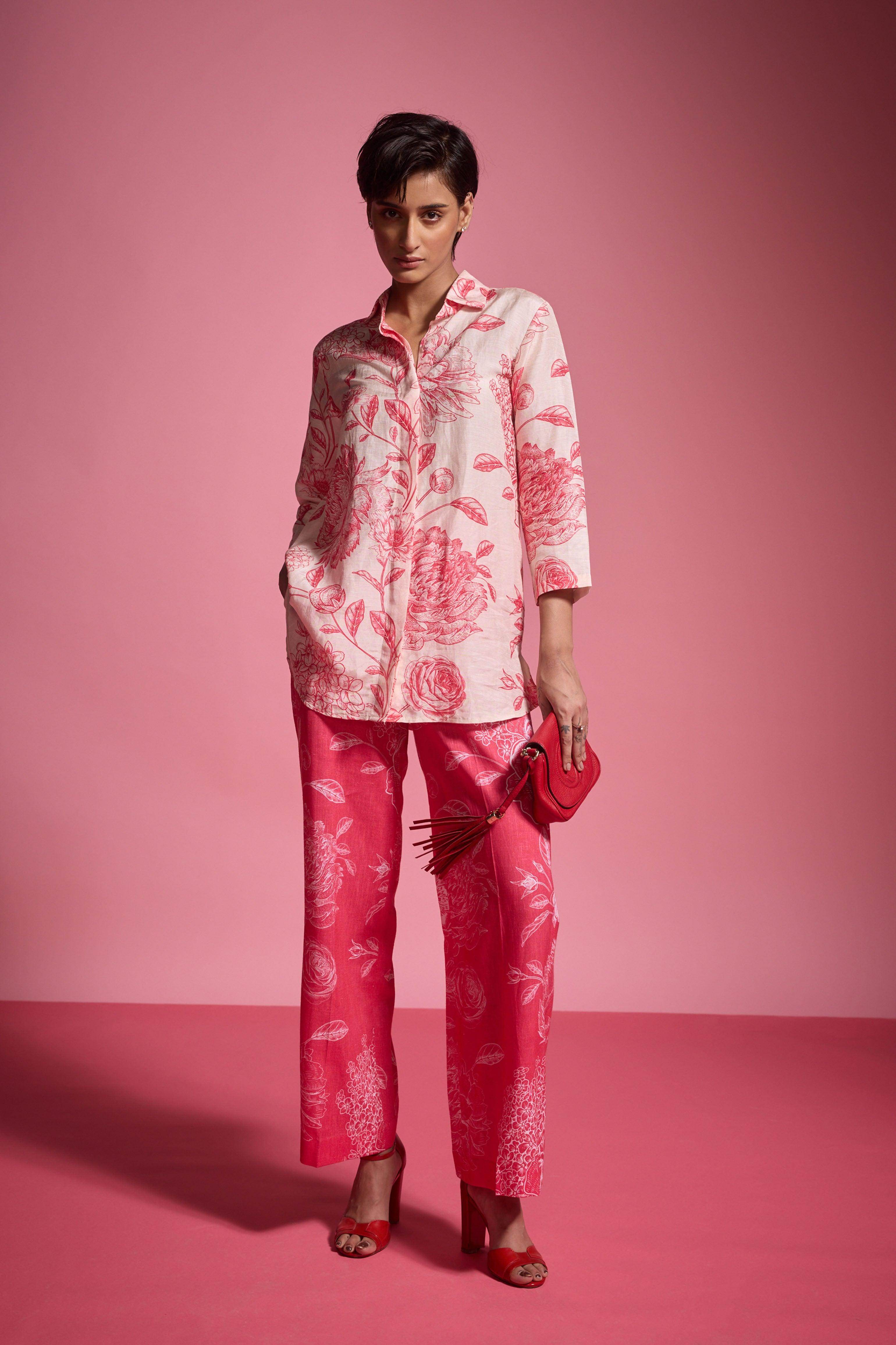 Large-scale red floral print on a soft peach slub textured base. Concealed placket button-down shirt with collar and 3/4 sleeves. Relaxed fit. Made from a natural, breathable linen blend.