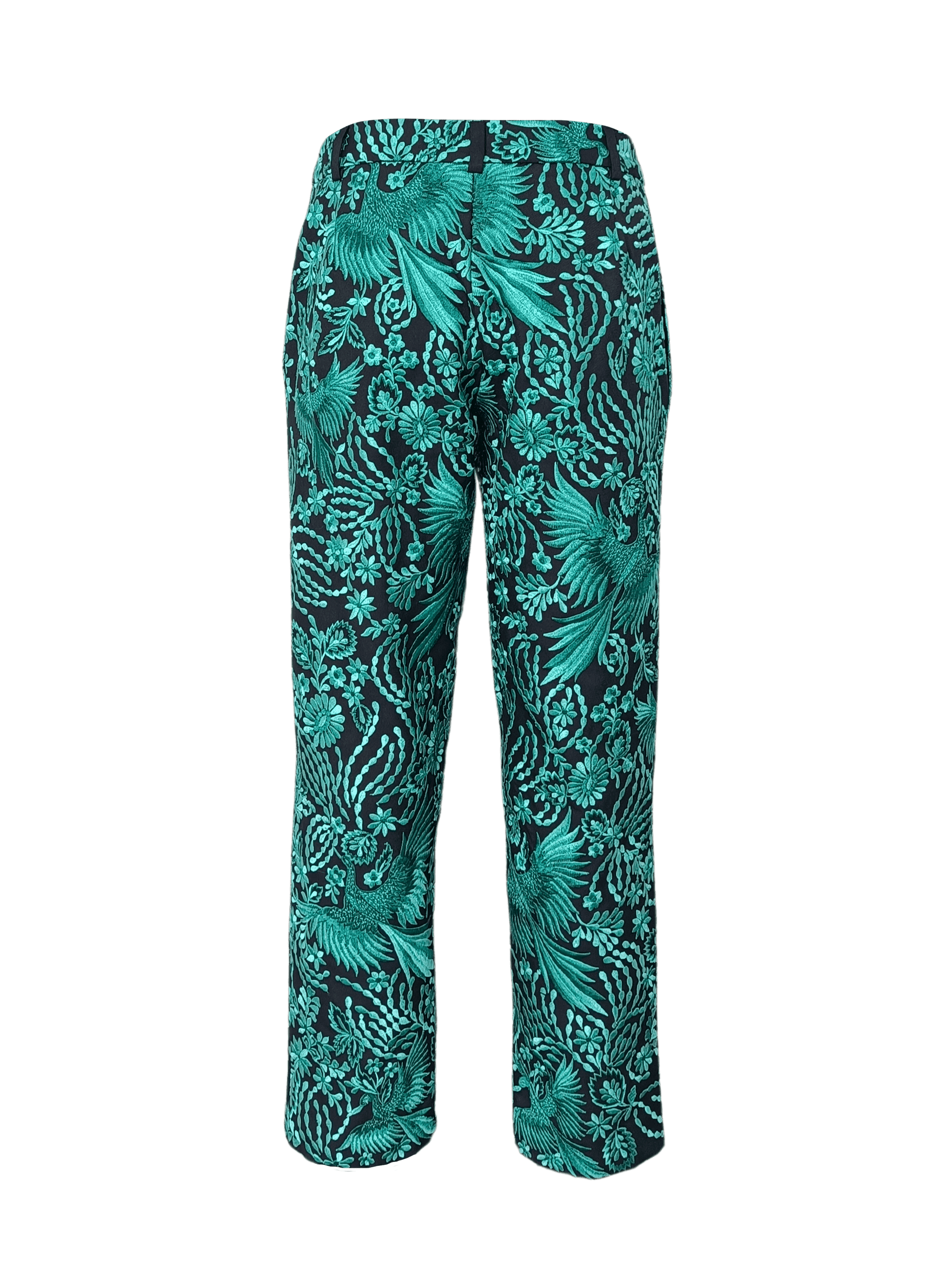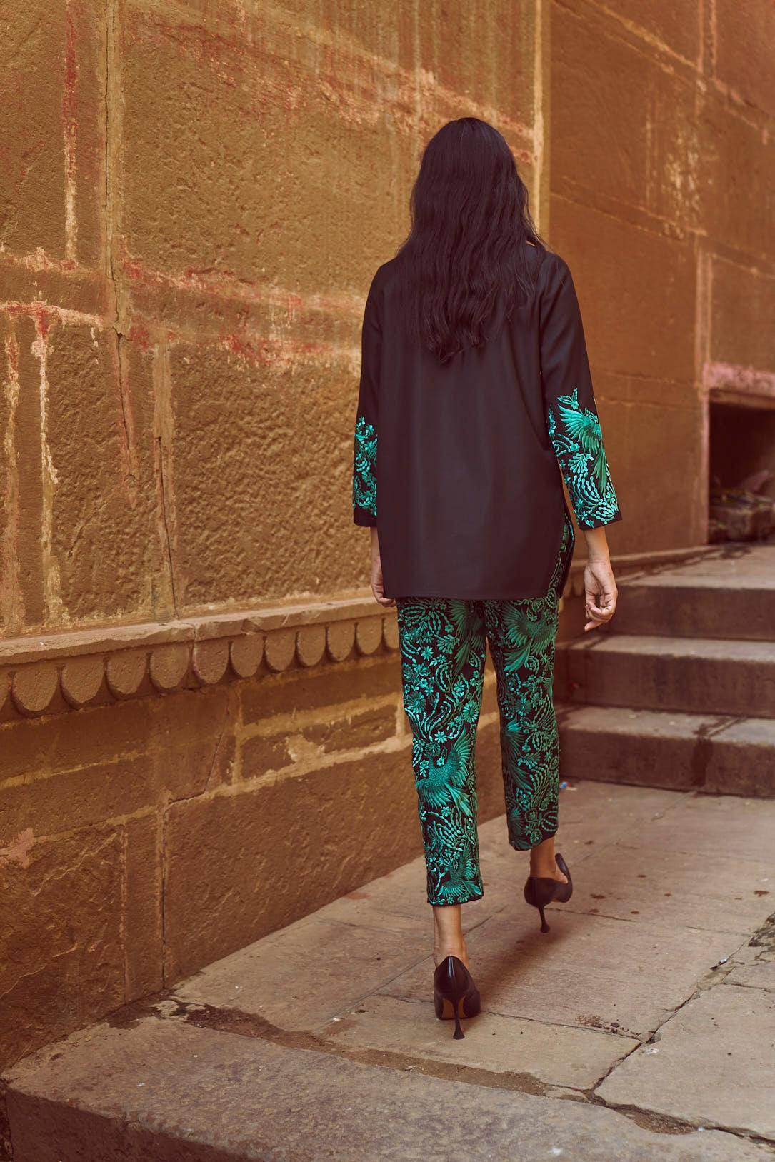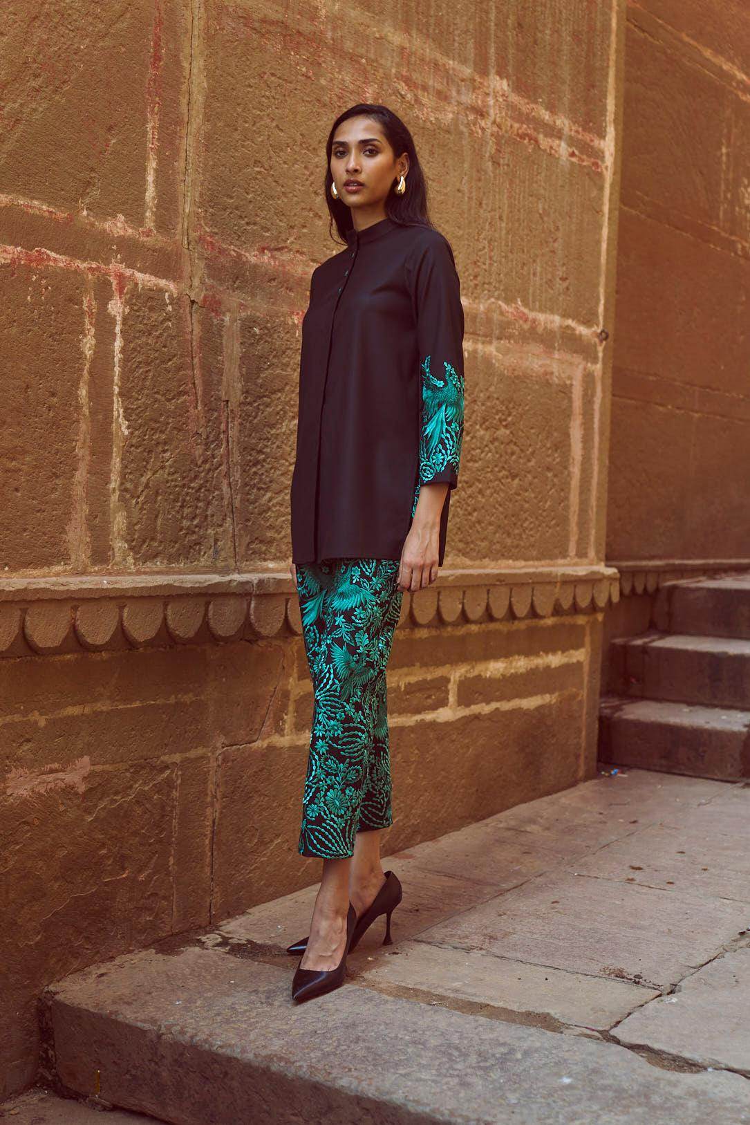 Black tapered fit pants in all over gara stitch inspired embroidery in emerald green. Pockets at the side.Hook and zip closure at the front. Belt loops.
